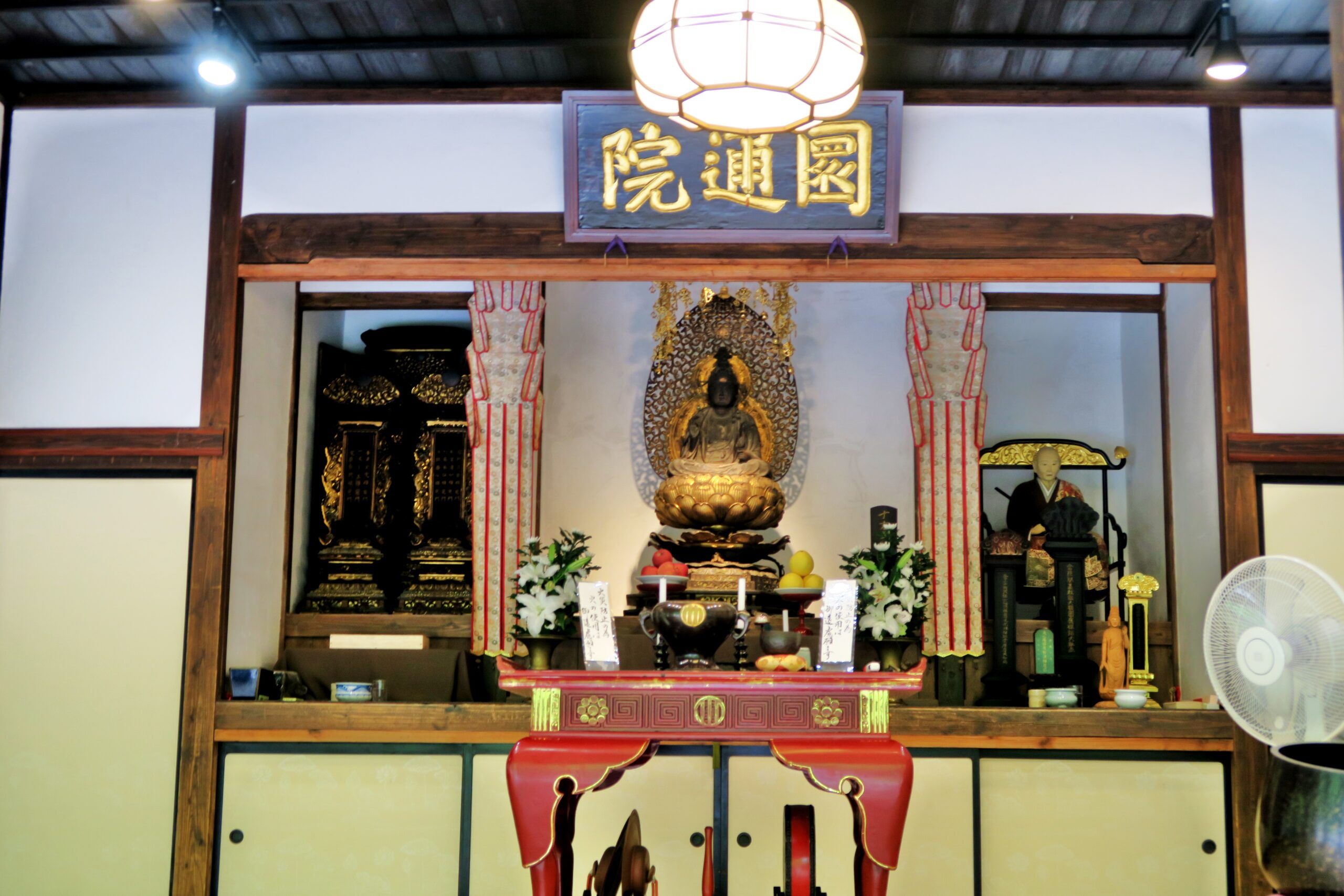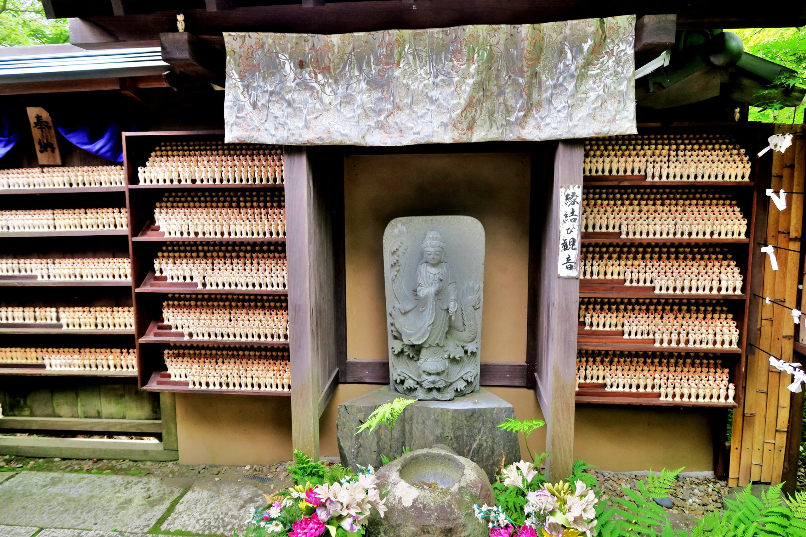出口近くの縁結び観音に手を合わせます。先の3つの赤い橋を渡ったあとに訪れるとご利益があるとか。縁結び観音は竜に乗った観音菩薩で、竜が男性を菩薩が女性を表します。