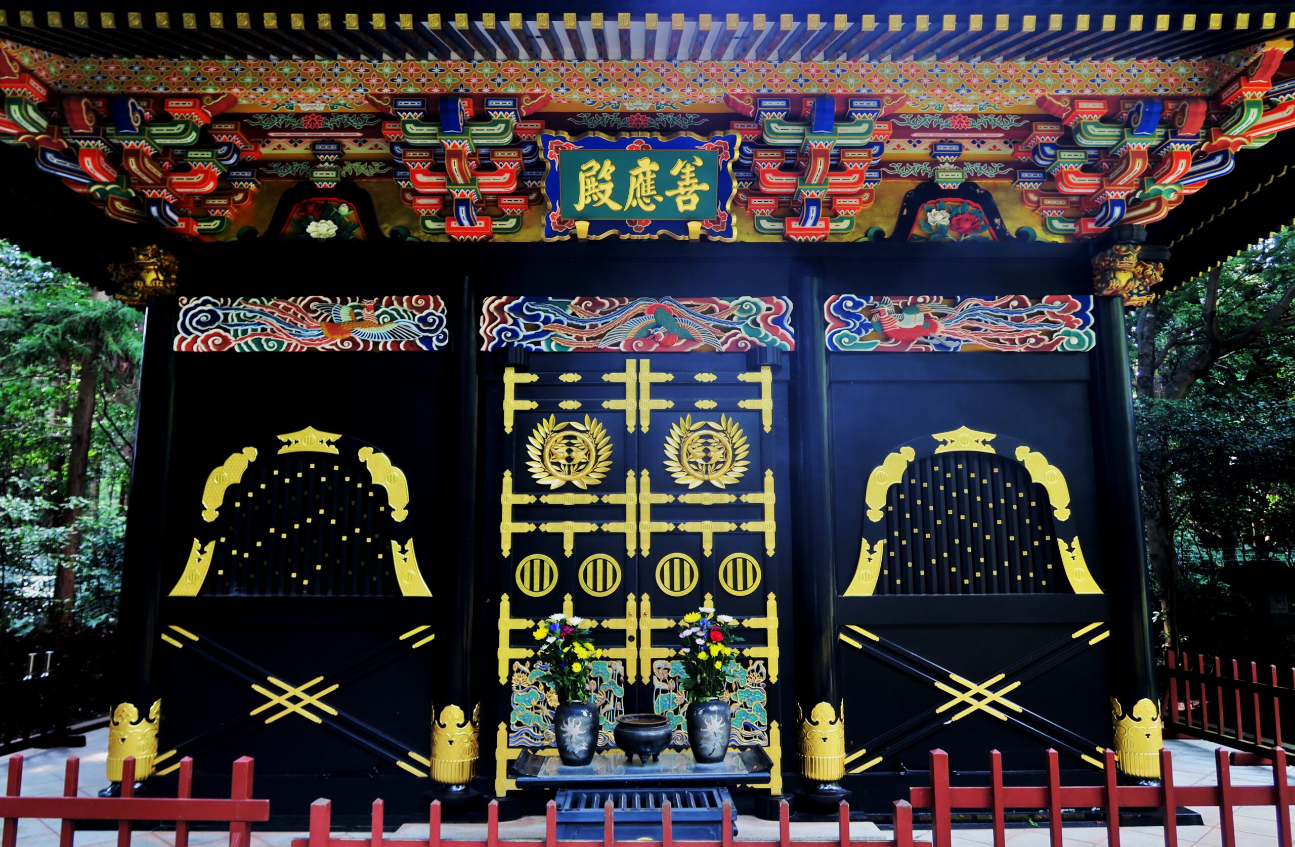 樹齢数百年の青森檜葉を用いて再建され、正面扉上部の蟇股には瑞獣「麒麟」、左右の妻飾には「牡丹と唐獅子」など焼失前と同様の豪華な飾り彫刻が施されています。