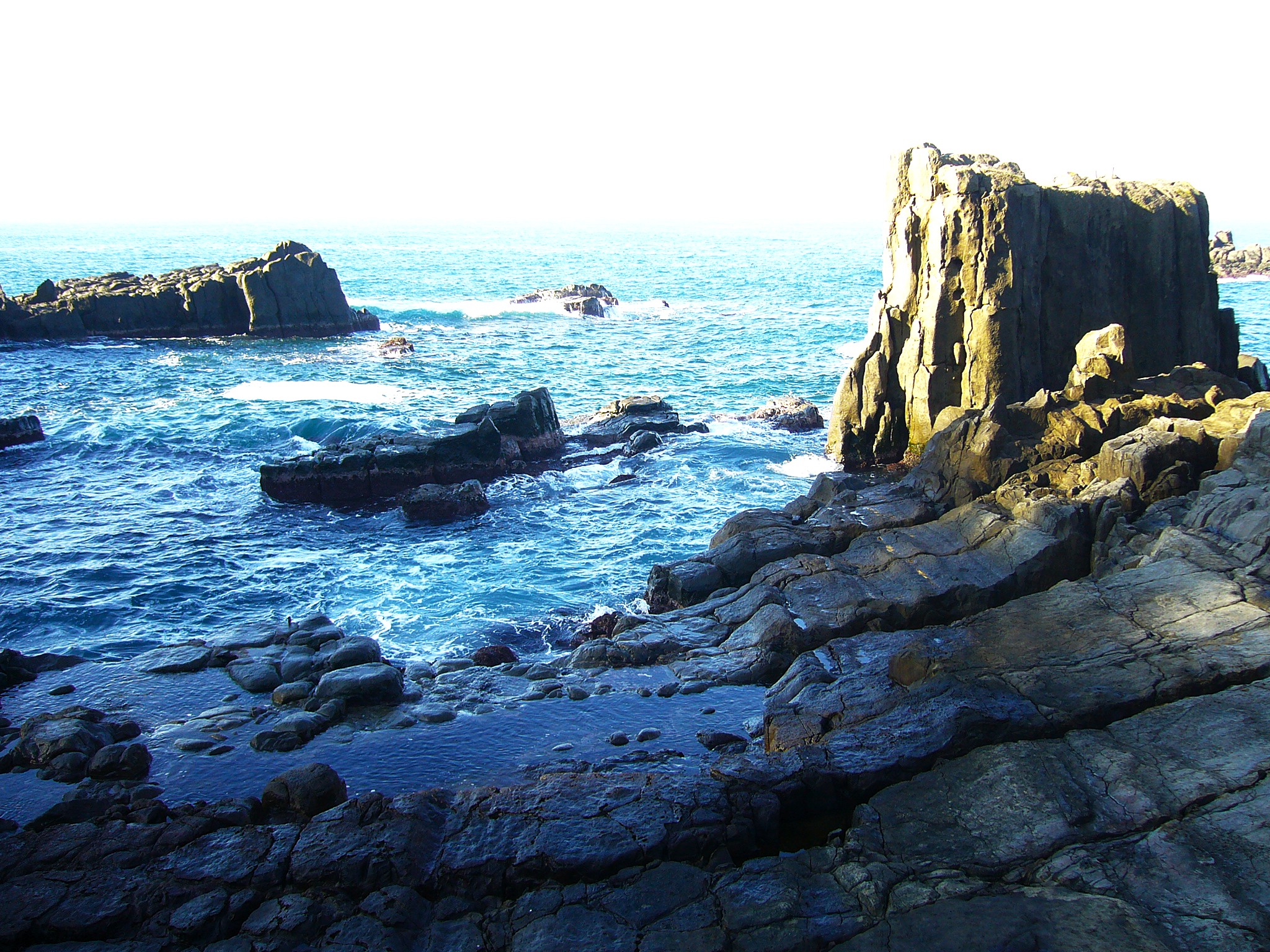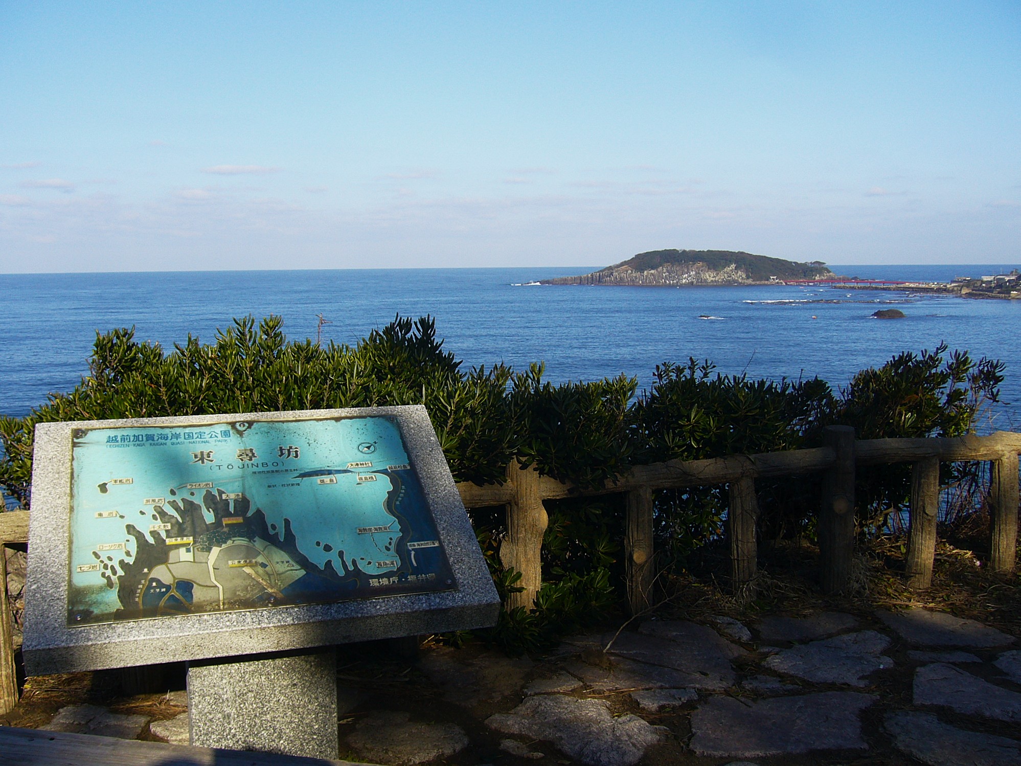 レトロなランドマーク「東尋坊タワー」の上からの眺めもまた一興で、タワーから土産物店や海産物店が並ぶ通りを抜けると断崖上には荒磯遊歩道が4kmほど伸びていて、荒波が打ち寄せる様子を間近に見ることができます。沖合に雄島が見えます。