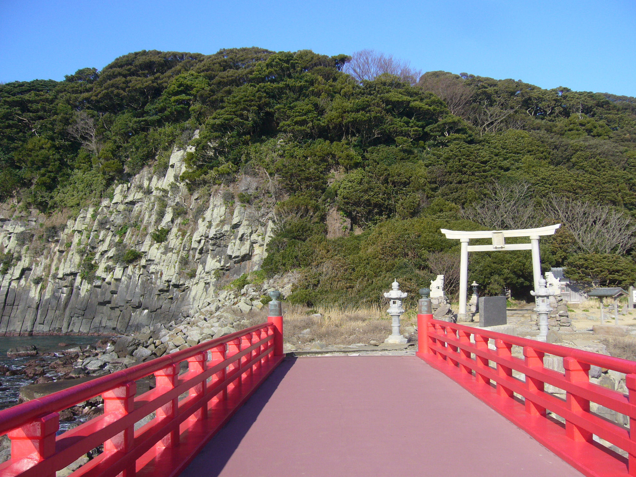 東尋坊の沖合に浮かぶ、古代から神の島と呼ばれている「雄島」は、標高27m・周囲2Kmの小さな島で、約1300万年前に噴出した輝石安山でできた岩石島。224mの朱塗りの橋で島に渡ることができます。島の壁面はゴツゴツとした荒々しい「柱状節理」と呼ばれる地形がむき出しになっています。「乗鯨神来」の伝説は、昔雄島の神様が安島に渡ろうとした際、波(ノタ)に頼んだところ断られ、代わりに鯨が背に乗せて運んだという話が言い伝えられていて、また雄島そのものが鯨の姿だともいいます。