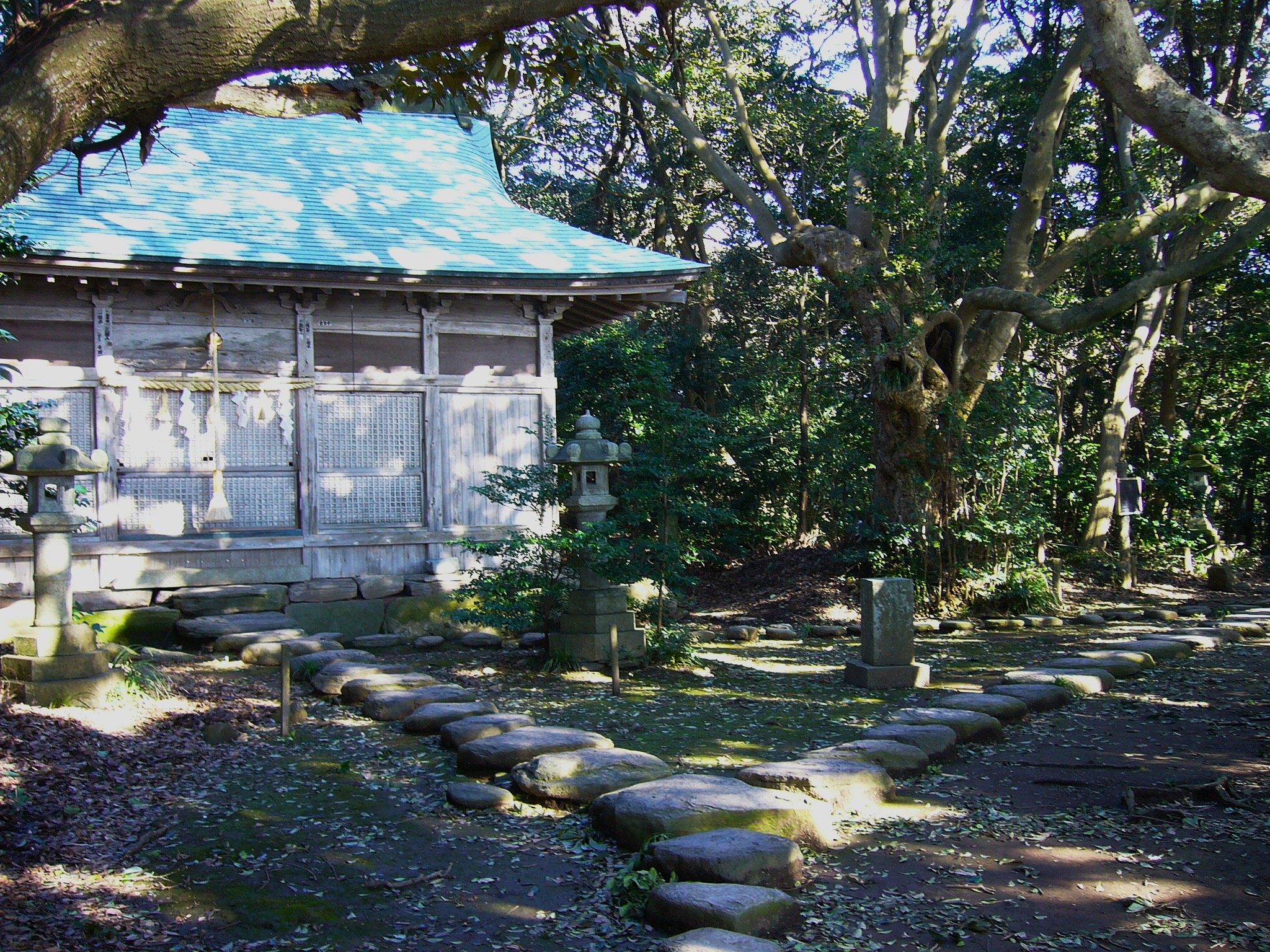 島に渡り78段ある石の階段を上がって時計回りに進み、神社へと続く大粒の敷石が地面に埋められた参道を歩くとヤブニッケイの樹木に覆われたその奥に大湊神社が静かに鎮座しています。ここは航海や漁業の守護神として信仰されてきた神社で、伊邪那岐命を祀っています。永禄年間(1558~1569)には、戦国大名・朝倉義景が一門の祈願所と定めましたが天正年間(1573~1591)に織田信長の兵火により社殿は焼失したという歴史があります。現在の本殿は江戸時代の福井藩2代藩主・松平忠直が再建したものです。