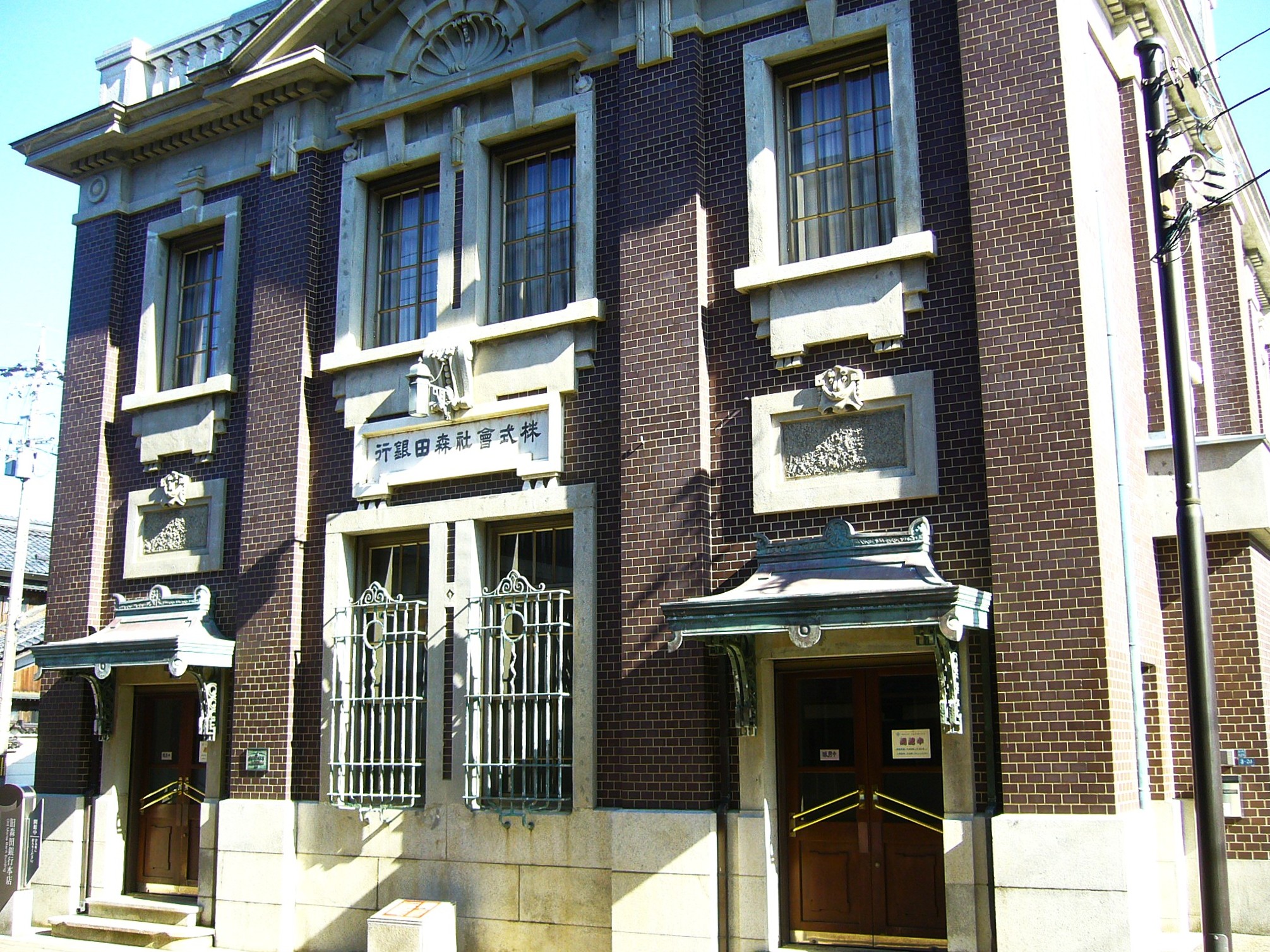 三国湊きたまえ通りの南、町家の中に現れるレトロモダンな建物は、三国湊を代表する廻船問屋の豪商・森田家が、北前船の衰退後いち早く金融業へと転じ、明治27年(1894)に創業した「旧森田銀行本店」です。銀行経営は成功し、大正9年(1920)にこの建物が新しい銀行本店として建てられ、昭和46年(1971)まで営業していた大正モダンで優美な雰囲気を漂わせる洋館です。設計はパリ万博日本館の設計者山田七五郎氏が手掛けたもの。東京駅や日本銀行本店など古き良き日本を代表するスタイルの“辰野式”の流れを汲み、横浜市開港記念館を手掛けるほどの大物設計師でしたが、森田氏が横浜で倉庫業を営んでいた縁で依頼を受けることになりました。県内に現存する最古の鉄筋コンクリート造建造物で、左右対称の外観は西欧の古典主義的デザイン・ルネサンス形式で外壁は一見レンガ作りだが実はタイル張り。