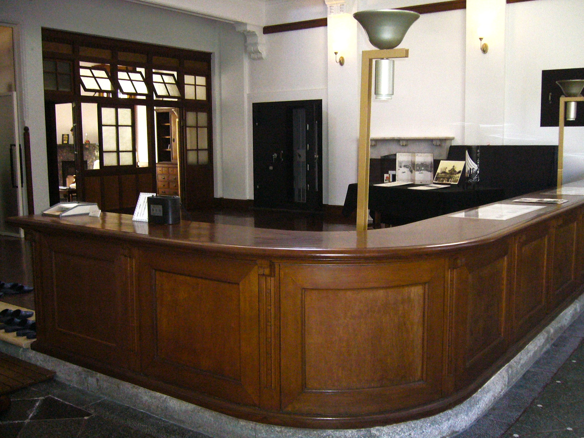 森田銀行は、その後福井銀行と合併し、近年まで福井銀行三国支店として営業されていたとのことで、カウンターの長さ7mものケヤキの一枚板は見事であり、マーブル仕上げのエンタシスが左官仕事とは驚きです。