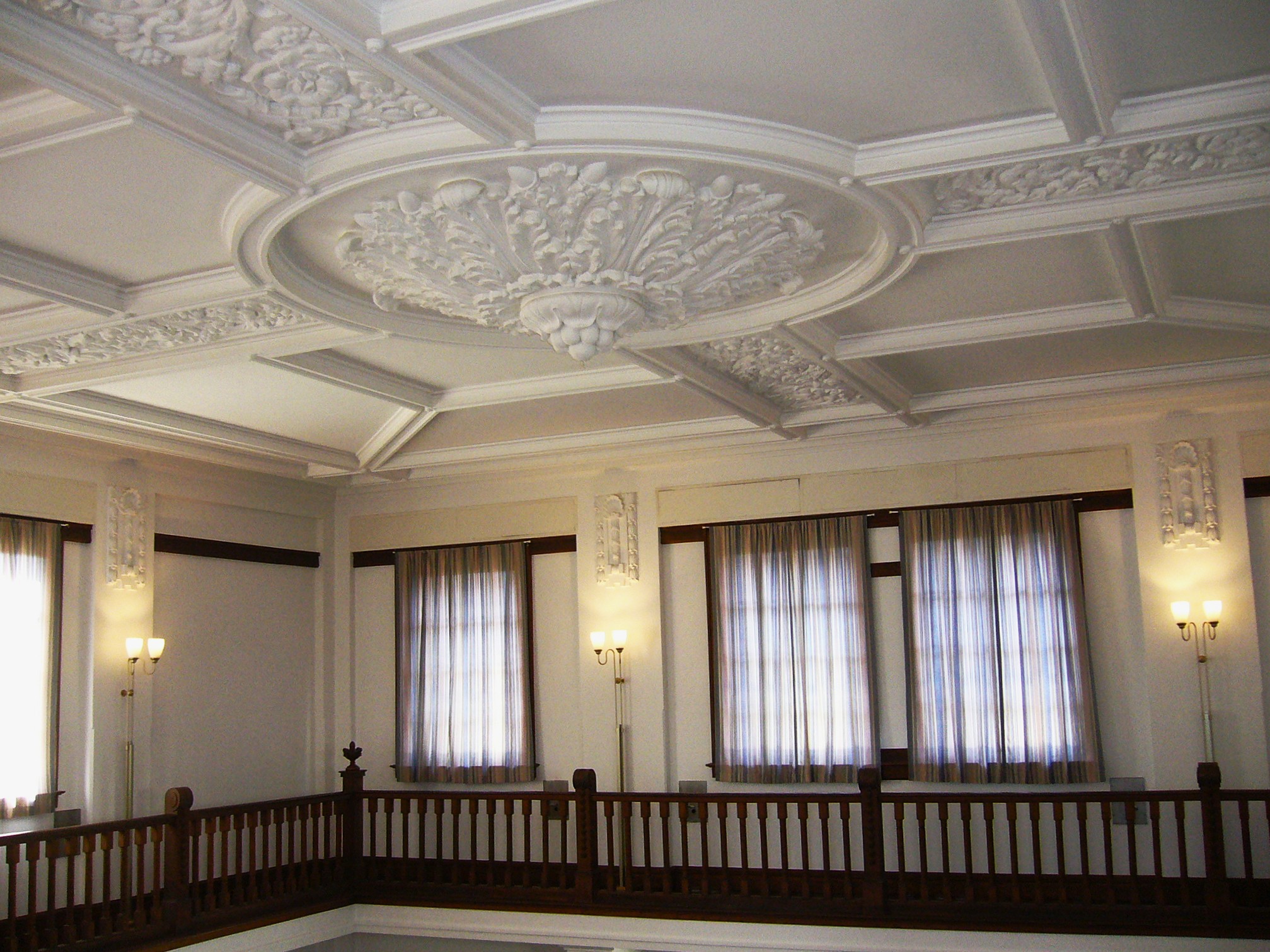 建物の内部はディテールにまでこだわった洗練されたもので、天井や壁に見事な漆喰装飾や象嵌細工が施されたレトロ建築です。細部のデザインや技術にこだわりが見られ、一階の重役室は窓枠の象嵌や戸棚の七宝焼きなどモダンな装飾が残っています。特に漆喰壁に豪華な装飾を施した館内は見ものです。