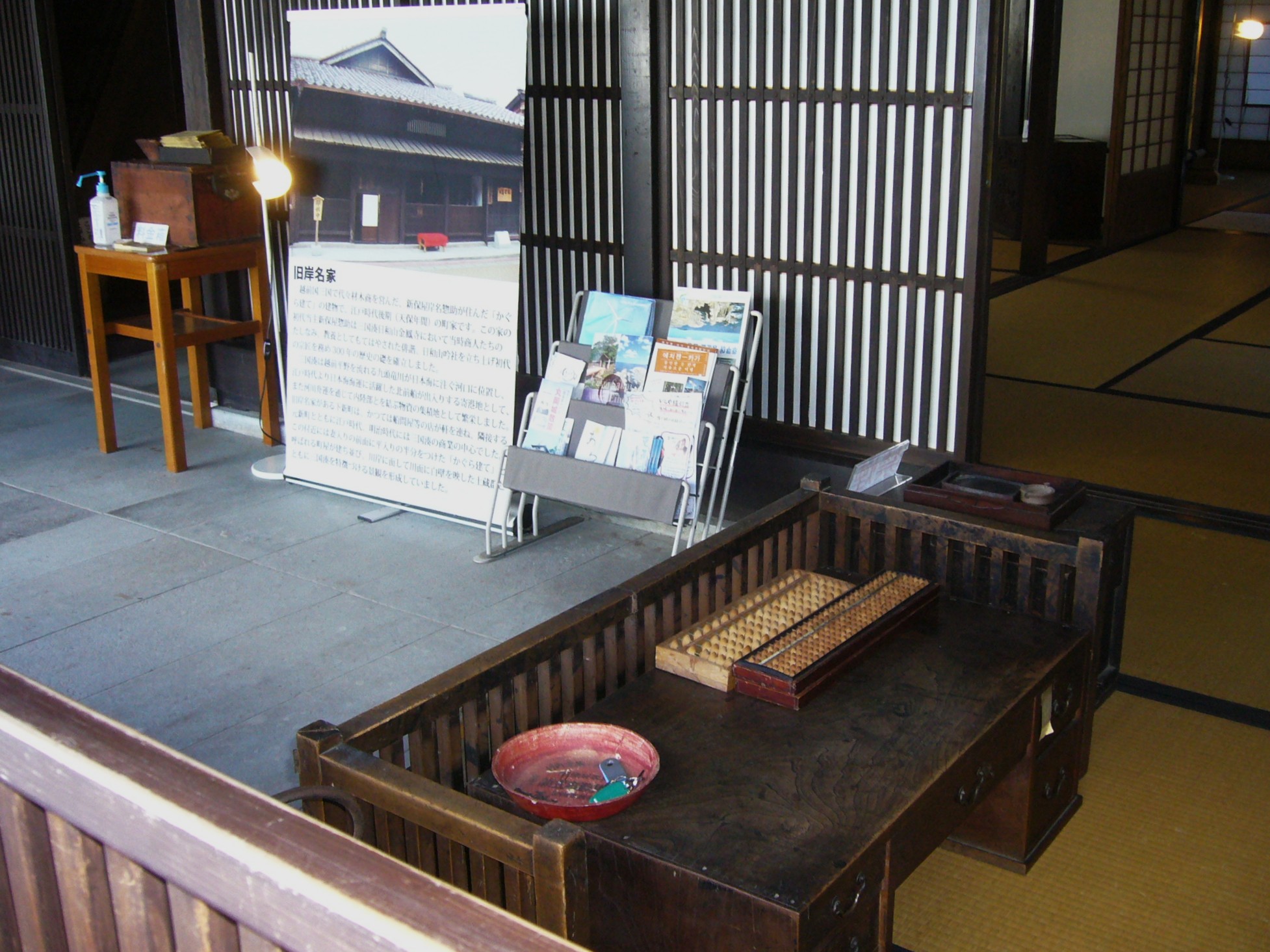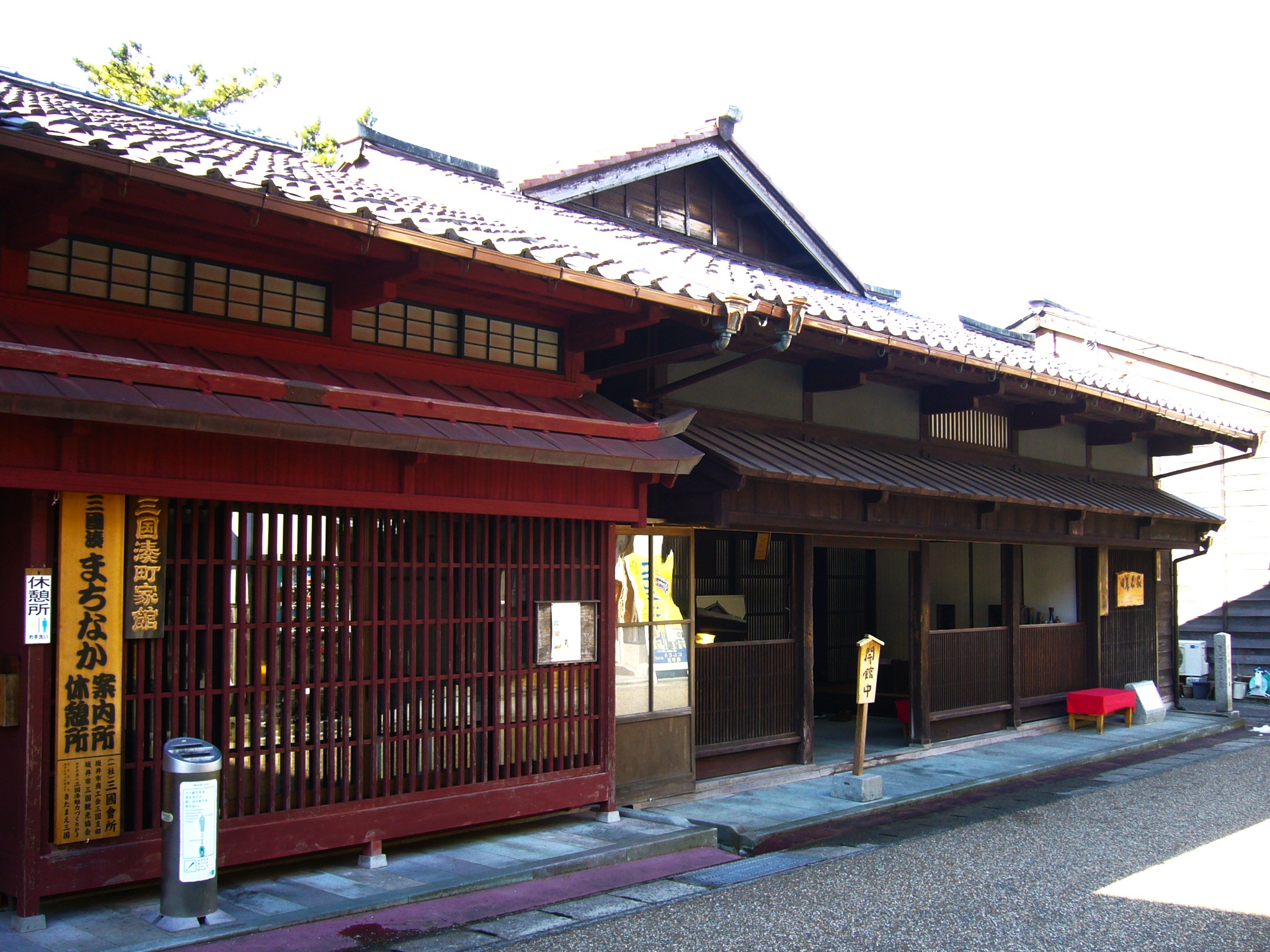 江戸時代から残る町家「旧岸名家住宅」は、材木商で栄えた新保屋岸名惣助が代々住んでいた江戸後期に建てられた町家の自宅を復元しています。妻入屋根と平入屋根を組んだかぐら建てという正面から見ると平屋に見える三国独特の建築様式です。かつては川の船着き場に面していた裏口から、通り庭といわれる長い土間が屋敷を貫いています。そこを荷を積んだ大八車が行き来したといい、当時の活気が目に浮かびます。並びの三国湊町家館は、ベンガラ格子が印象的だった旧梅谷家を改築した建物です。