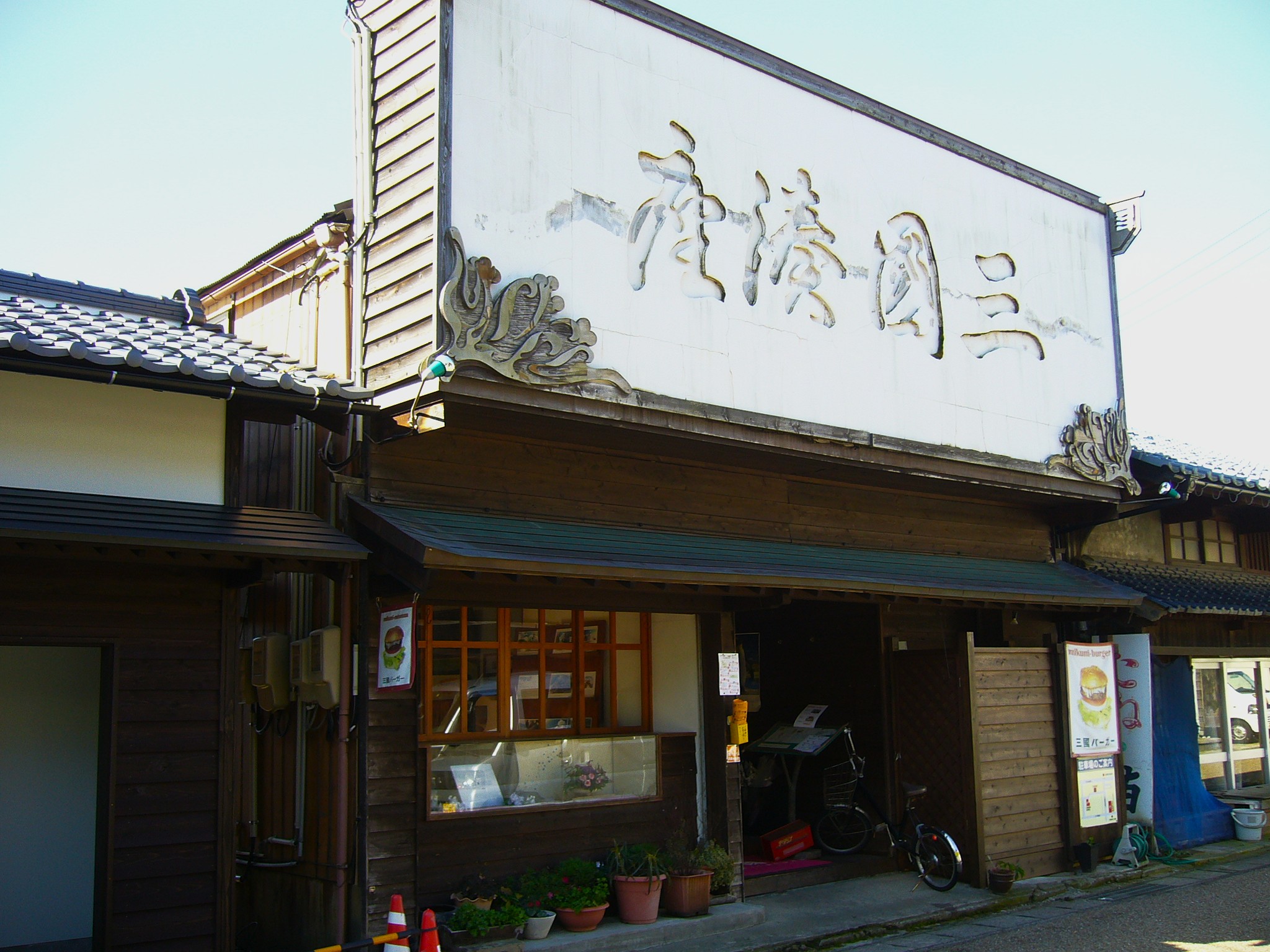 海岸線の大通りを1本入った「三国湊きたまえ通り」は、えちぜん鉄道三国駅から海を見ながらメイン通りを下ること約5分。海風が感じられるほど近い場所にあり、今や新たな観光地として人が集まるエリアです。三国散策の観光拠点の「三国湊座」で観光パンフレットを頂き、グルメやイベント情報を入手します。かつて存在した芝居小屋「三国座」と「みなと座」をイメージした情報発信地です。観光案内所の中にカフェスペースを併設。最近ご当地バーガーとして、三国特産の花ラッキョウを挟んだ「三国バーガー」が評判を呼んでいます。