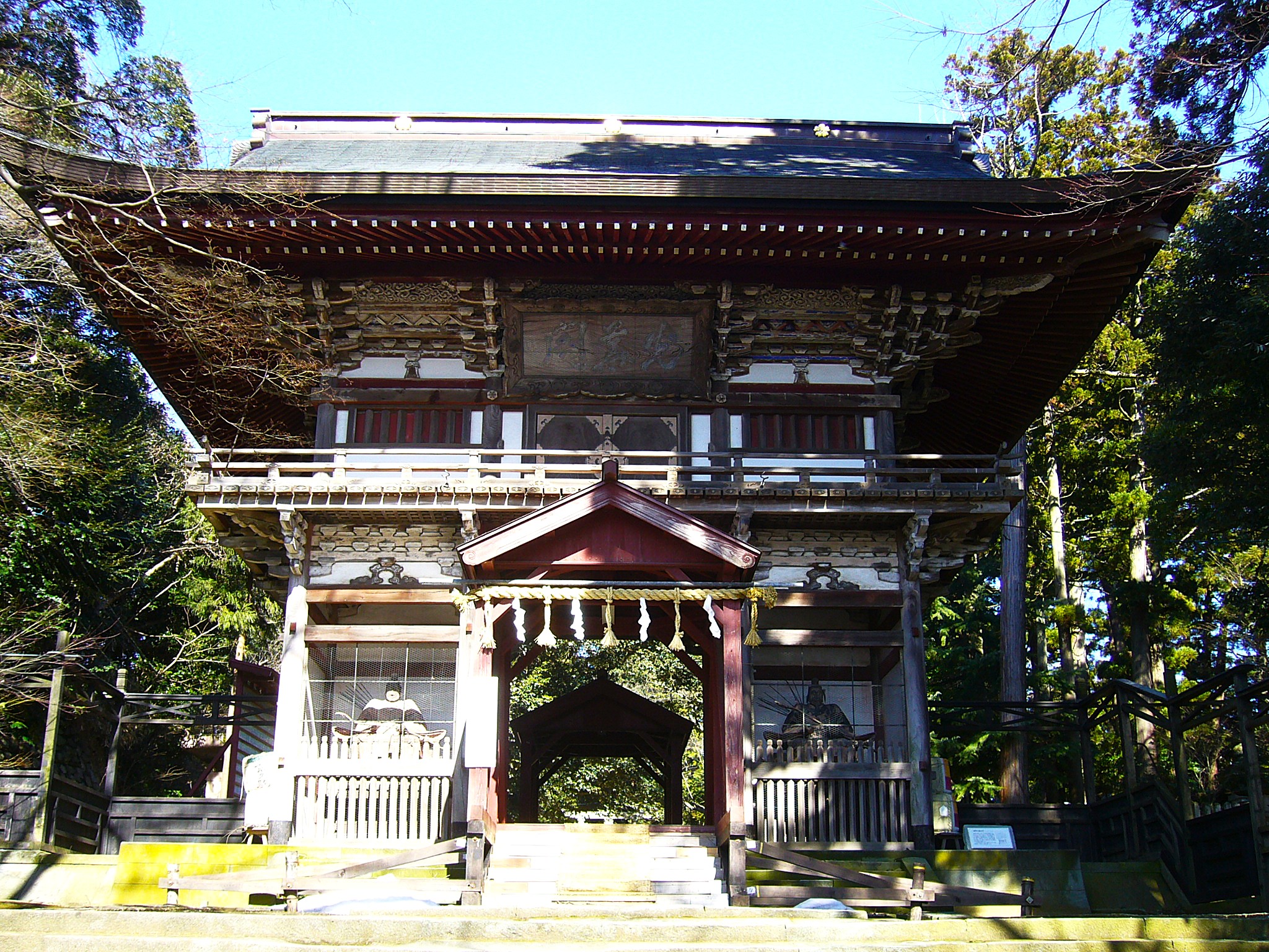 ケヤキや杉の巨木に囲まれた境内には、和洋天竺唐様の隋身門、鳳凰や猿の彫刻が目を引く拝殿があり、荘厳な雰囲気が漂う。祭神は大山咋命と継体天皇。