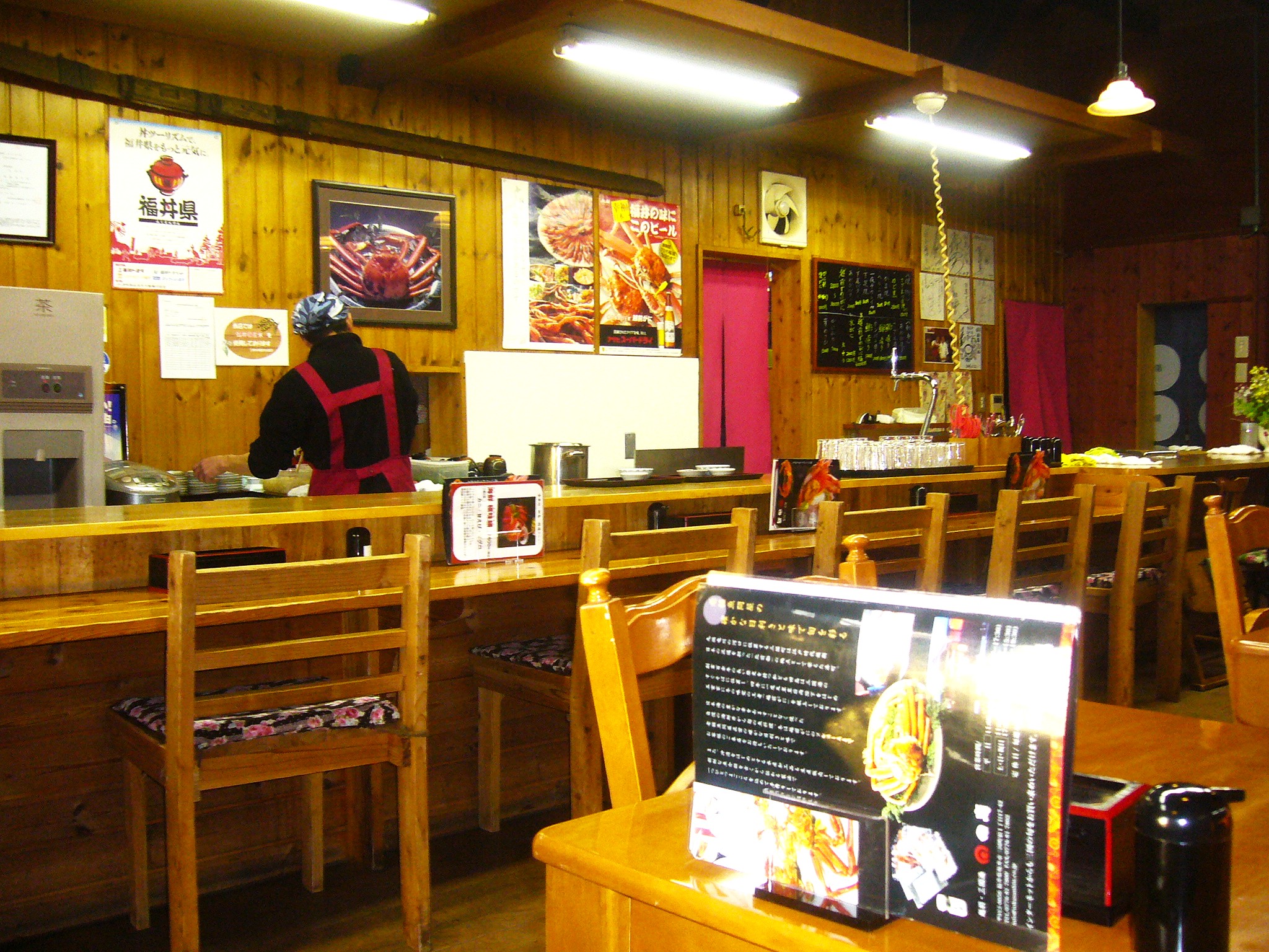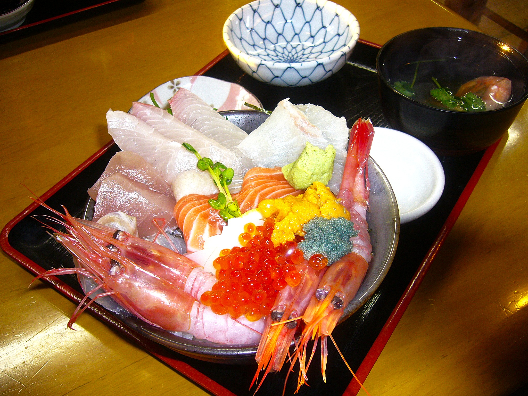 とれたての福井の幸を贅沢に使った料理が自慢。自慢の海鮮丼は旬の魚介が日替わりで盛り込まれるので何がのるかは開けてびっくり玉手箱である。本日は甘エビ4尾にうに、いくら、甘エビの卵、ヒラメ、くるま鯛にぶり、まぐろ、サーモン等11種ほどの旬のネタを豪快にのせたボリューム満点の海鮮丼でした。冬の越前ガニは有名ですが、三国港であがる新鮮なホッコクアカエビ(通称甘エビ)は甘さと食感が最高です。