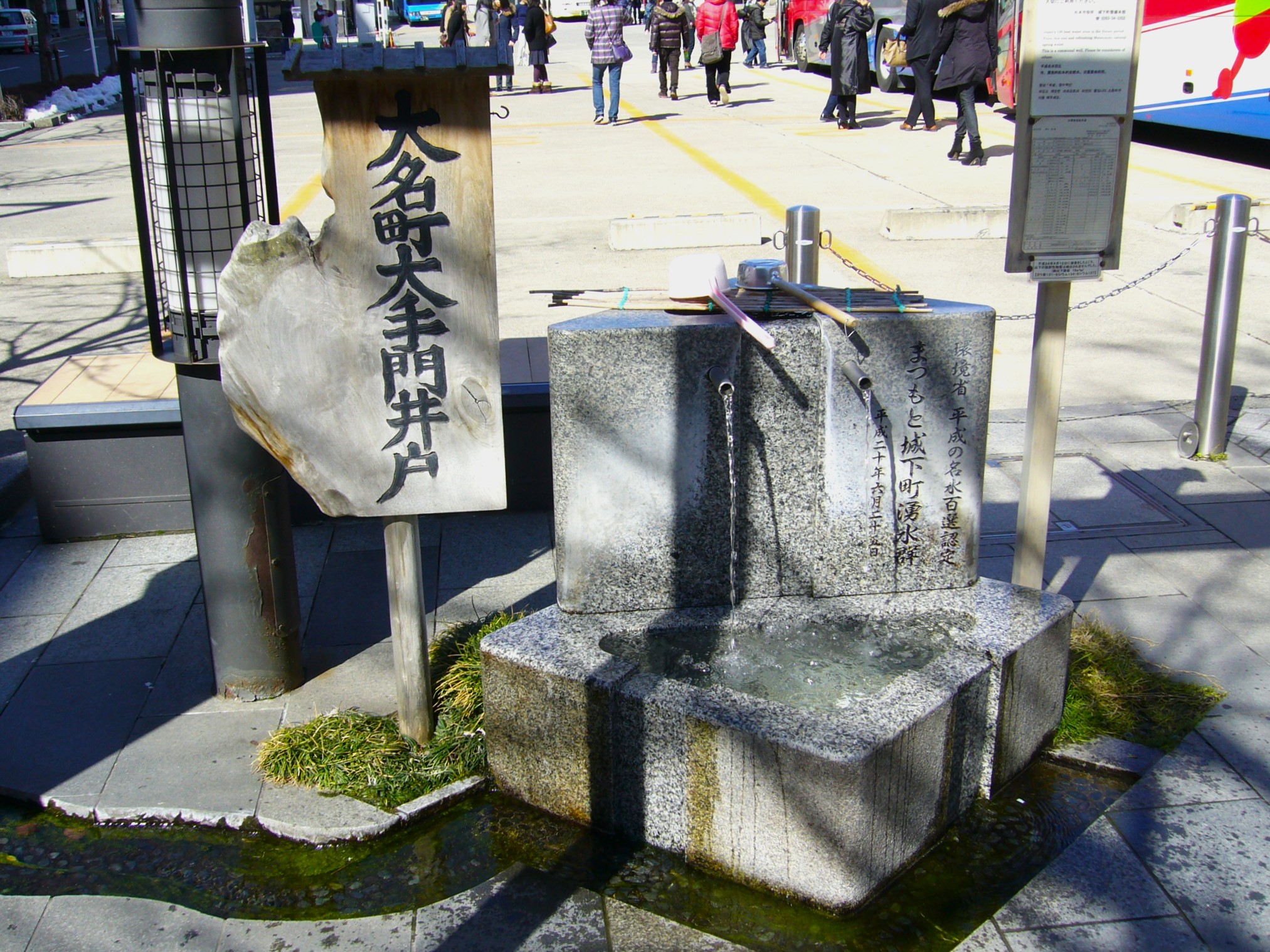 松本信用金庫敷地内にあり、市役所大手事務所前にあるのが、平成21年に整備された一見五角形のような写真の「大名小路井戸」です。このあたりはお城の三の丸だったところです。松本に近代的な上水道が整備されたのは大正13年(1924)ですが、元禄年間にはお玉の池を水源として木管を埋め、早くから城下町に水道が引かれていたといいます。
