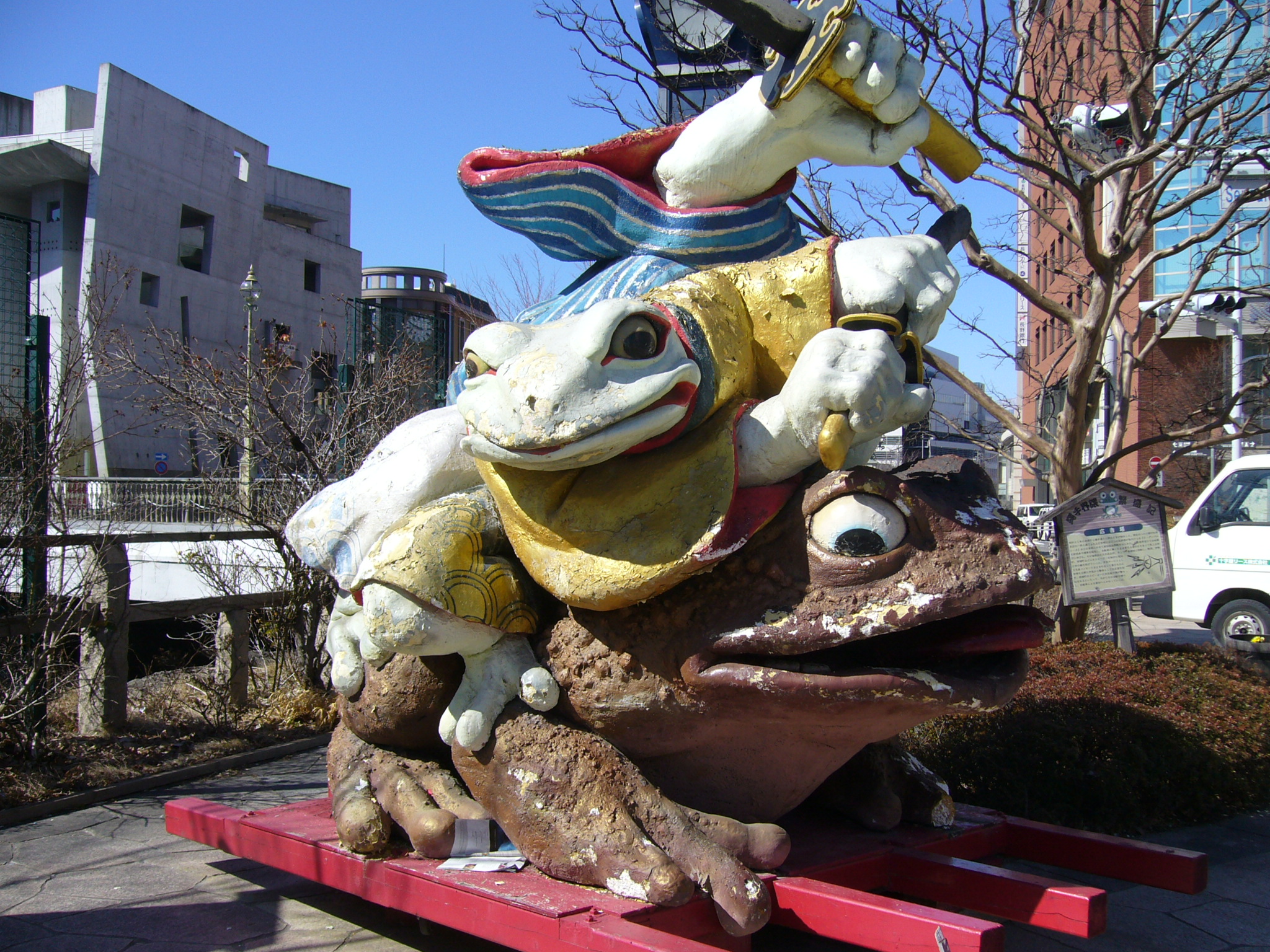 松本駅までは、中の橋を渡って「ナワテ通り」を歩いて戻ります。縄手の町名は松本城の南惣堀と女鳥羽川の清流にはさまれた縄にように細く長い土手に由来しています。市民に親しまれている四柱神社が明治12年に建立されてからは、その参道として発達してきました。名鳥羽川沿いに延び、昭和の風情を残した通りで、城下町らしい町の雰囲気とは少し異なります。せんべいや鯛焼きなどの店があり、町屋風の町並みには庶民的な雰囲気が漂います。千歳橋側の入口にはナワテ通りのシンボル「ガマ侍」のオブジェが据えられています。千歳橋(旧大手橋)の屈曲は、ここに大手門枡型があった名残です。
