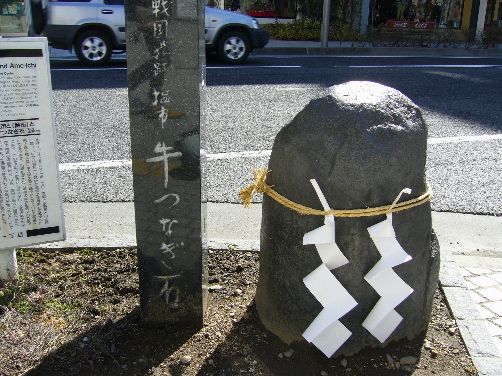 千歳橋袂から本町通りを南に牛つなぎ石を見て松本駅でゴールです。高さ70~80cmほどの石で、戦国時代、武田信玄の軍が塩不足に陥り、敵方の上杉軍が塩を送ってきた時に、塩を運んできた牛をつないだといわれる伝説の石です。