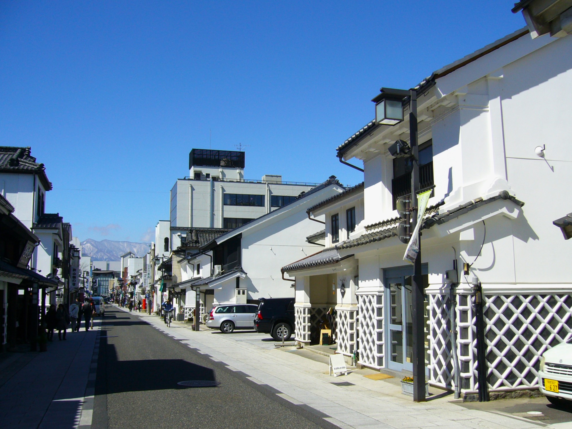 なまこ壁が松本商人の町らしさを引き立てる蔵作りで統一された家並みの中町通りに出ます。江戸末期から明治にかけて南深志一帯が大火に見舞われ、火災対策として再建された建物が松本の土蔵造りです。「なまこ壁」という、平瓦を並べて継ぎ目に漆喰を盛り上げる工法による白ち黒の模様が美しい壁が続く。