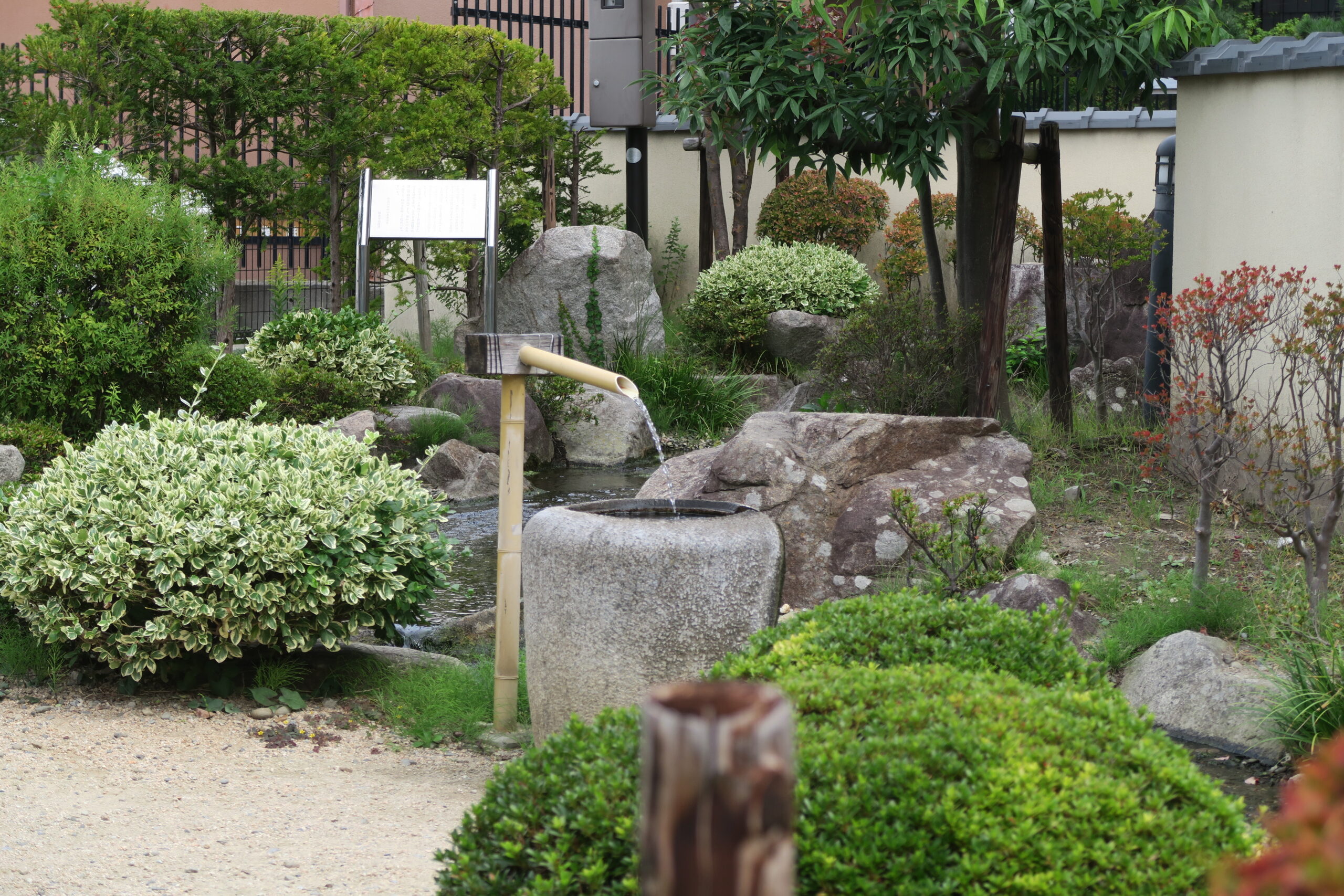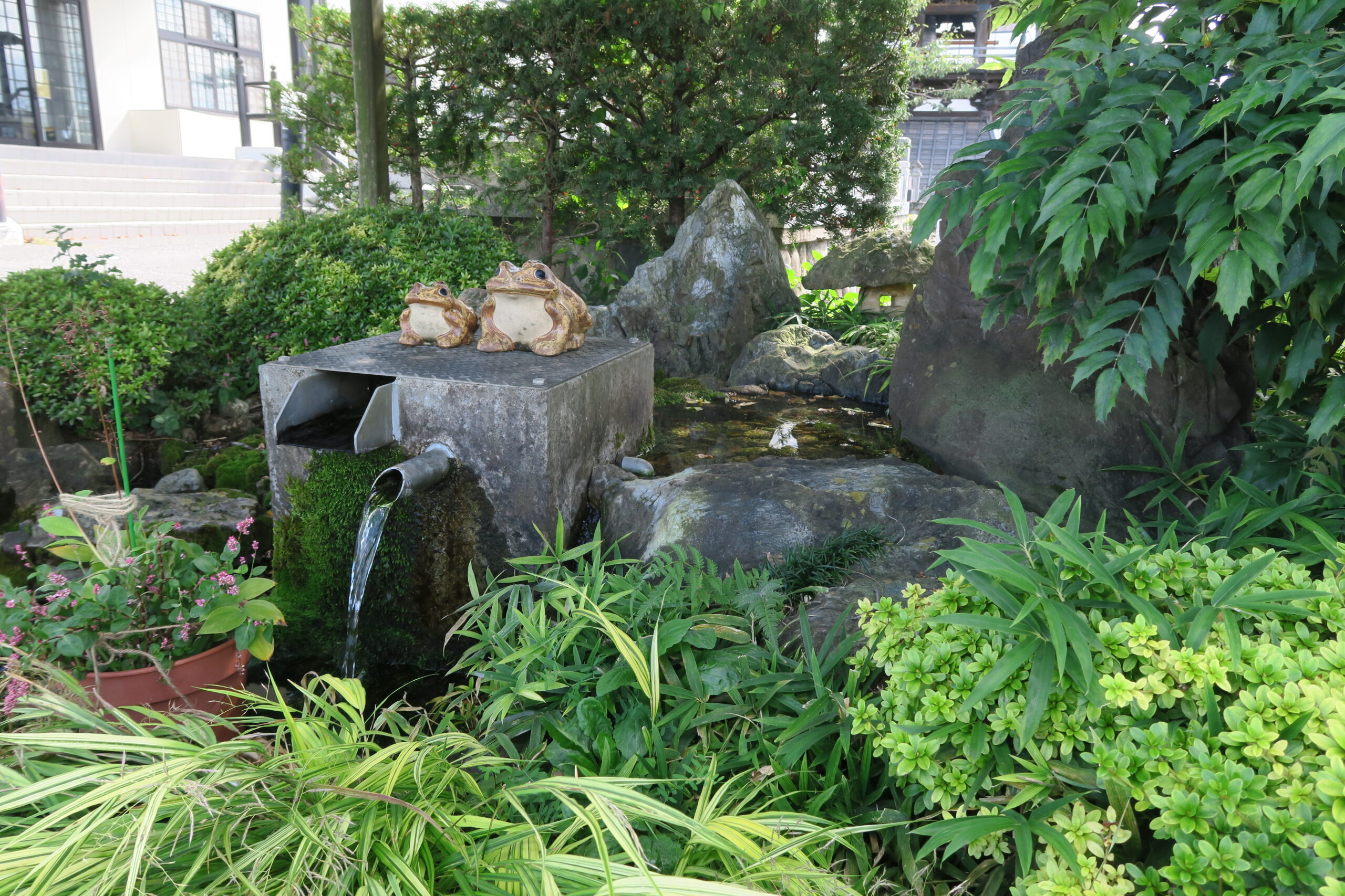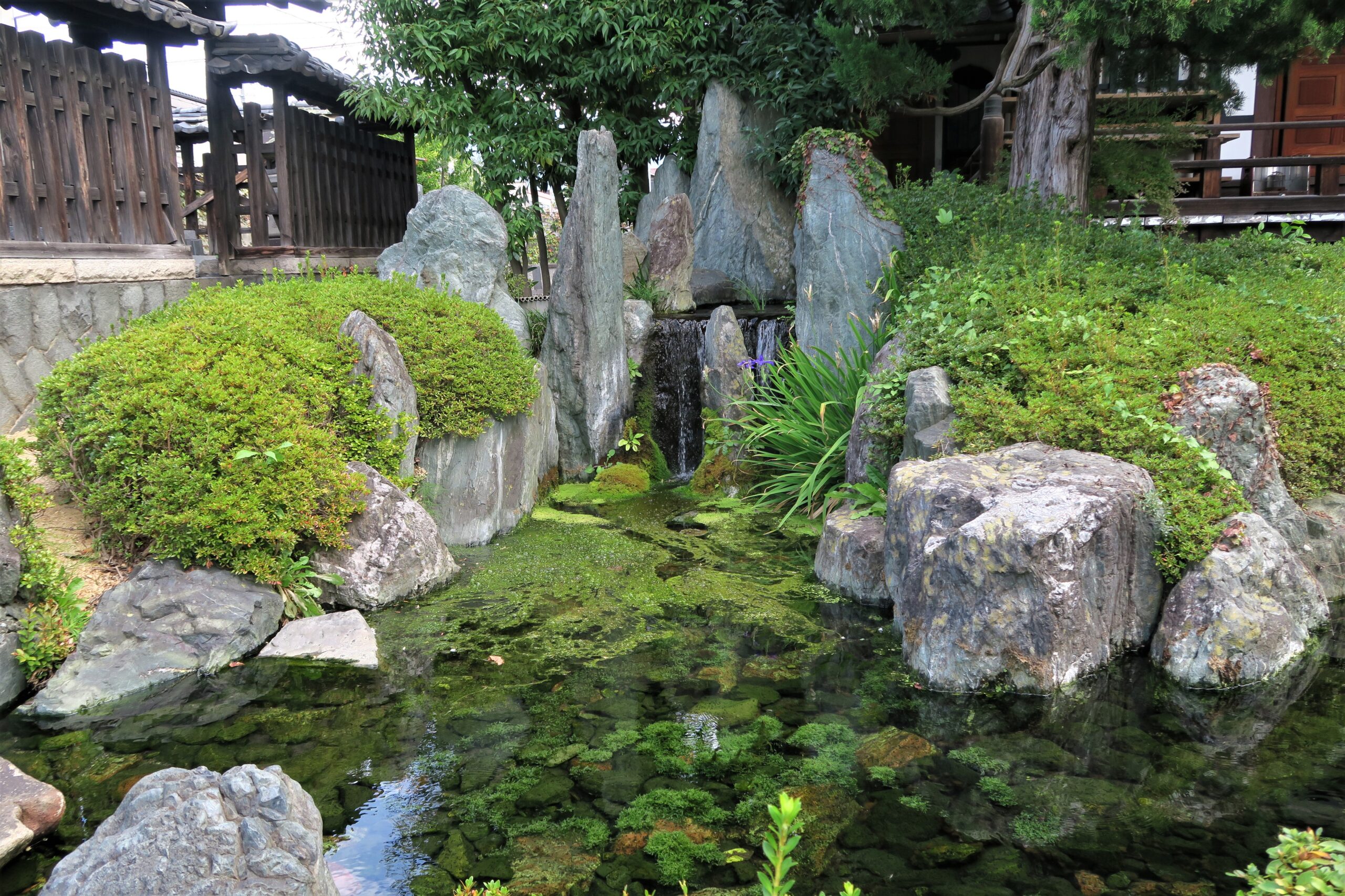 大橋通りを跨ぎ、日の出通りを歩きます。途中南に右折し、井戸ではありませんが「龍興寺の清水」を見学します。龍興寺は、日蓮宗のお寺で松本城保存の功労者・小林有也の墓があります。本堂前の細長い池泉庭園は青石を立てた滝石組。水落石に沿って細い立石を立てているには鯉魚石といい、いわゆる鯉の滝登りを表現していて、禅の修行に見立てています。鯉魚石のある滝石組は龍門瀑と呼ばれています。