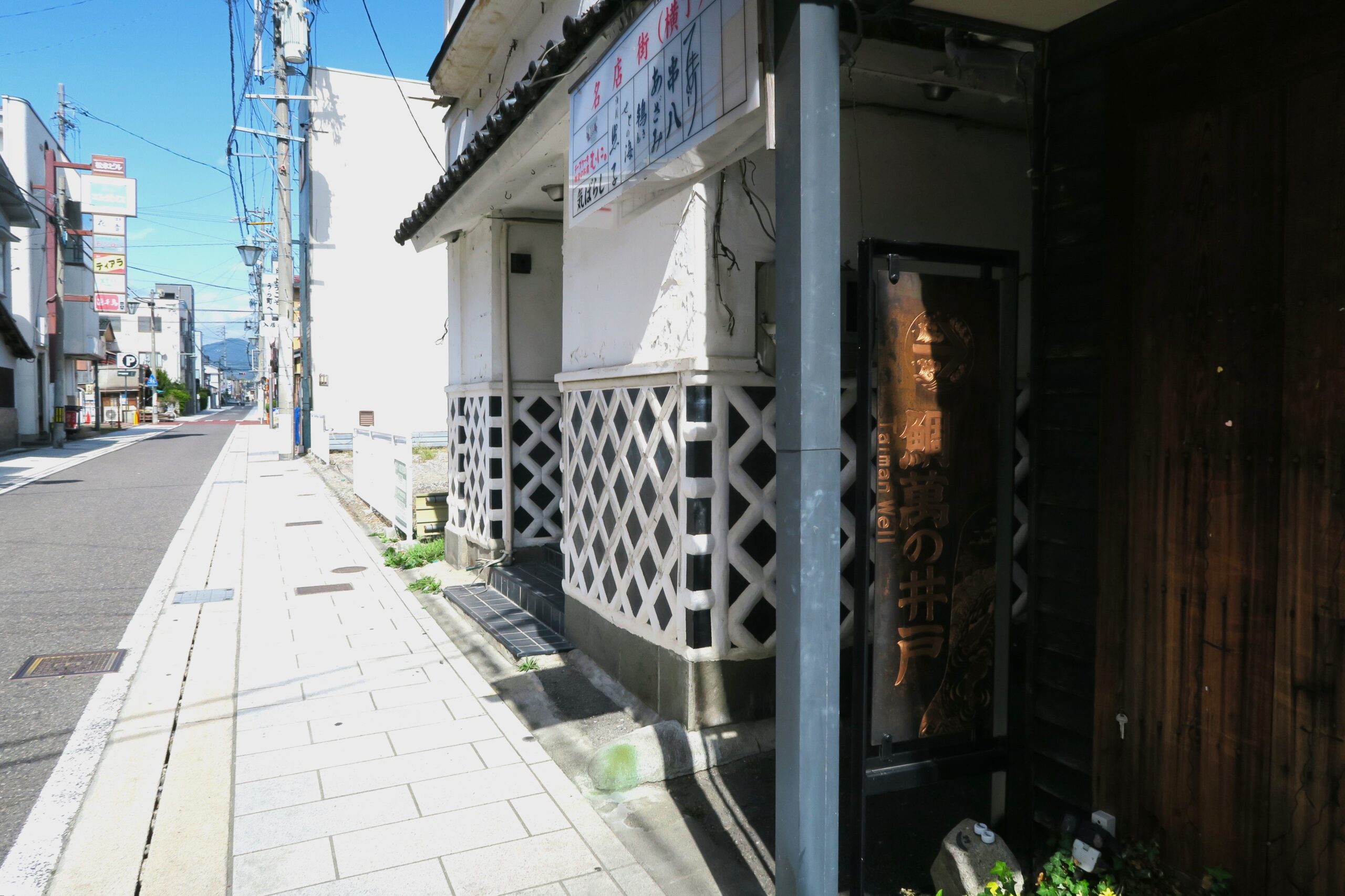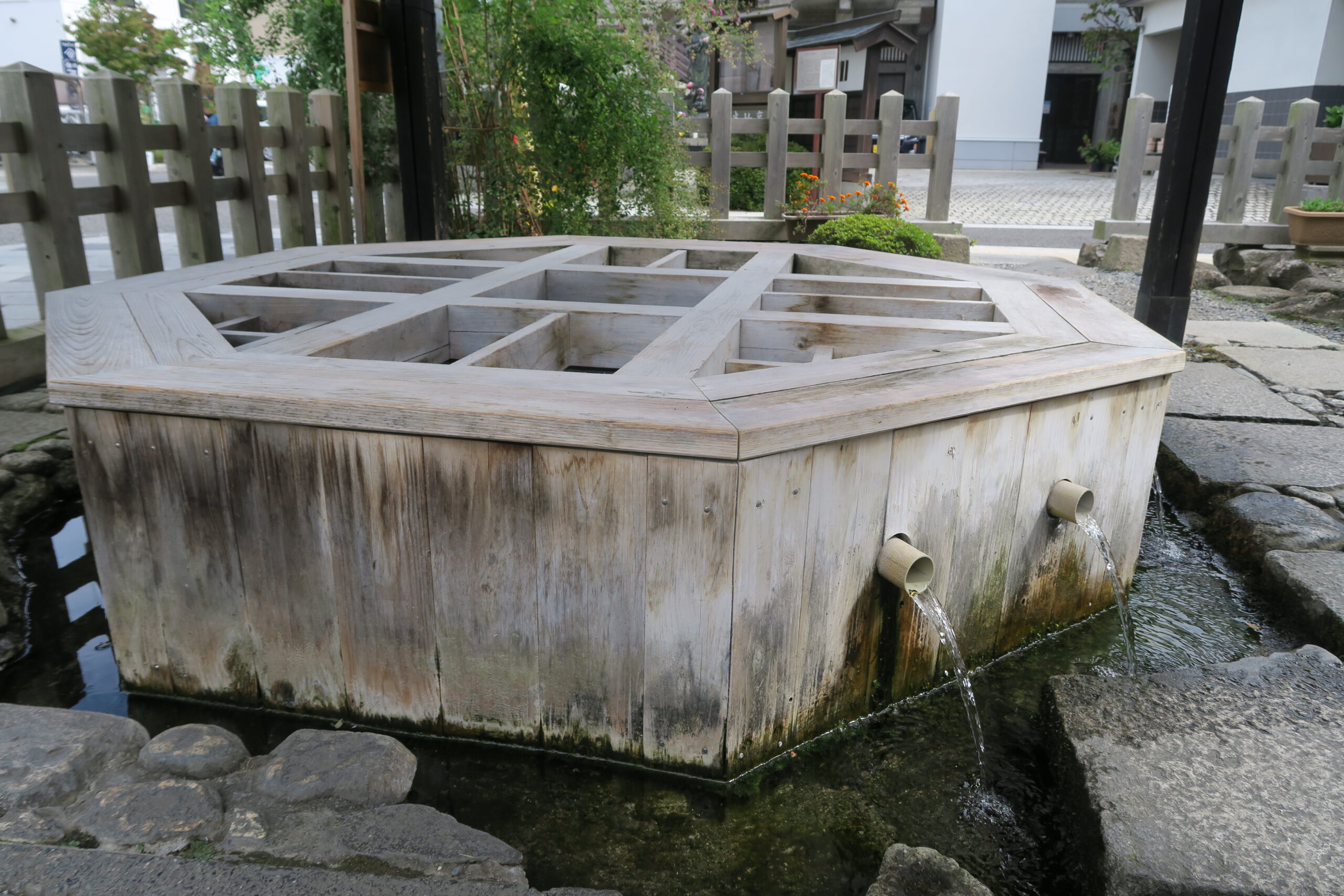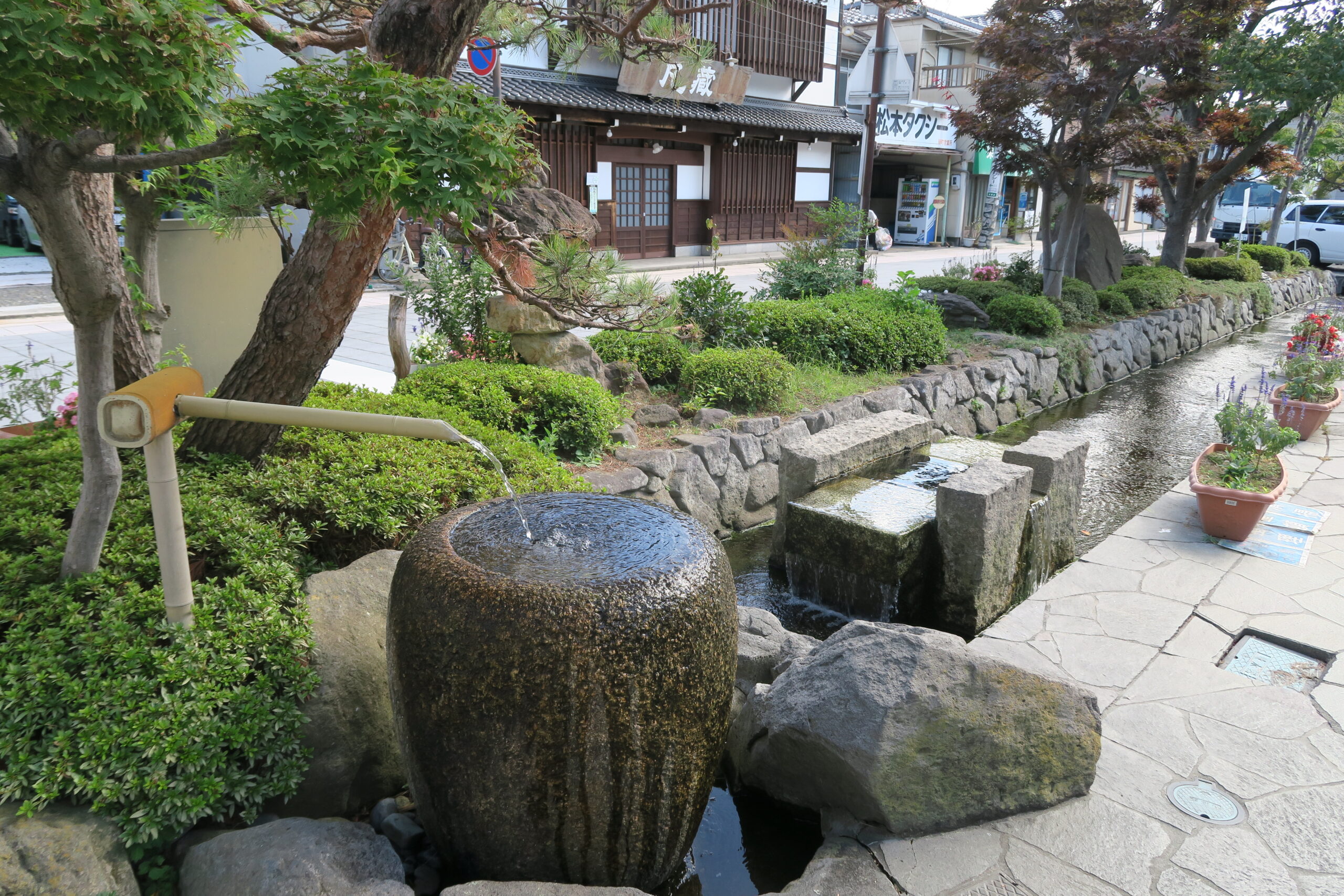 再び女鳥羽川沿いに戻り、ちょうど妙勝寺の対岸にあるのが、市街地に残る唯一の蔵元、銘酒『善哉』を造る善哉酒造の井戸「女鳥羽の泉」です。敷地内に数か所あった井戸のうち、一番美味しいと残された井戸で、地下30mから自噴していています。現在の井戸は昭和62年に整備され、お酒の仕込み水にも使われる水は空気がたくさん含まれているような軽い飲み心地です。