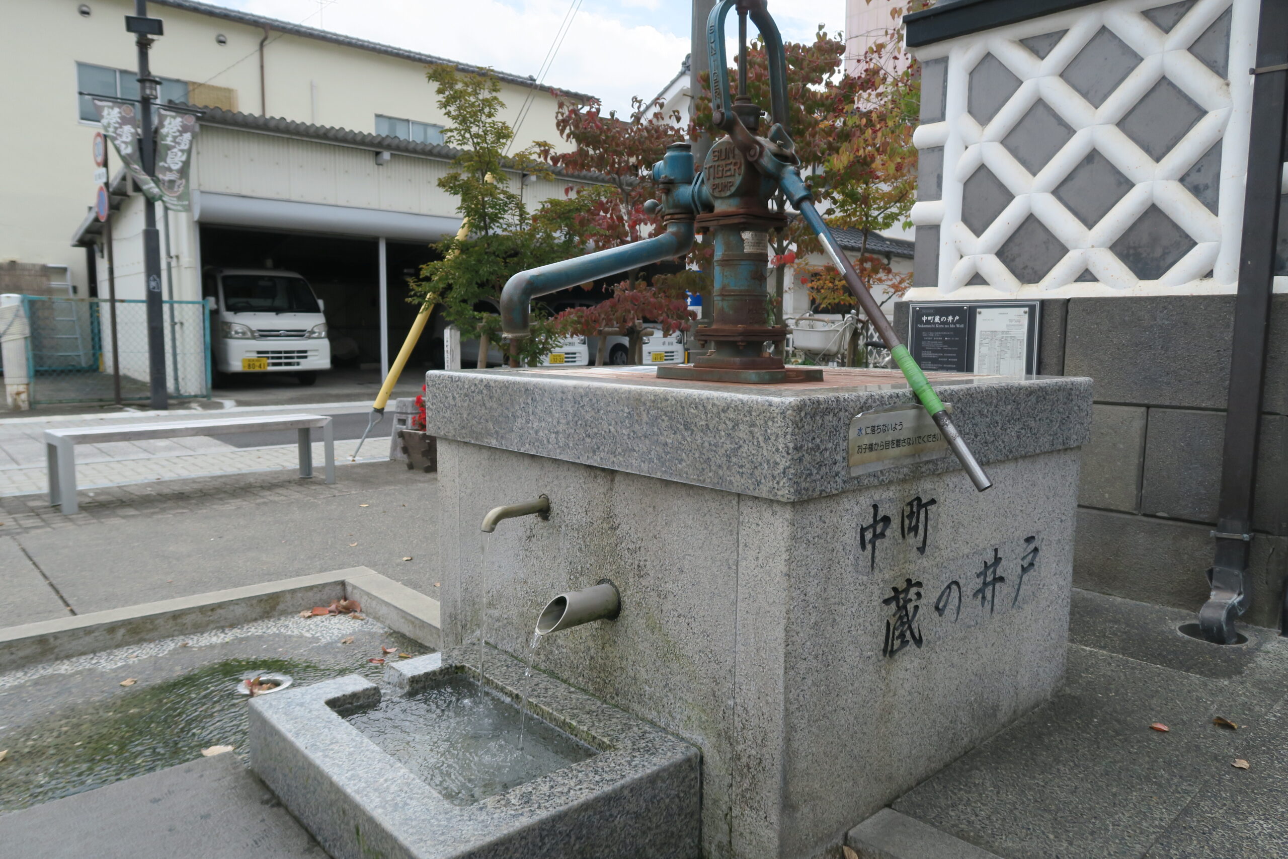 ここまで所要時間約30分、中町通りの顔的存在が、旧宮村町にあった大禮酒造の母屋、蔵、離れの3棟を移築復元した「蔵シック館」です。その前庭にあるのが写真の「中町 蔵の井戸」で、昔懐かしい手漕ぎ式ポンプの井戸で、地下25mから汲み上げています。