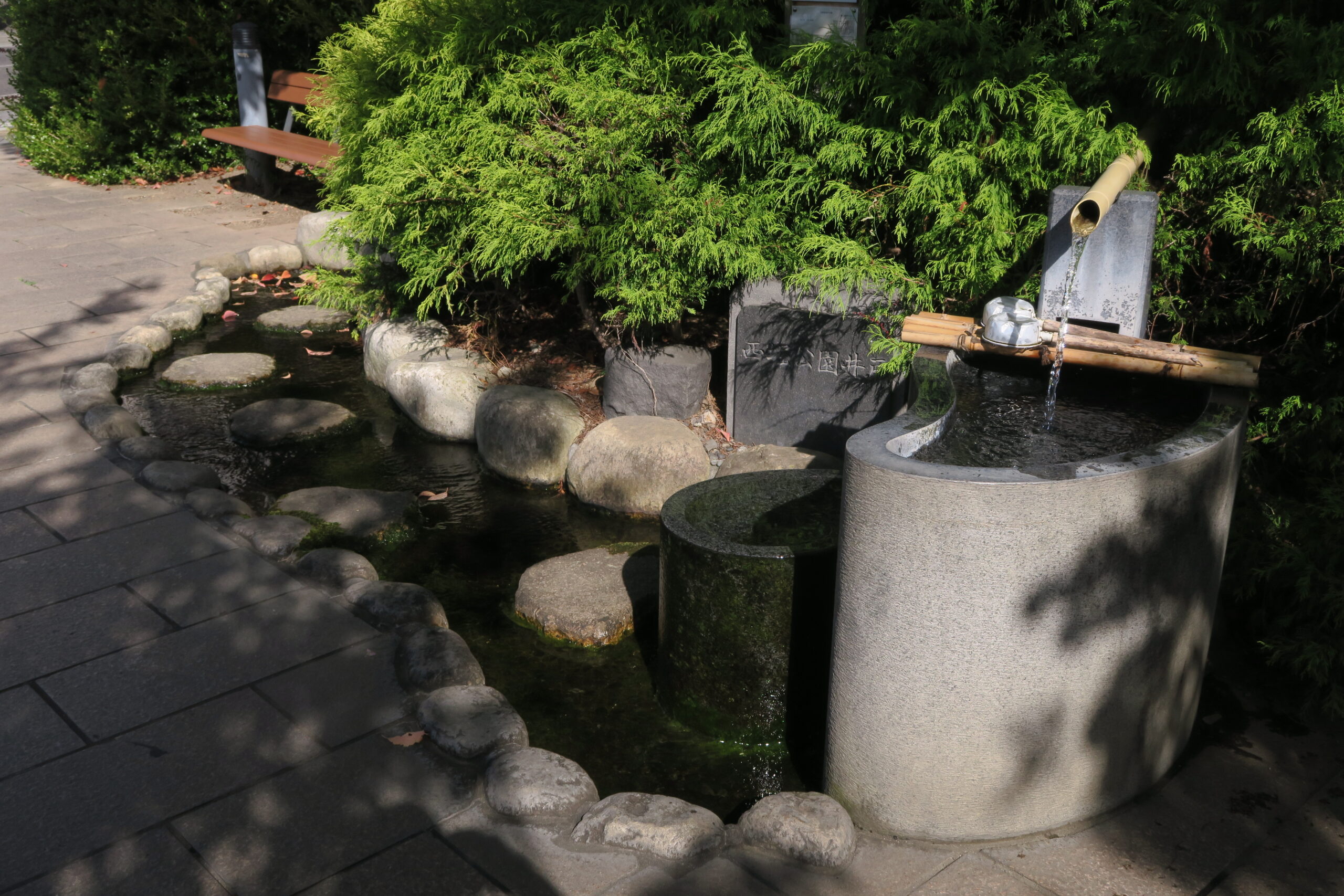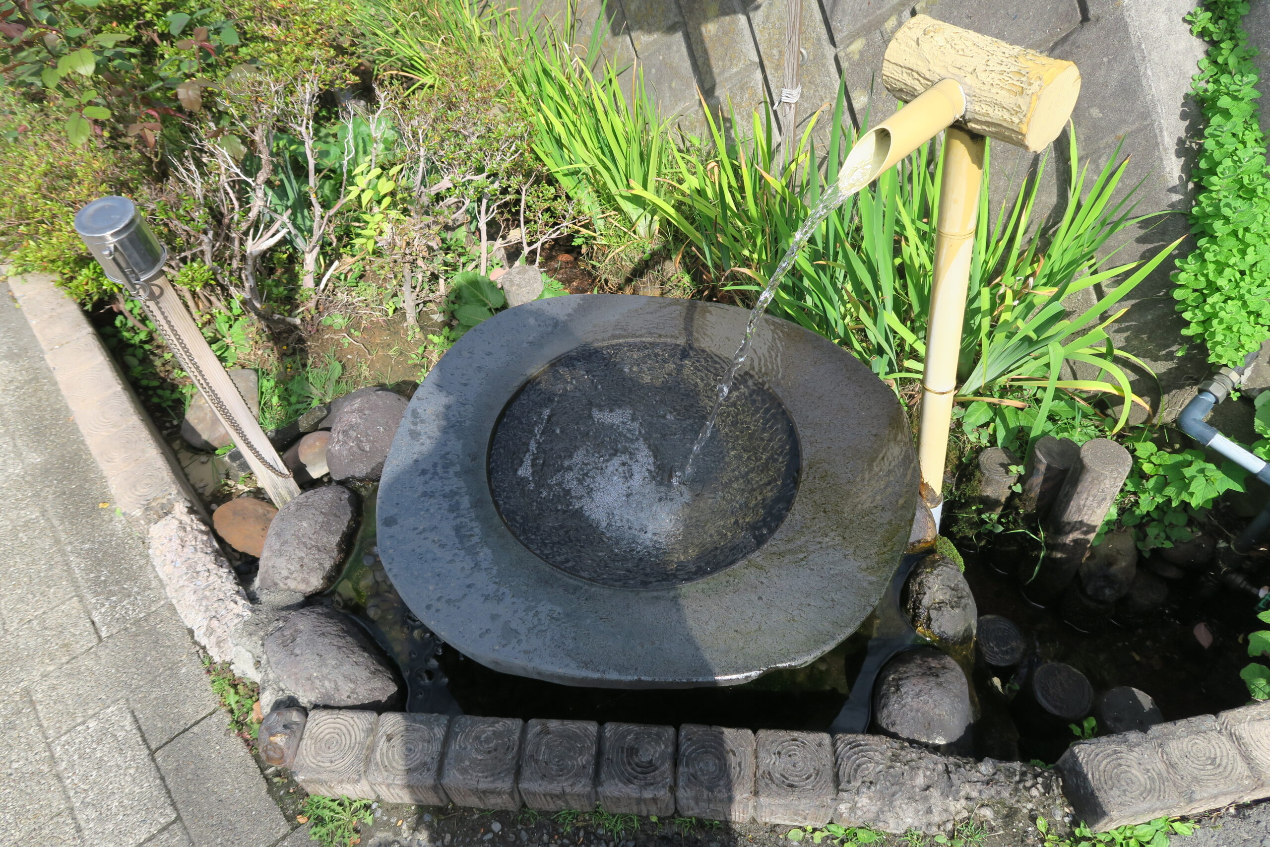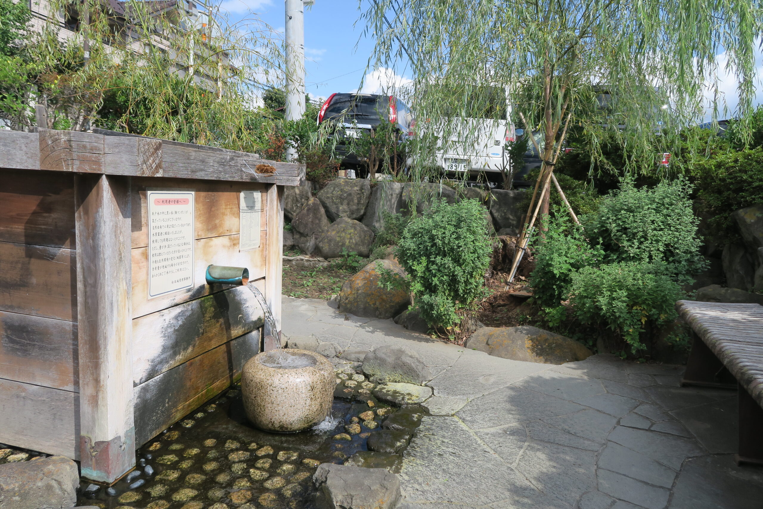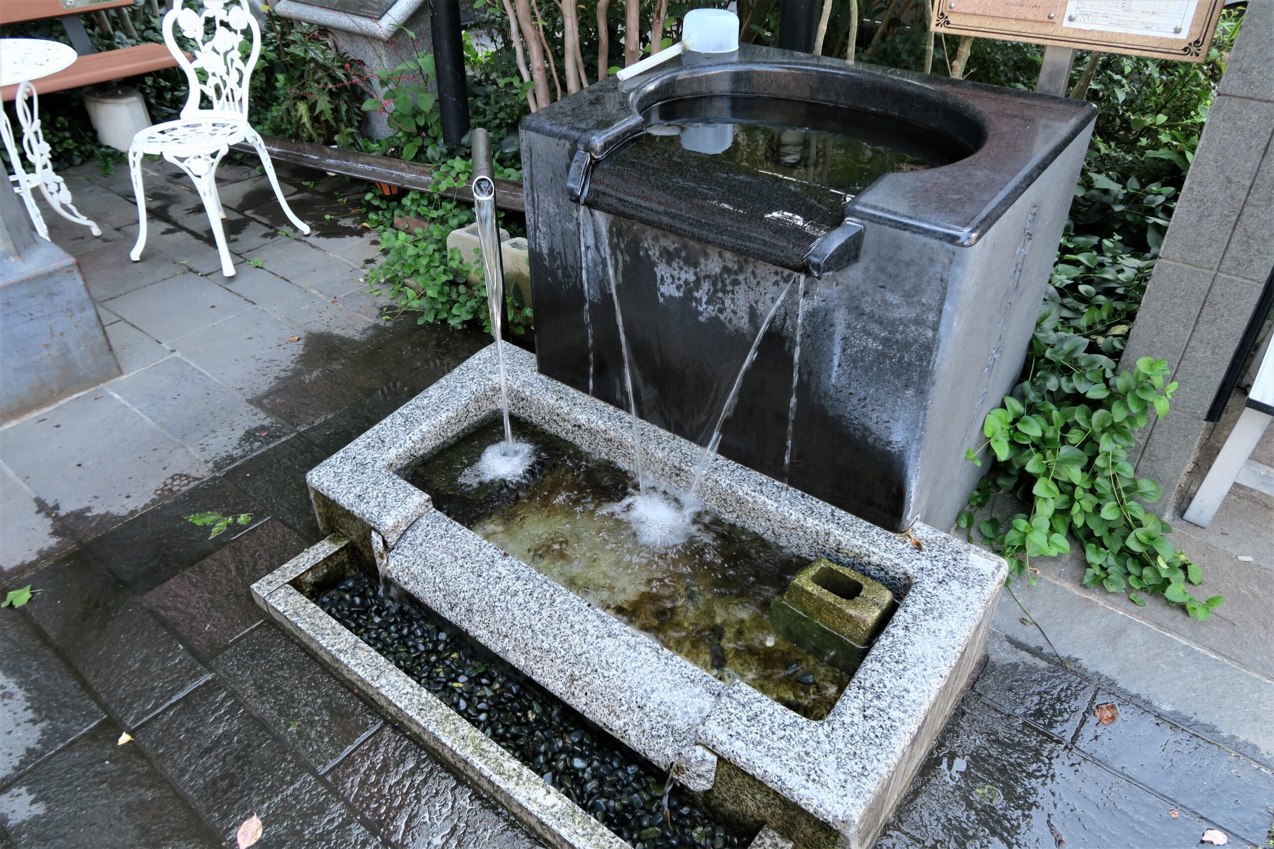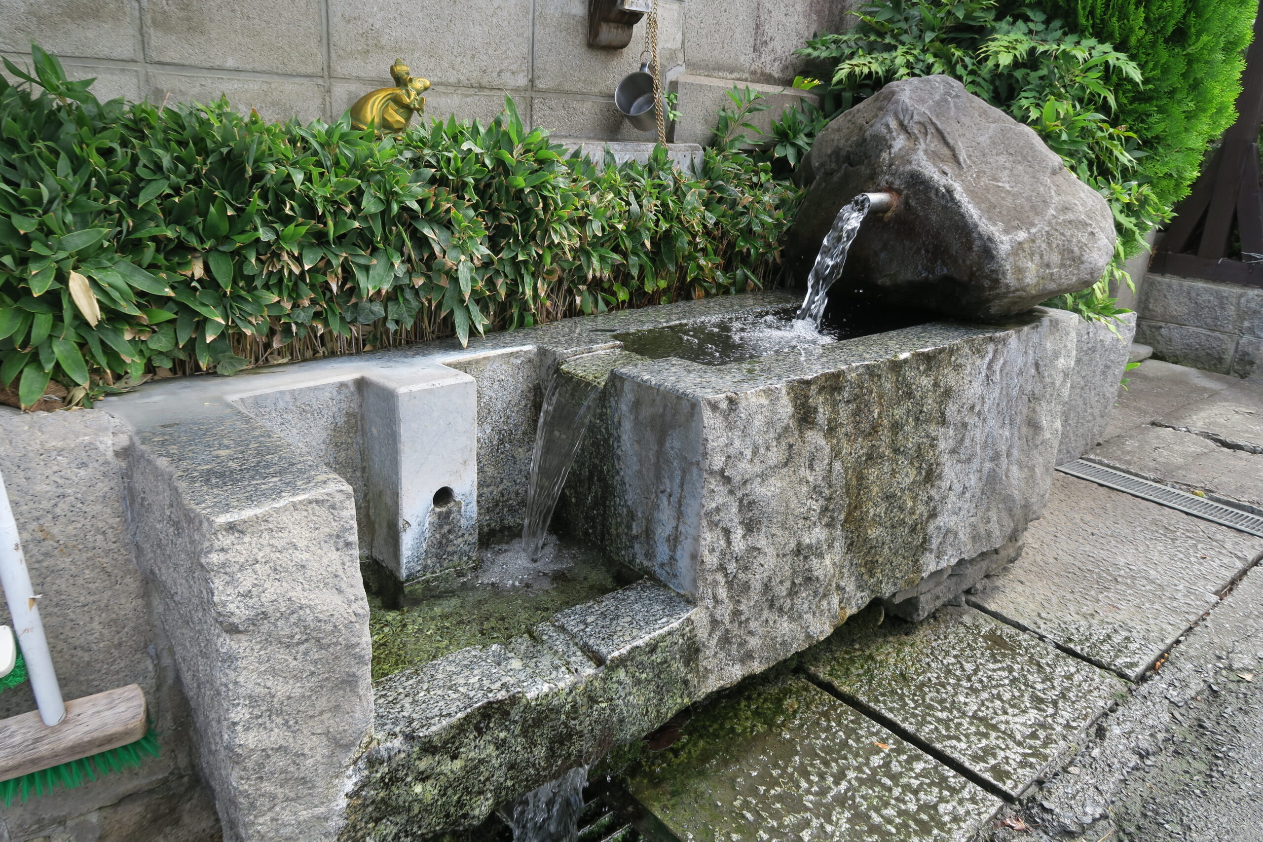 「伊織の霊水」から東に50mほどにあるのが、日の出の泉「薬祖水」です。松本薬業会館内にあり、茨城県の大洗磯前神社から分霊された大己貴命・少彦名命を祀る「薬祖神社」に湧き出る御神水です。古老の言い伝えによると、他の井戸が枯渇してもこの井戸は枯れなかったといいます。平成19年に整備された際に名付けられました。