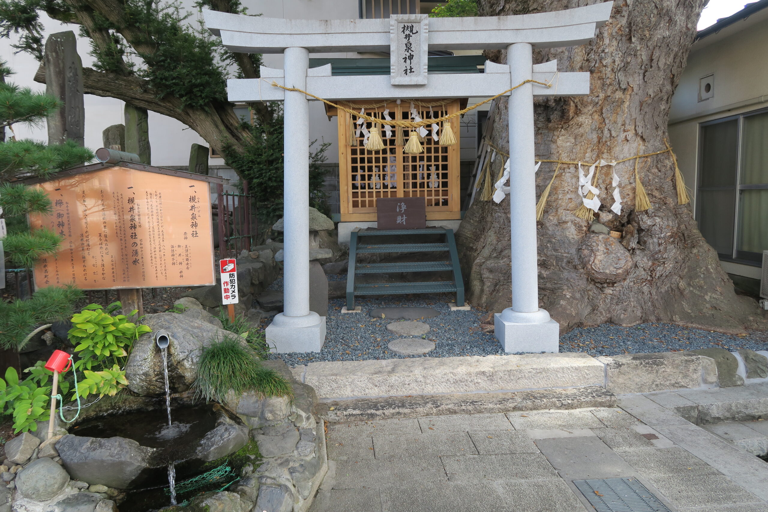 城下を囲む防御施設として南を流れている女鳥羽川が清水橋周辺で直角に北へ流れを変えています。その清水橋近く、樹齢300年、高さ20m、圧巻のケヤキの木の下に沸く泉が「槻井泉神社の湧水」です。古来からこんこんと湧出し、この地のシンボルになった湧水で、平安時代には近くを官街道(山辺街道)が通っていて古くからの水場でした。この地域の地名“清水”もこれに由来しています。江戸時代・水野氏時代には、この水を使って染色や紙漉きが行われていました。