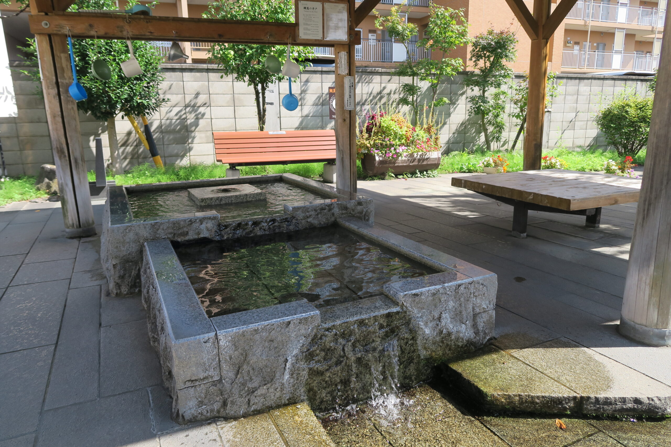 最後は大名通りを跨ぎ四柱神社裏手から「辰巳の御庭の井戸」で休憩です。松本城の辰巳門と城主の辰巳御殿があった所です。小さな公園になっていて、きれいな冷たい水が湧き出、水路にせせらぎとなって流れる様に癒されますよ。