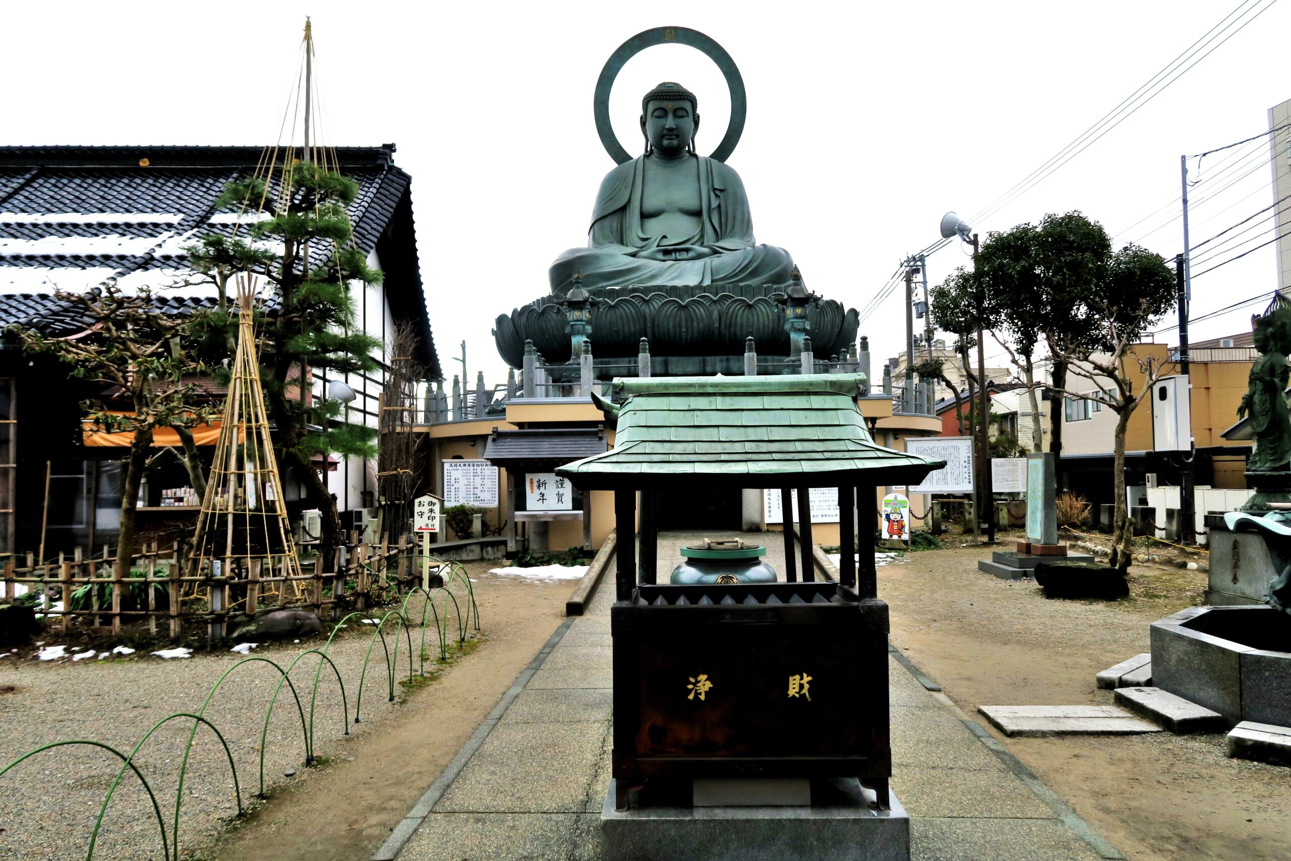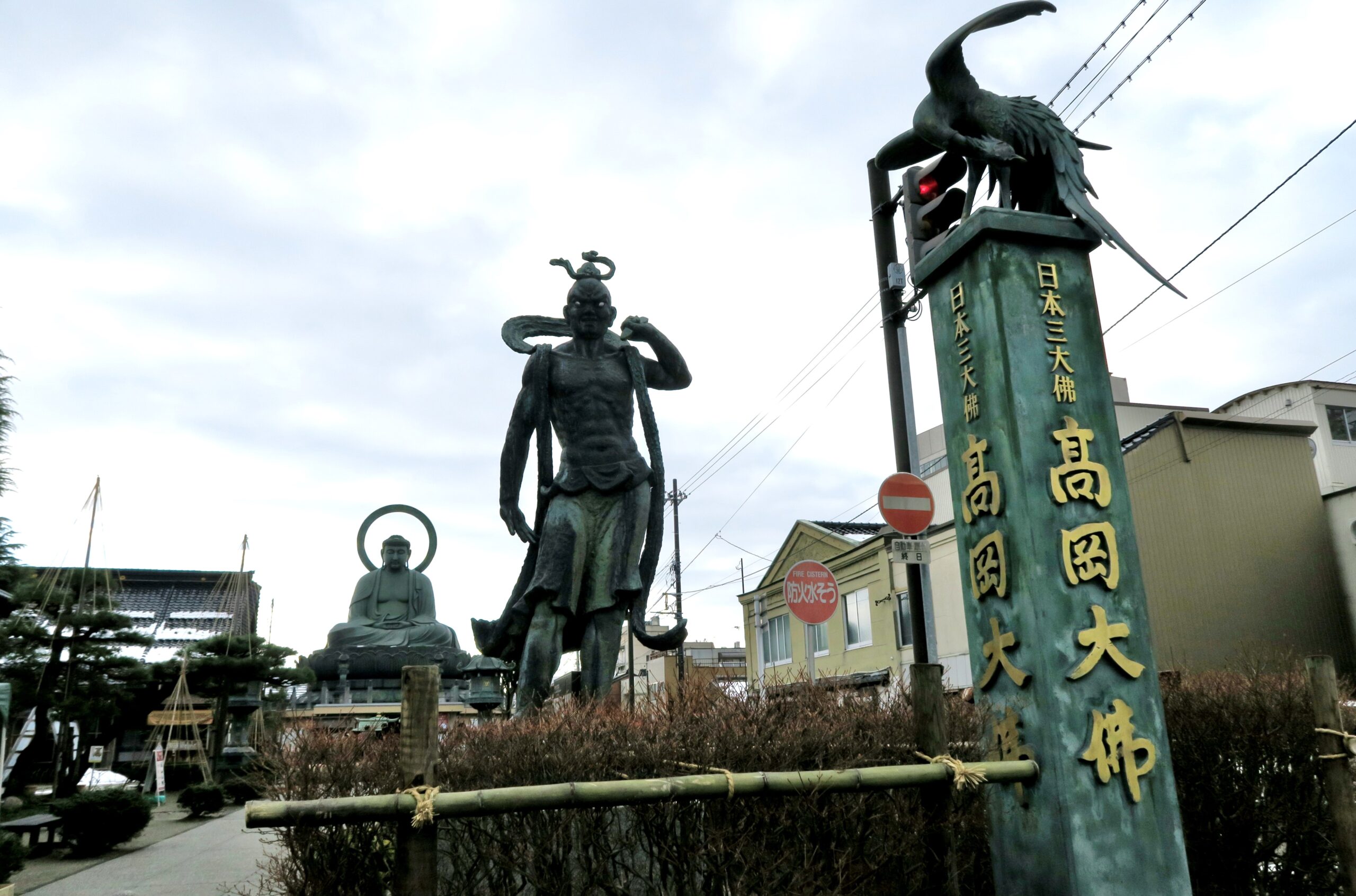 銅器日本一の高岡を象徴するのが、日本三大仏のひとつに数えられる「高岡大仏」です。高岡駅から徒歩でも10分程度ですがトラムに乗って次の坂下駅で降りると坂の先に大仏が見えます。奈良大仏、鎌倉大仏はよく知られていますが、もうひとつが富山県の高岡市にあったとは驚きです。高岡大仏の始まりは約800年前の承久3年(1221)と伝えられ、かつては木造でしたが過去2回の大仏大火に見舞われ、現在の大仏様は昭和7年(1932)に30年の歳月をかけて再建されました。総高15.85m、座高7.43m、御顔2.27m、重量65tの銅製で、原型、鋳造とも高岡工人の手によるもので380余年の伝統を誇る高岡銅器の技術が生きています。