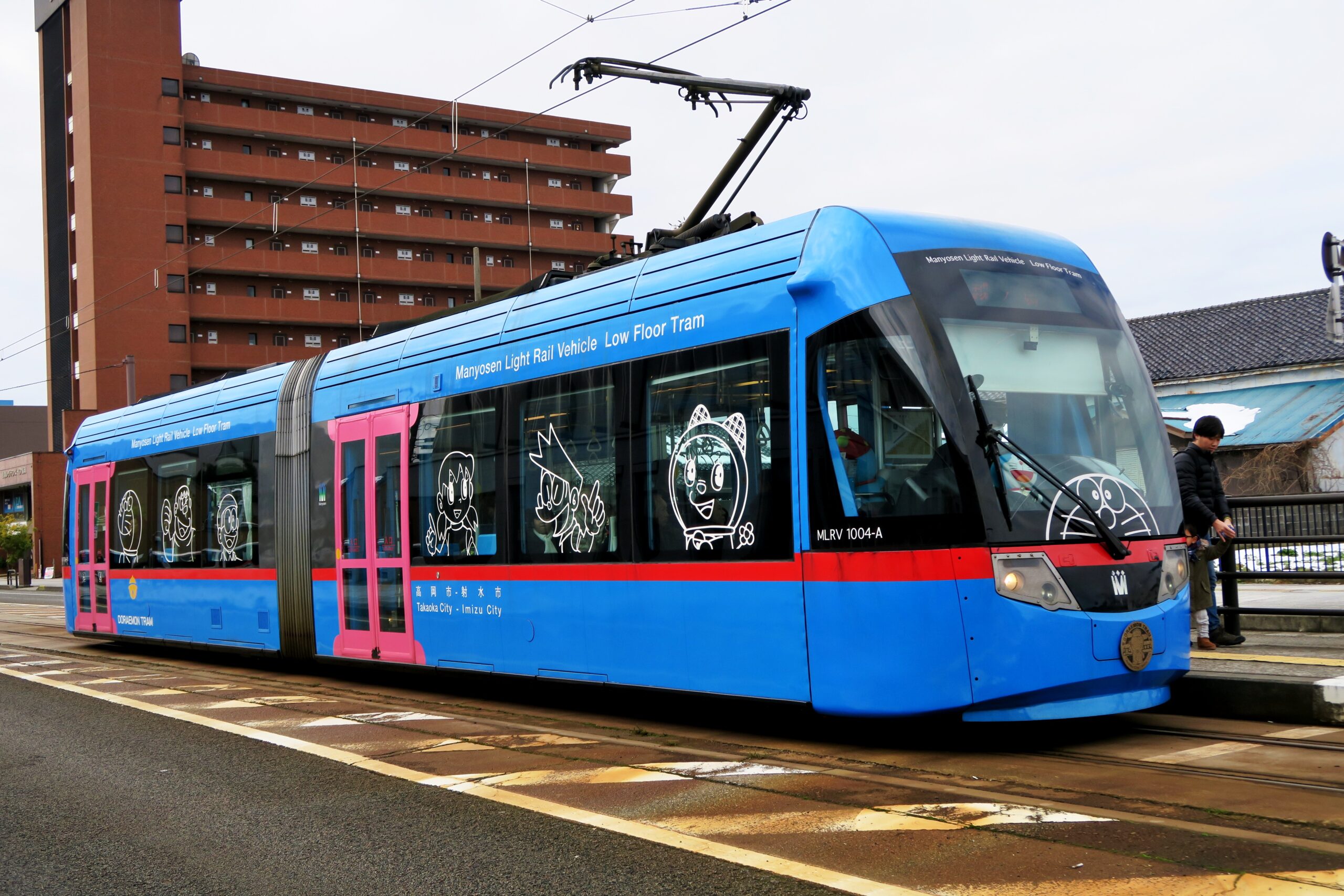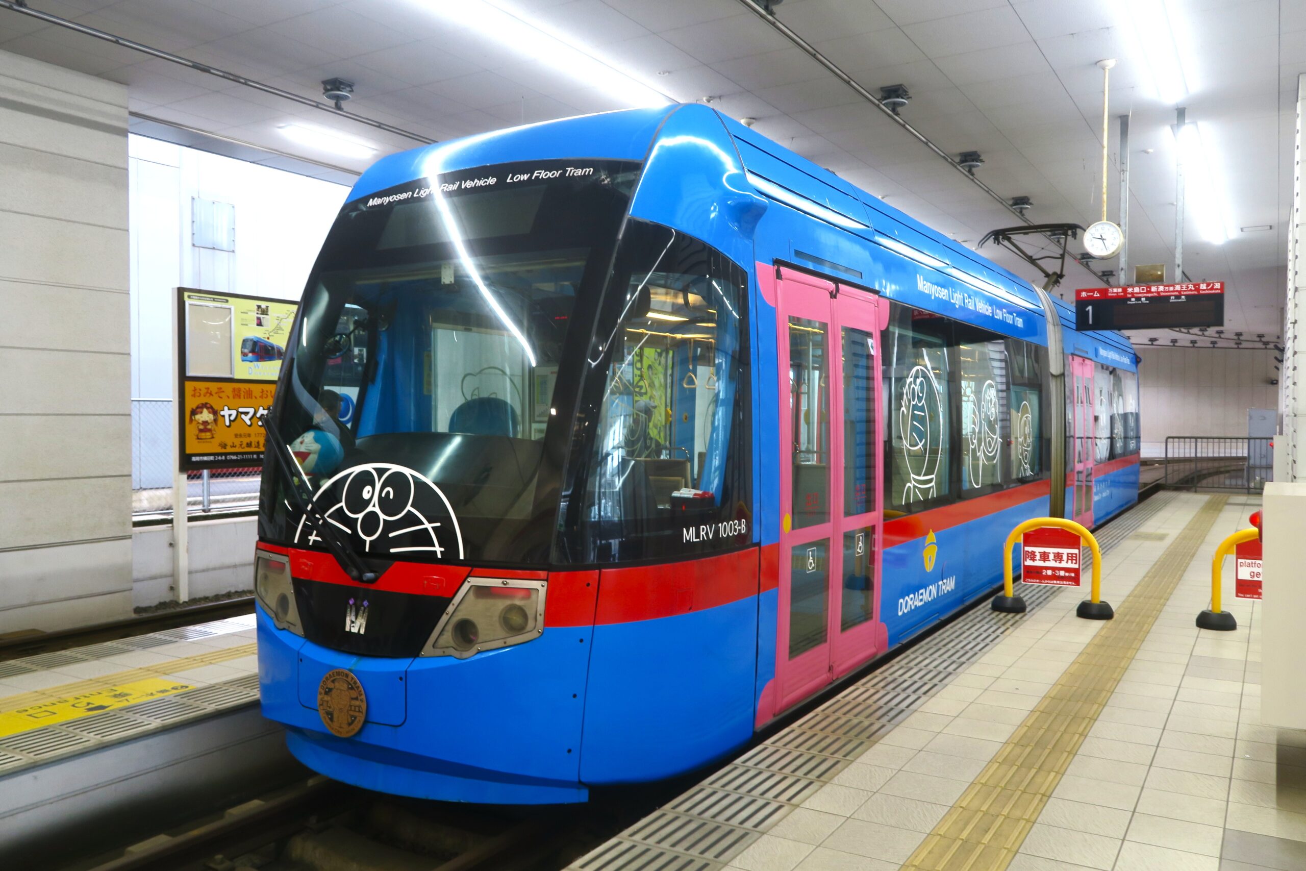 富山県西部の高岡市と射水市を走る万葉線は、昭和23年(1948)に高岡駅と伏木港を結ぶ路線が開通したのが始まりで、2002から第三セクターによって万葉線として運営されています。沿線には寺社や古い町並み、富山湾など名所が多く、観光にも便利な路線です。万葉線に登場した「ドラえもんトラム」は、2012年にドラえもんの生誕100年前(ドラえもんは2112年に生まれたネコ型ロボット)を記念して作られました。ドラえもんの作者である藤子・F・不二雄氏が生まれ少年時代を過ごした富山県高岡市と射水市越の潟を結んで走る万葉線の路面電車MLRV1000型にドラえもんをイメージした内装・外装を施したものです。ベースカラーを青にし、ドラえもんの首輪であるリボンを表す赤いラインと黄色の鈴を加え、窓にはキャラクターの線画が描かれています。また正面にもドラえもんが描かれていますし、運転席にはドラえもんがちょこんと座っていますよ。そして乗車口を見てください。ピンク色したあの『どこでもドア』を入口にしているなんて、遊び心満載の素晴らしいデザインですね。