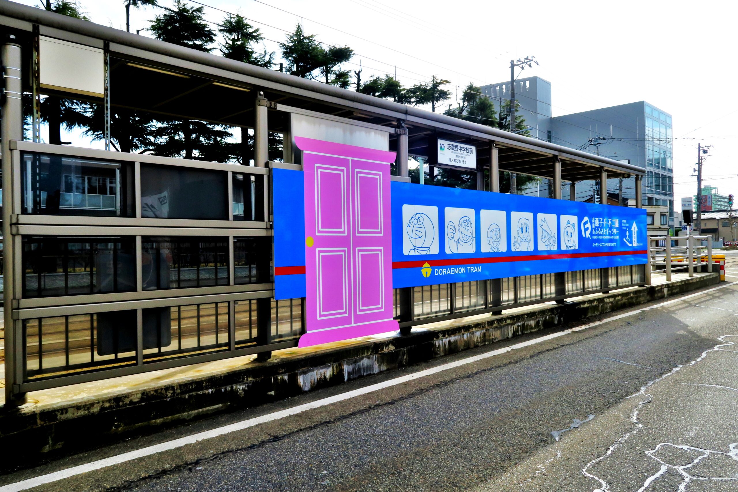 電停のホームにも『どこでもドア』が描かれています。「ドラえもんトラム」は、国内はもちろん、海外からもこの車両目当てに訪れる観光客も多いといいます。しかしながら1台しかないので、運行本数、運行スケジュールを万葉線ホームページできちんと確認してから行って下さい。前日の18時に決定されますよ。