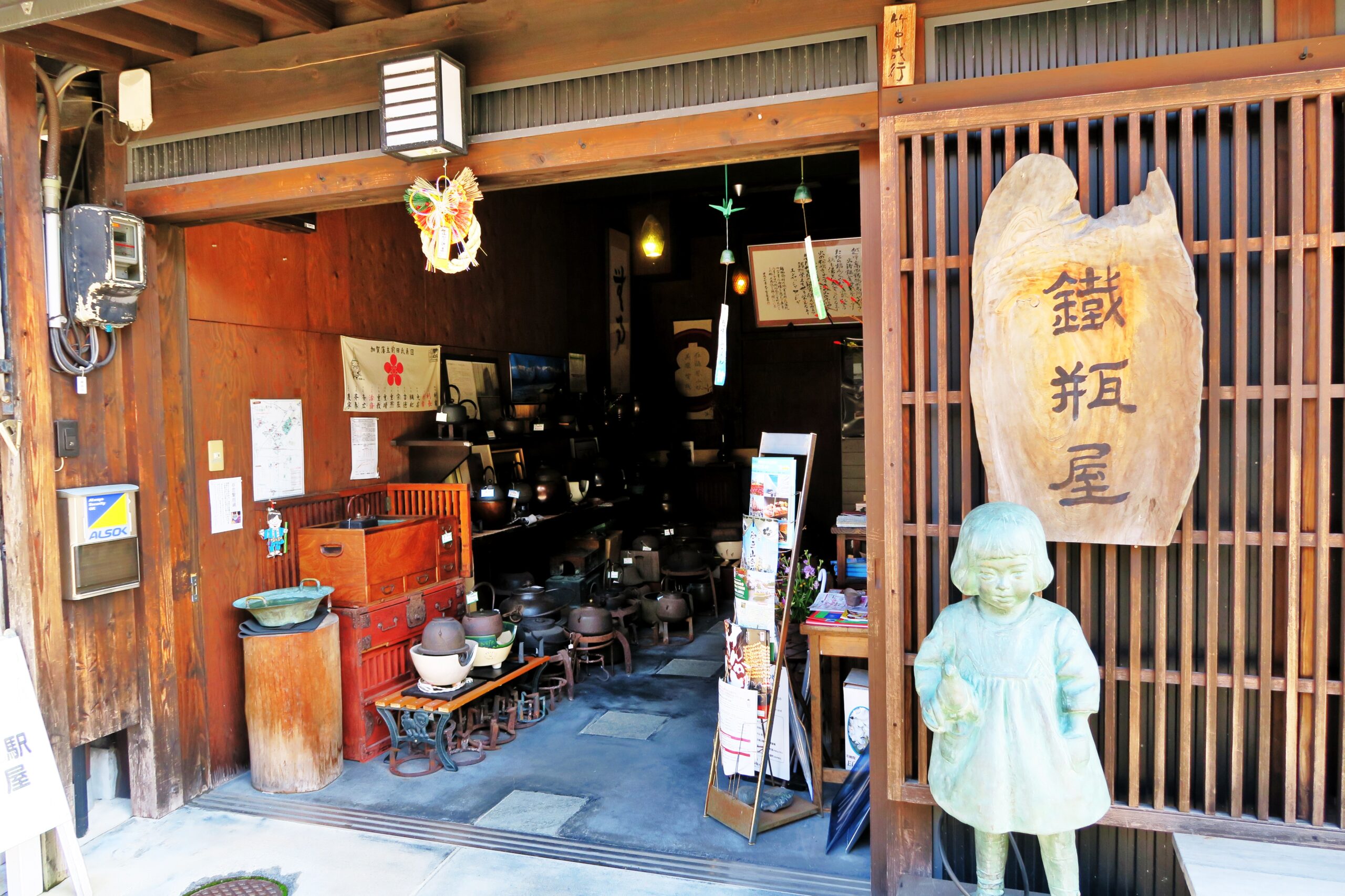 千本格子の建屋は間口が狭く、奥行きが深いのが特徴。一見しただけではわかりにくいが、道路側に母屋、中庭を挟んで土蔵、火を扱う作業場は敷地の奥に。これも防火の工夫です。石畳のメーン通りに面した鉄瓶専門店「鉄瓶屋」や上の写真にある江戸時代の終わり万延元年(1860)に銅器など金属工芸品の卸問屋として創業した大寺幸八郎商店で実感できます。建屋は築200年で2006年カフェ「茶房ギャラリーおおてら」を併設する小売店を開業、6代目が考案した細部までこだわったブロンズ干支シリーズが愛らしいデザインで人気が高い。観光客に建物内の公開を始めた。玄関から中に入ると奥へと店はつながり、庭に面して茶室があり、古い町家の風情を感じながらお抹茶で一服できます。