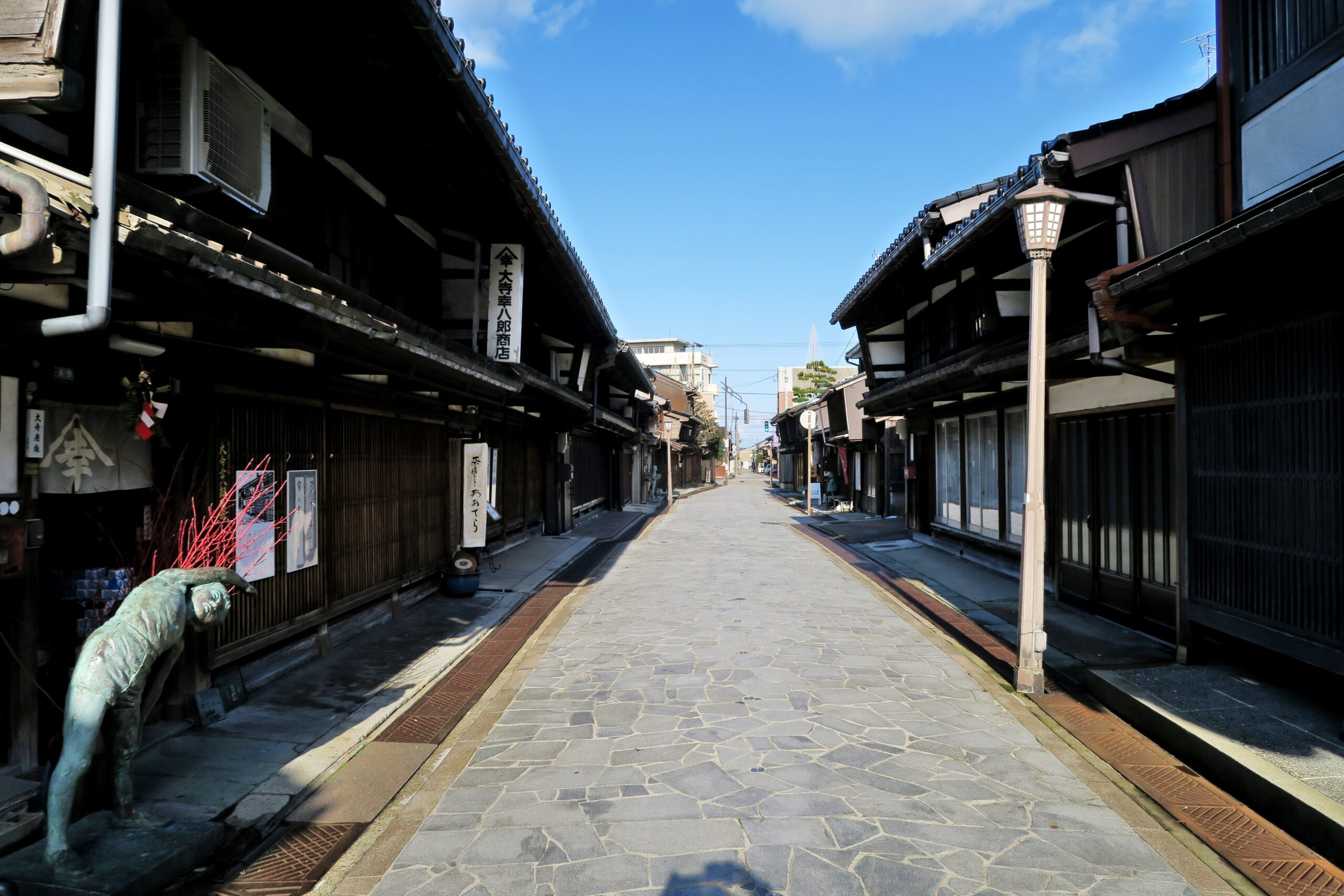 三代利常は利長の意を汲み、鋳造産業の奨励もして、城下町であった高岡を商工業の町へと転換しました。ここはその高岡銅器の中心地です。平成24年(2012)には東西140m、南北450mに及んで、鋳物師の町としては全国で初めて国の重要伝統的建造物群保存地区に選ばれています。石畳を挟んで格子のある古い鋳物を扱う店舗や工房が軒を連ね、各所で銅像や茶釜といった鋳物の街らしい品に出会え、職人街の雰囲気を今も楽しめますよ。