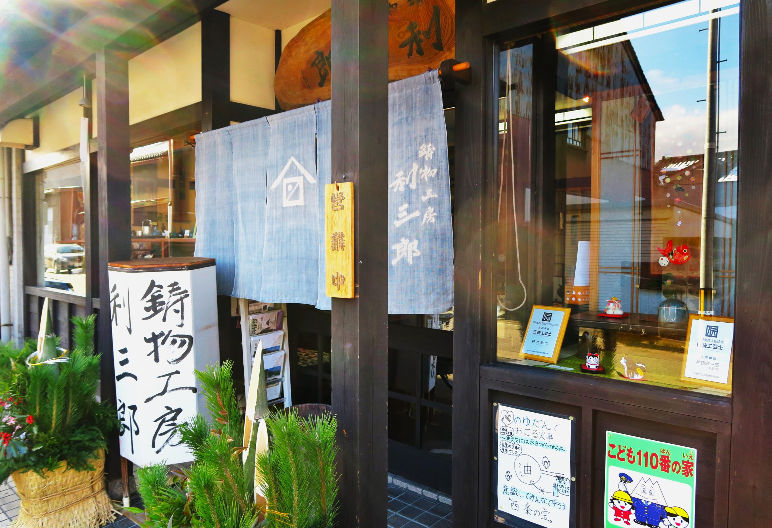 通りを一本入った所には現在では数えるほどしかいない工房を構える鋳物師のお店「鋳物工房 利三郎」があります。明治初期に初代利三郎が始めた鋳物工房。ショップでは手作りの伝統工芸品を販売し、工場では伝統工芸士でもある職人が鋳込みを行う現場で指導してもらいながら箸置きやぐい呑みを鋳造する鋳物体験や製造風景を見学することができます。体験では銅ではなく融点が低いので扱いやすく、ムラができにくいスズを使う。消しゴム大の金属片にバーナーの火を当てると、ゆらゆらと形を失い、銀色に輝く液体に変わる。湯勺と呼ばれる道具で液状化したスズを鋳型に注ぎ、1分も待てばスズは再び固まります。