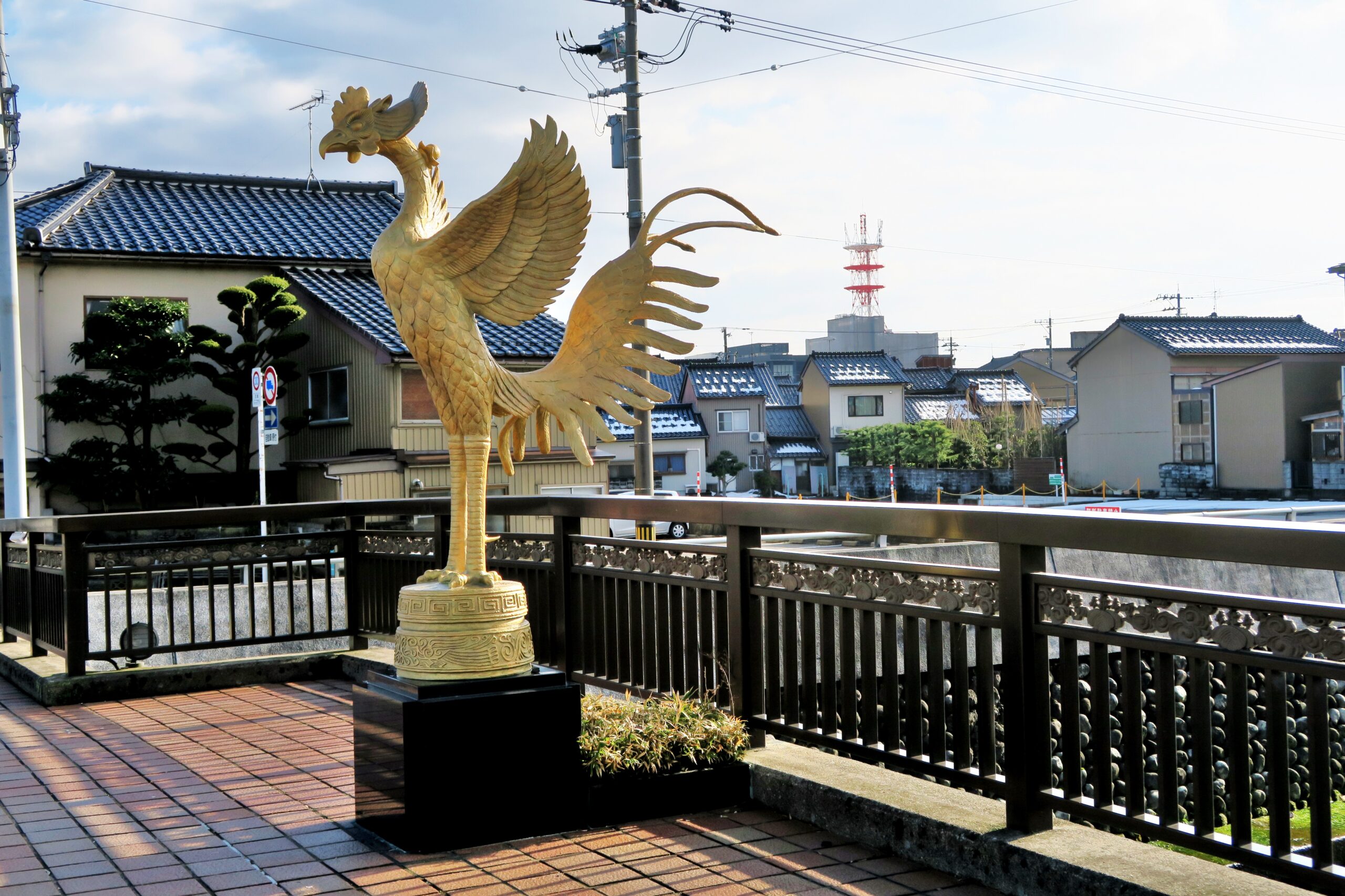 加賀藩2代藩主・前田利長は、高岡城築城と同時に城下町の整備に着手し、商売を繫盛させ経済を促進させるために、北陸街道が城下の中心を貫くように碁盤目状に町割りをして利長入城後の慶長14年(1609)9月13日に開町し、城下町高岡が誕生しました。金屋町の成り立ちは、その2年後の慶長16年(1611)地場産業を育てようと鋳物に目を付け、砺波郡金屋村から鋳物師と呼ばれる7人の職人を招きこの地に住まわせたのが始まりです。鋳物は鉄や銅など金属を溶かすのに火を使うことから、万一失火して城下が延焼しないように千保川の対岸に無償・無税で5000坪の土地を与えて工房を開かせました。今も千保川沿いに往時の町割りが残る金屋町は、「さまのこ」と呼ばれる昔ながらの千本格子の木造家屋が軒を連ね、銅片の敷き込まれた石畳とともに独特の景観が残ります。金屋町沿いを流れる千保川の鳳凰橋には、黄金の鳳凰像1対が立つ。