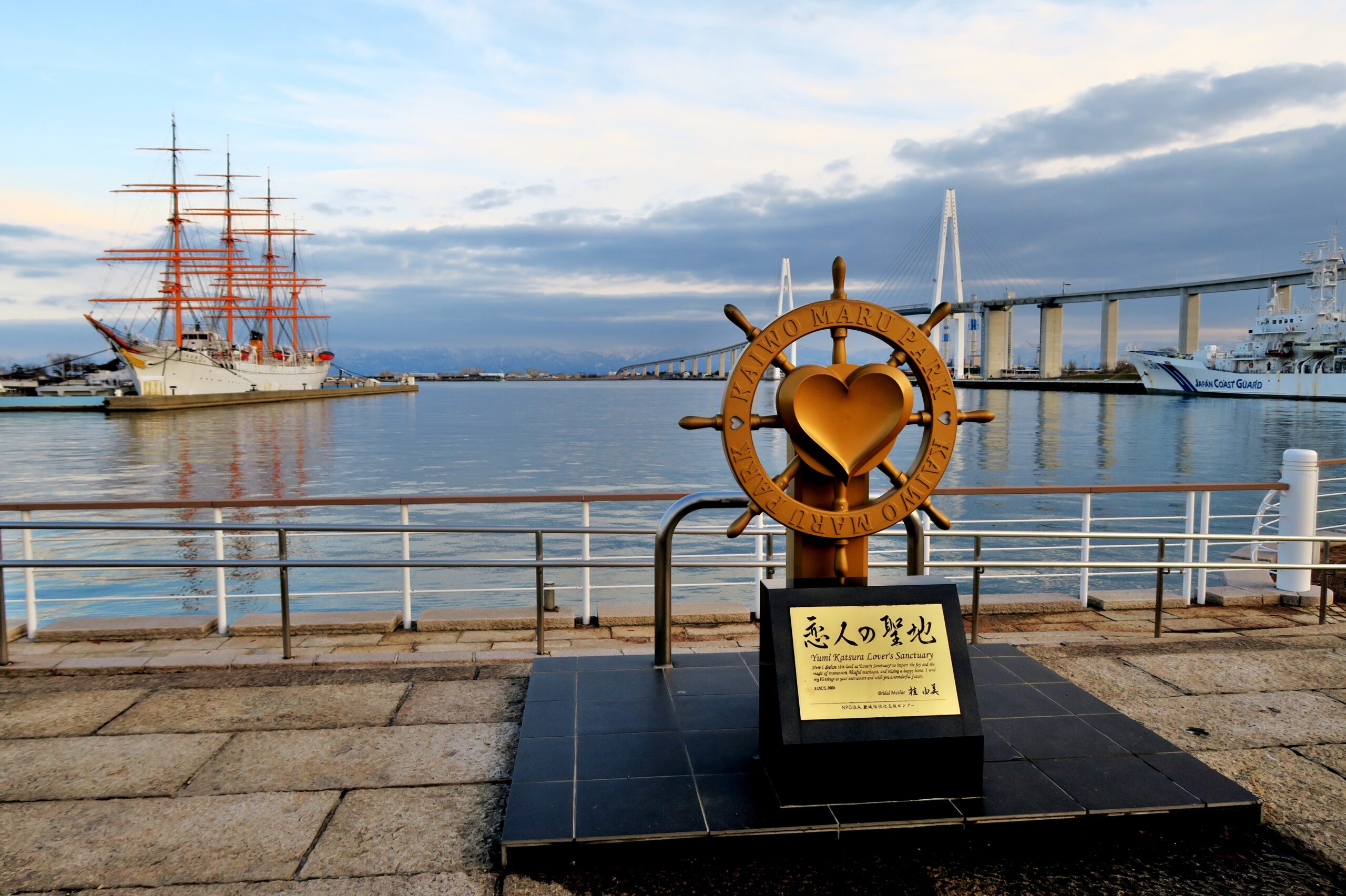 万葉線の終点:越ノ潟の一駅手前、海王丸駅には海のテーマパークが点在しています。駅から徒歩10分にあるのが平成25年(2013)1月に恋人の聖地に選定された「海王丸パーク」です。一隻まるごと博物館になっている大型帆船「海王丸」を中心に、広大な敷地には、日本海交流センター」や臨海野鳥園、レストランなどがあり、富山湾から日本海の潮風が渡る憩いの場として、市民に愛されています。