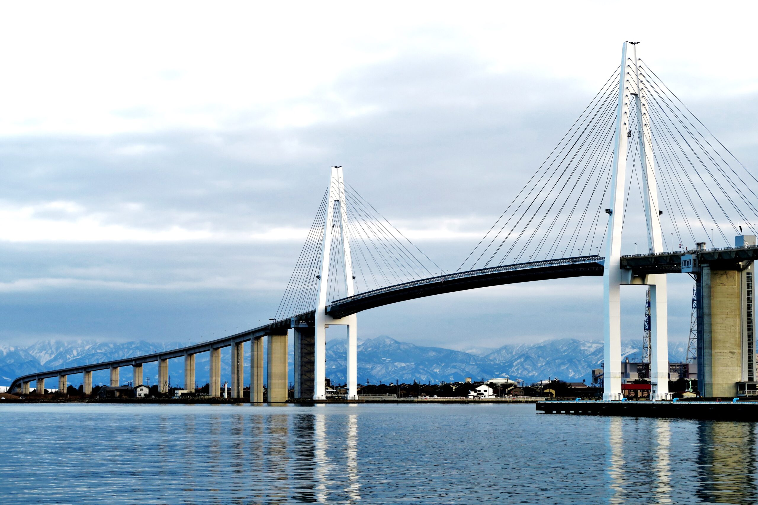海王丸と圧巻の共演をしているのが、平成24年9月に開通した富山県射水市の富山新港に架かる日本海側最大級の2階式斜張橋である「新湊大橋」。海抜50mで黒部ダムを除く富山県内の建築物の中で最も高い建物です。上層は車道、下層は自転車歩行者道になっていて、上下移動にはエレベーターを利用します。斜張橋の凛とした美しい姿と眼下に広がる日本海、そして澄んだ青空のもとに遠く広がる雄大な立山連峰との見事なコントラストを眺めることができます。
