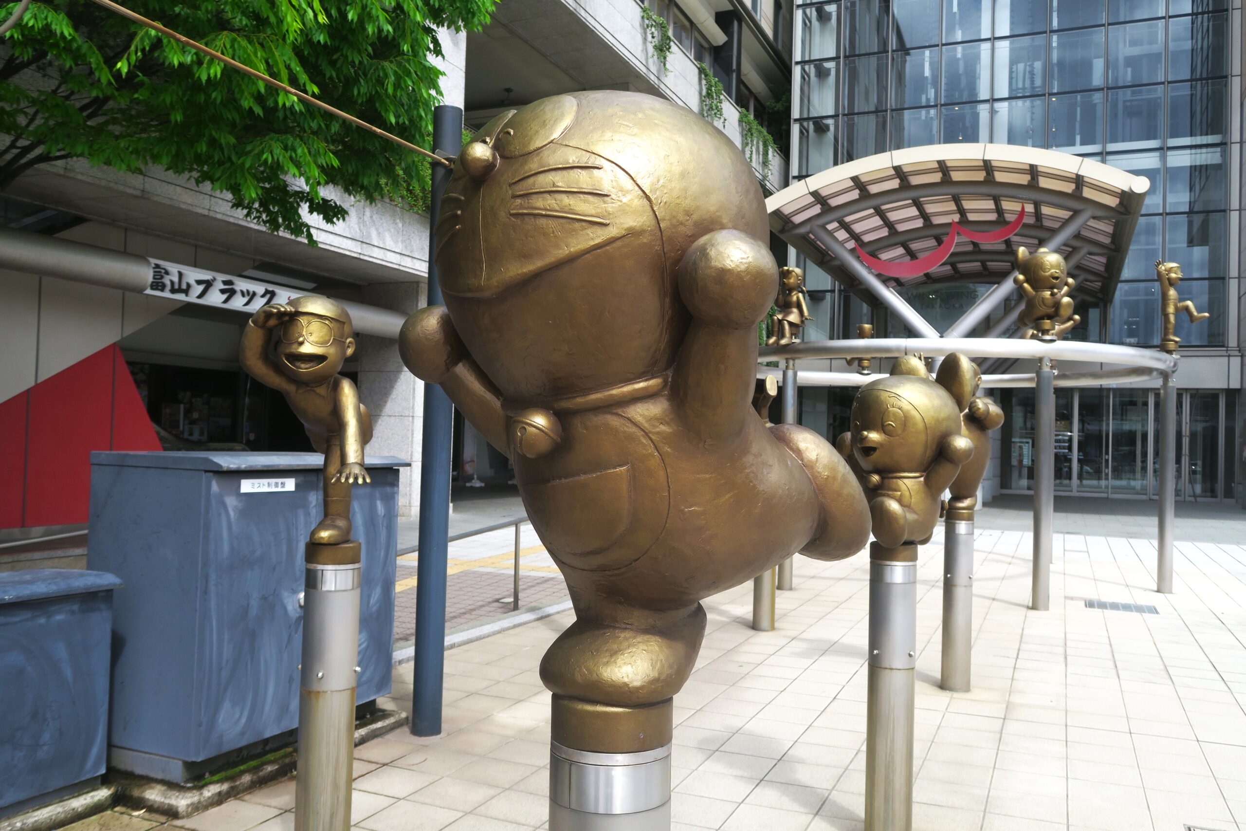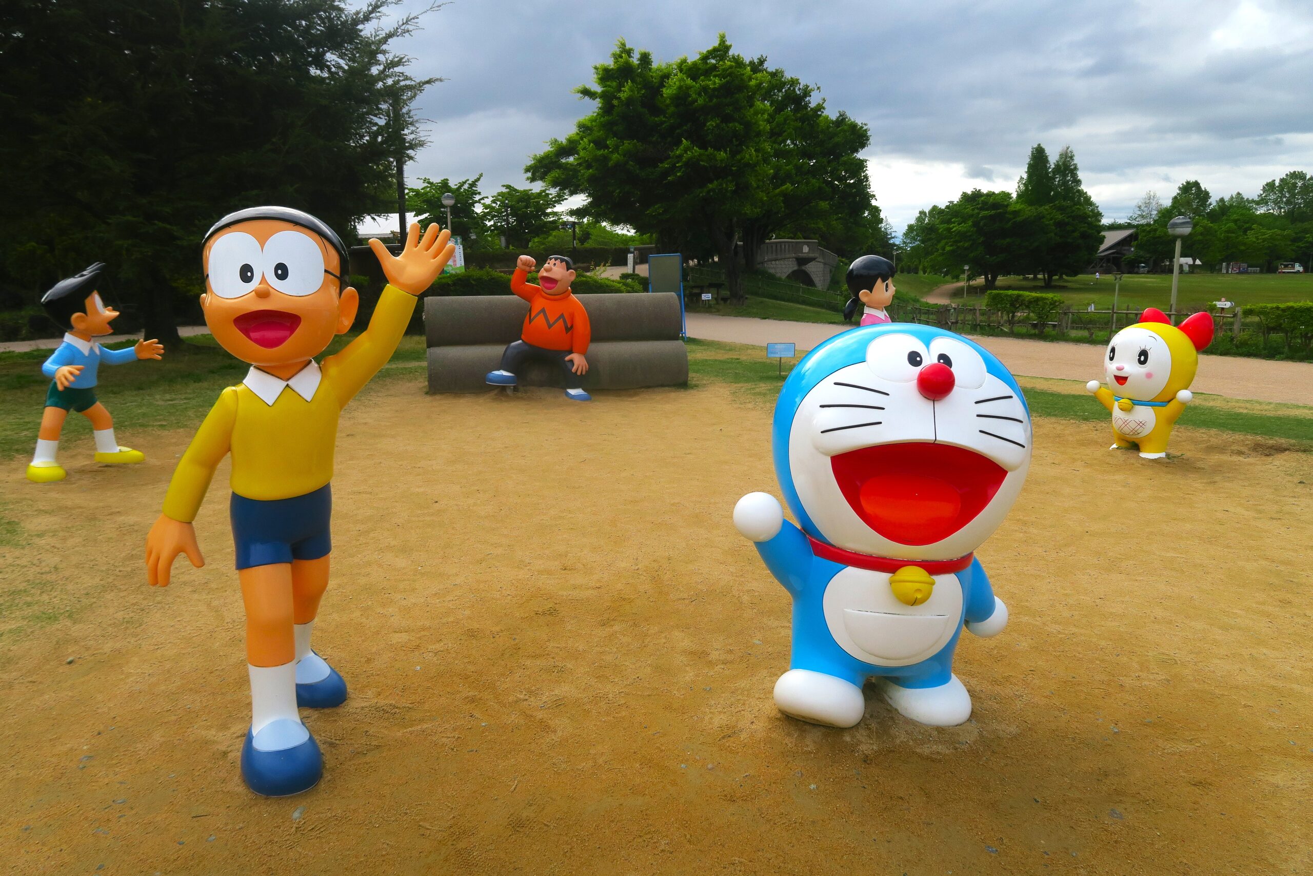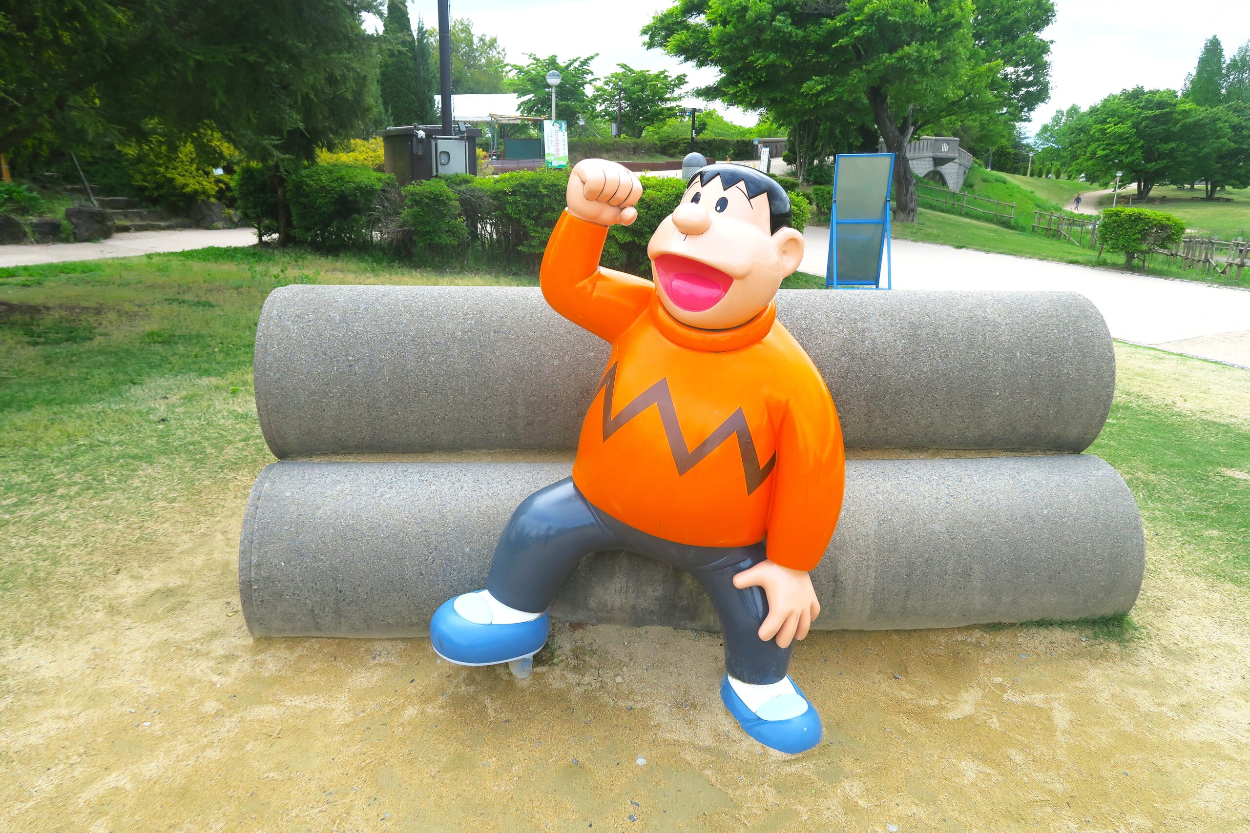 北陸新幹線新高岡駅をスタートして歩くこと約15分、まずは「高岡おとぎの森公園」を目指します。新高岡駅から南に約1.0km離れたところに位置する高岡おとぎの森公園は、市南部地区の新しい花と緑の拠点緑地として位置づけられ、21世紀4を担う子どもたちの健やかな成長を願う、緑豊かな活動の場として造られました。また公園の中央を一級河川千保川が流れて、これを軸として豊かな水辺空間が広がっていて、自然の生態系を遊びながら学べる、約11haの総合公園です。花と緑の総合公園の中に『ドラえもん』に出てくる空き地が再現されていて、ドラえもんとのび太が手を振って出迎えてくれます。その後ろには、ジャイアンにスネ夫、そしてしずかちゃんとドラミちゃんが向かい合って、テレビや漫画の中からそのまま出てきたような姿で遊んでいます。