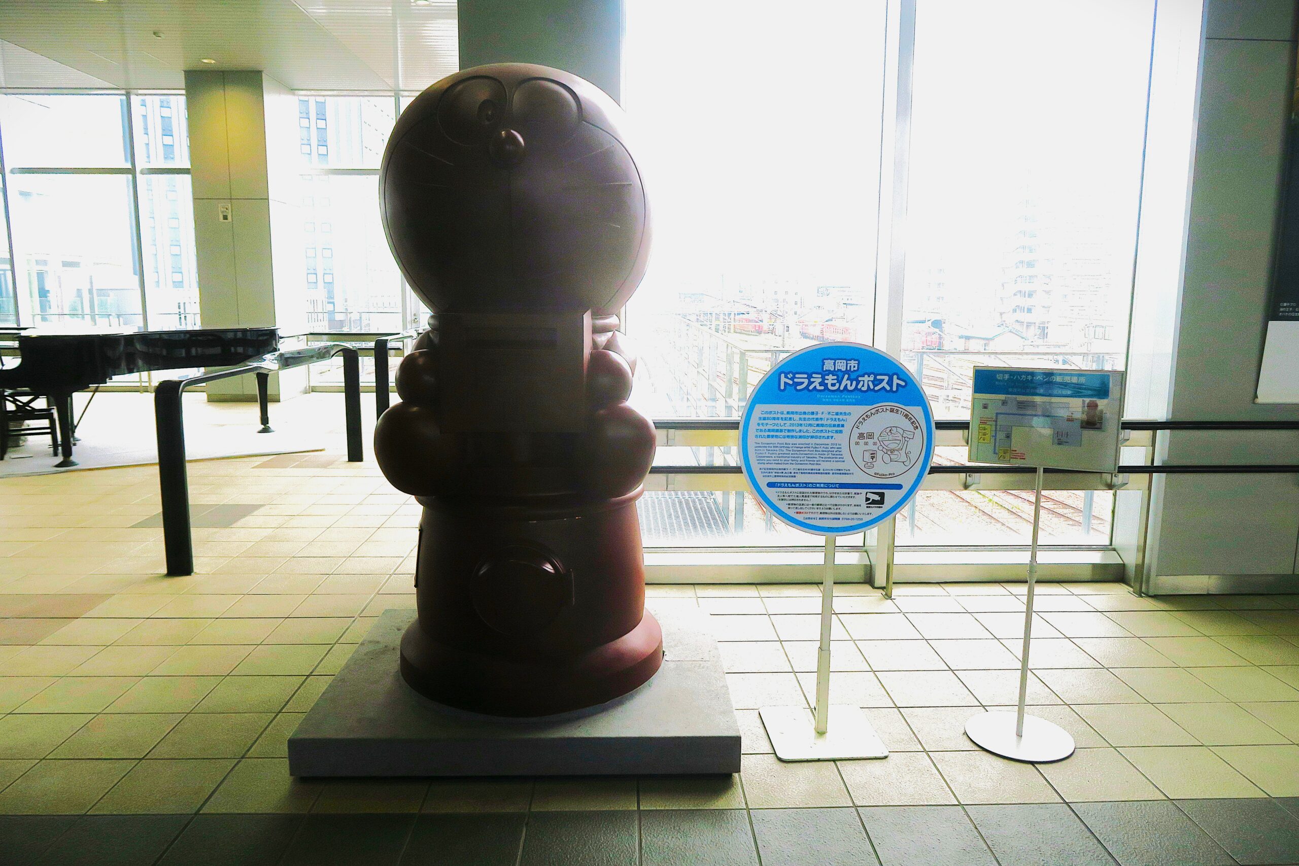 新高岡駅まで戻り、JR城端線で万葉線の始発である高岡駅へ。高岡駅交通広場(クルン高岡1F)には、藤子・F・不二雄先生の生誕80周年を記念して、伝統産業「高岡銅器」で制作された“ドラえもんポスト”が置かれています。投函されたハガキや手紙にはドラえもんの消印が押印されますよ。