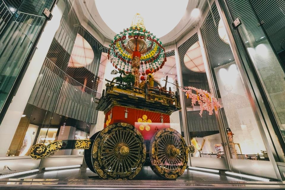 高岡御車山祭はユネスコ無形文化遺産に登録された「山・鉾・屋台行事」33件のひとつで、毎年5月1日に早朝より各山町で高岡の金工・漆工等の技を集めて美しく飾り立てられた桃山様式の7基の御車山が町内を曳き廻される高岡關野神社の春季例大祭です。天正16年(1588)豊臣秀吉が後陽成天皇を聚楽第に迎える時に使用した御所車を、前田利家が拝領、それを譲り受けた利長公が高岡城築城時にあたり町民に与えたのが祭の始まりとされています。平成27年に高山御車山会館が開館し、通年展示されています。高さ約9m、御所車形式に鉾を立てた造りになっています。御車山は神が降臨する際の目印とする鉾留、祭壇の花を意味する花傘、神が宿る人形など見どころは多いが、なかでも車輪は目を引く。欅材に黒漆を塗り、打ち出し模様の金具を施した美しさにはため息がこぼれる。前田利長より拝領した高岡御車山を持つことから「山町」と呼ばれています。