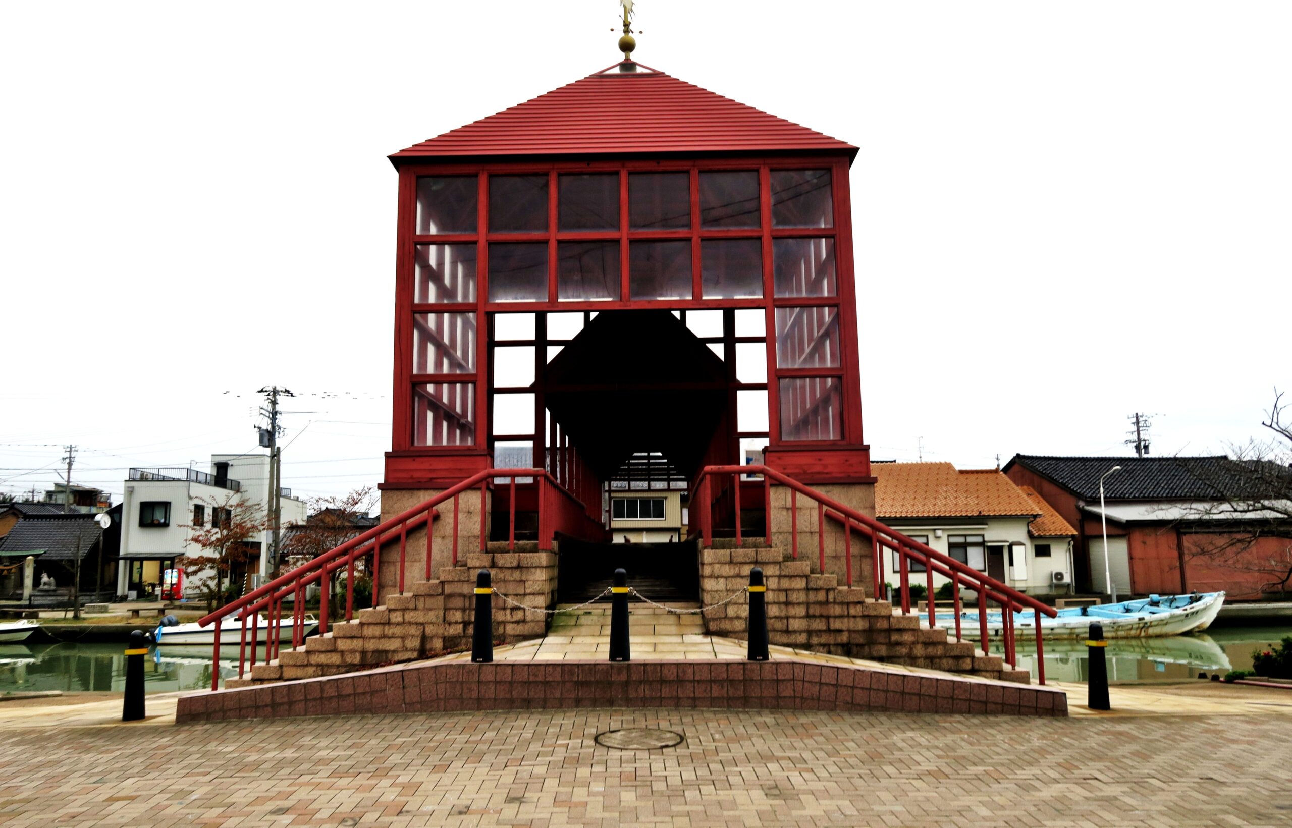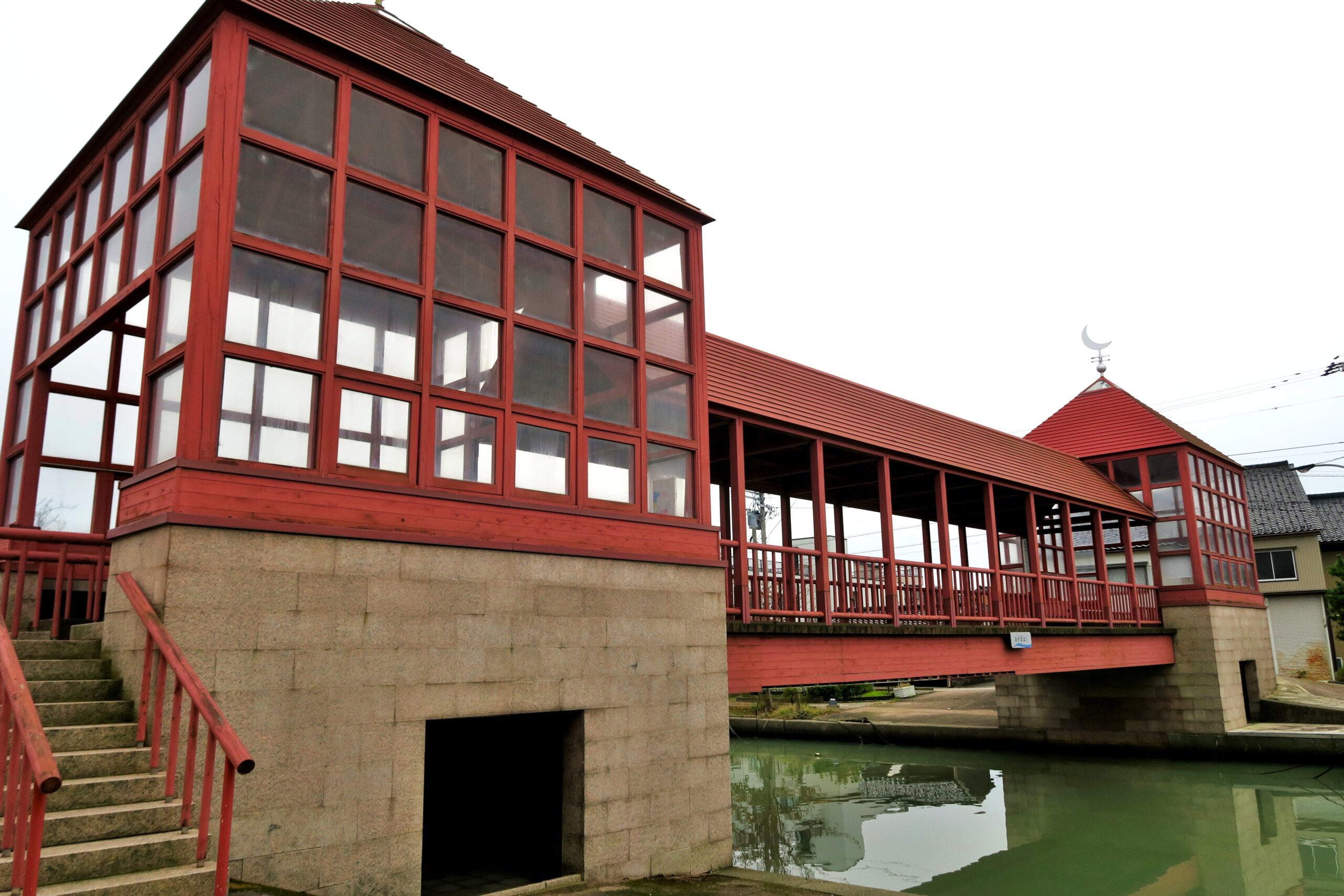 内川には個性的な橋がいくつも架かっていて、12の橋を巡る遊覧船も海王丸パークから就航しています。川の駅 新湊との間を50分で遊覧するコースです。写真はスペインの建築家セザール・ポルテラがデザインした「東橋」。日本では珍しい赤い切妻屋根のある橋で異国情緒が漂います。