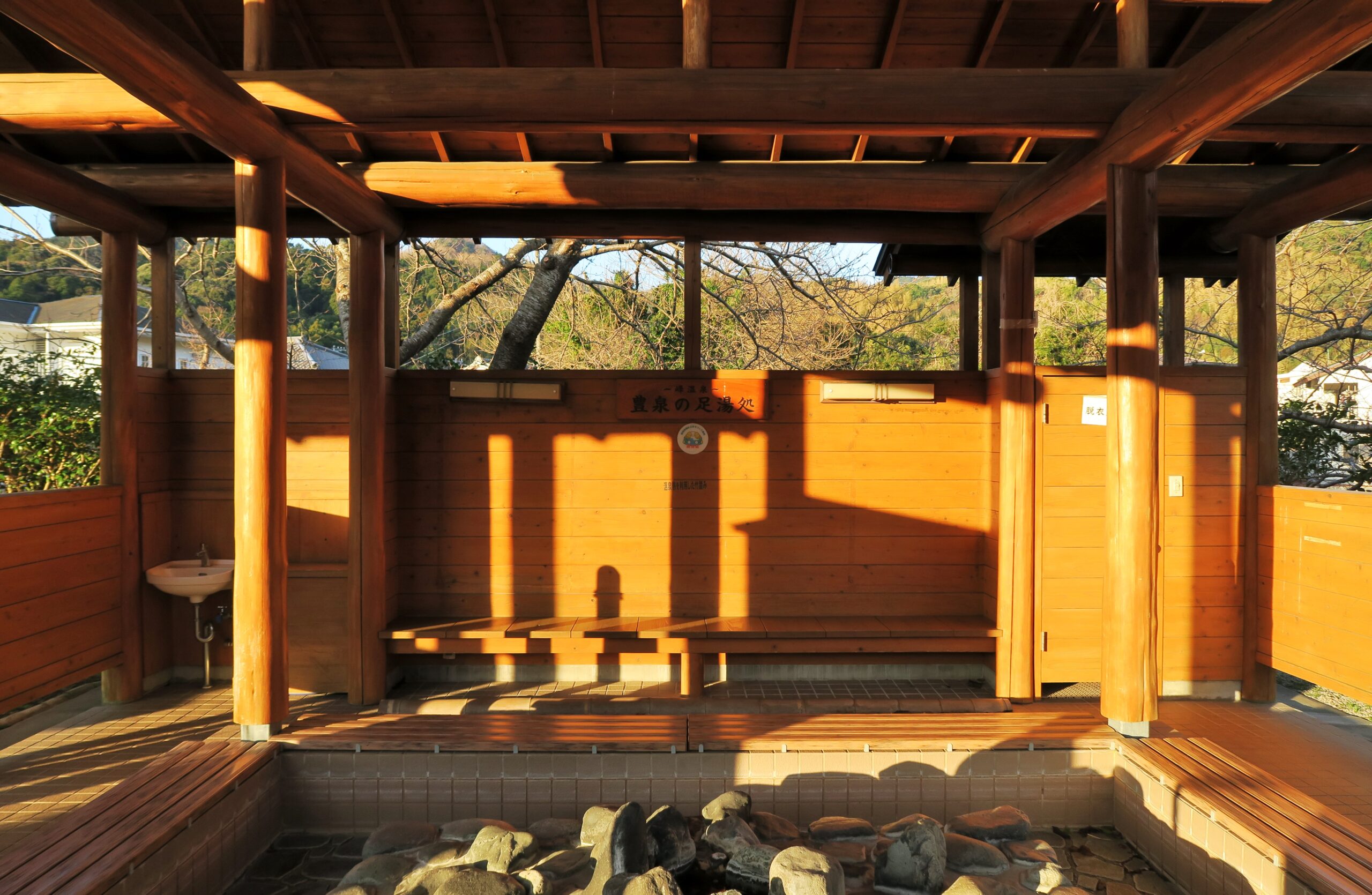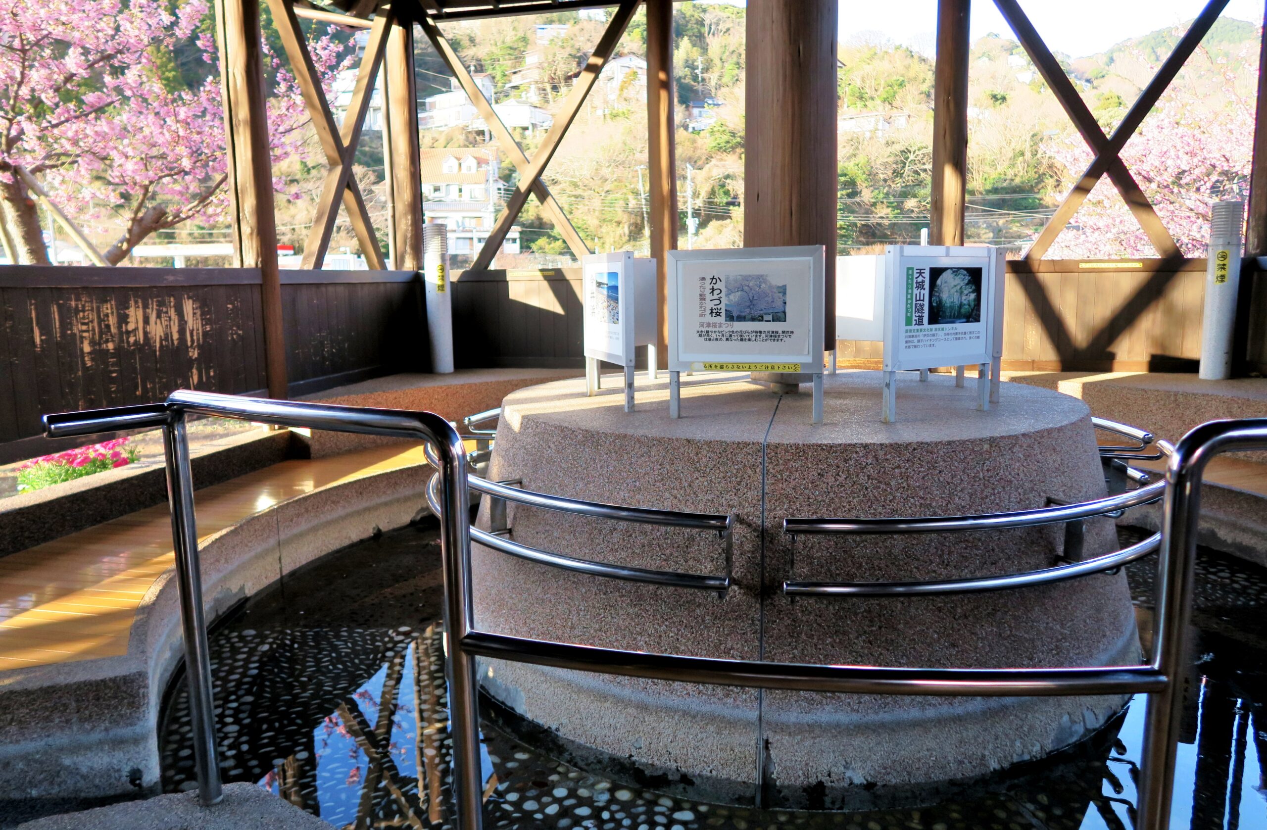 花見散歩の折り返しにひと休みにもってこいの日帰り入浴施設「踊り子温泉会館」、その近くに「豊泉の足湯処」があります。峰温泉の河津川堤にあり、夜桜ライトアップ(18時~21時半)が行われる桜並木に近く、また目の前からは河川敷に下りやすくなっています。