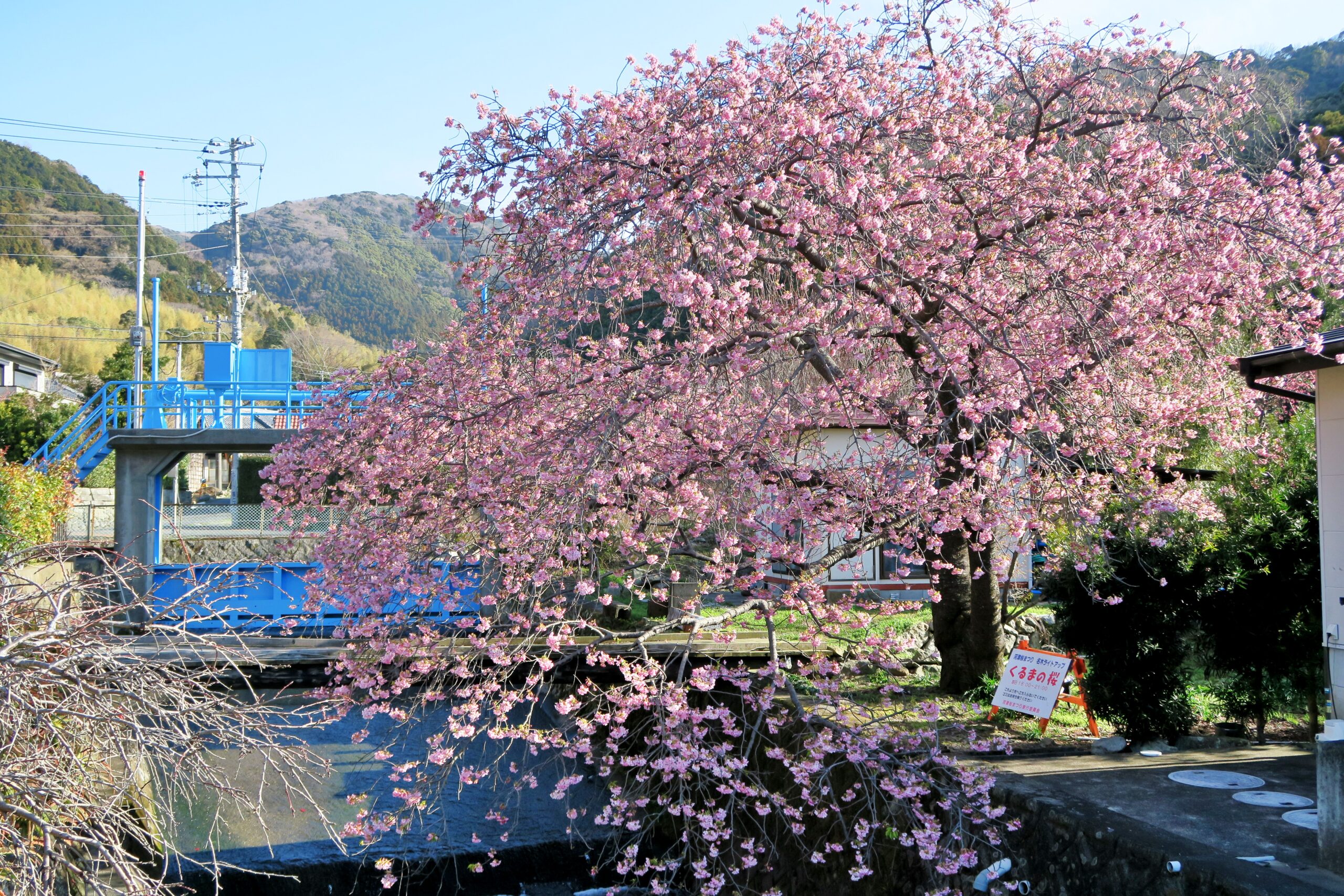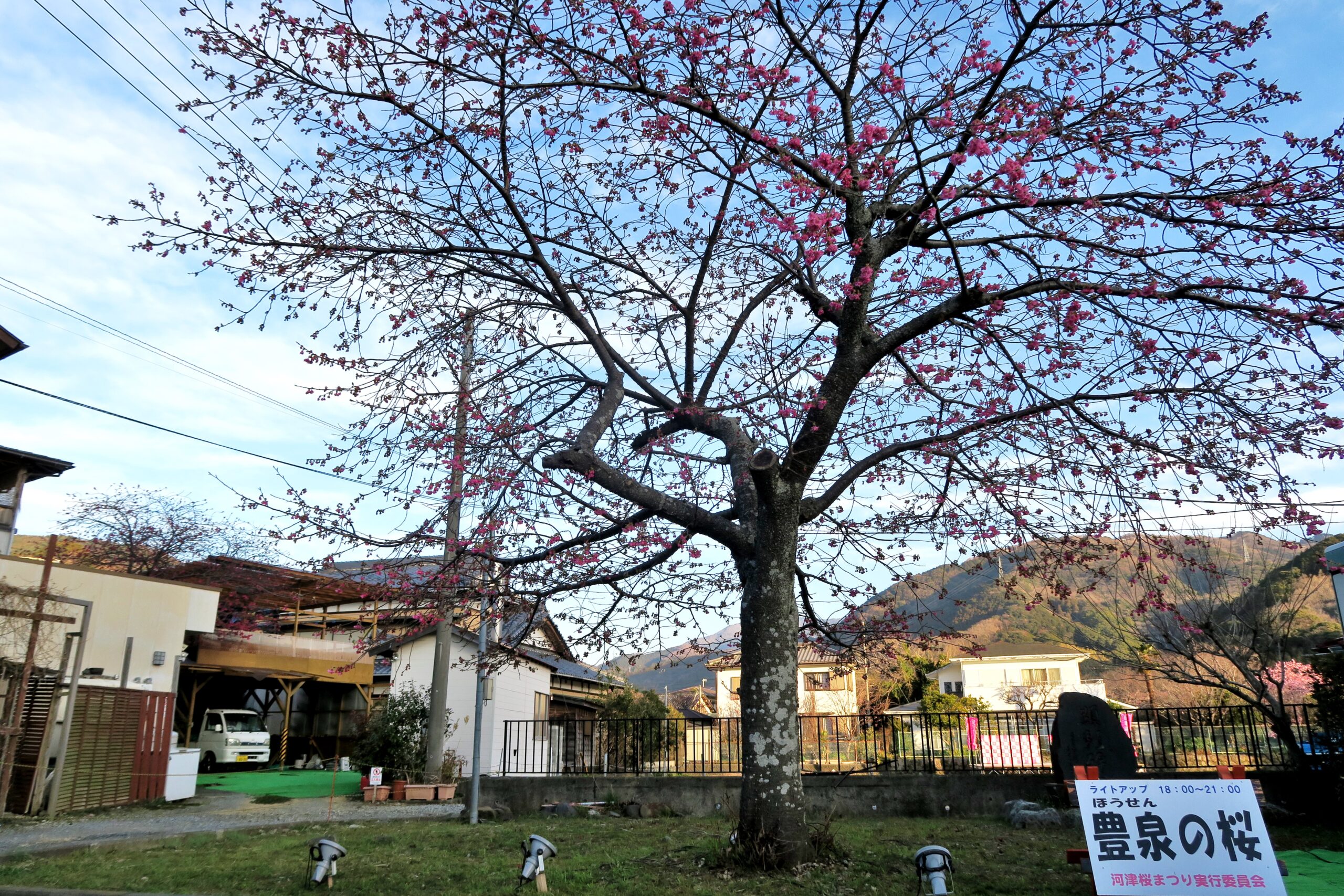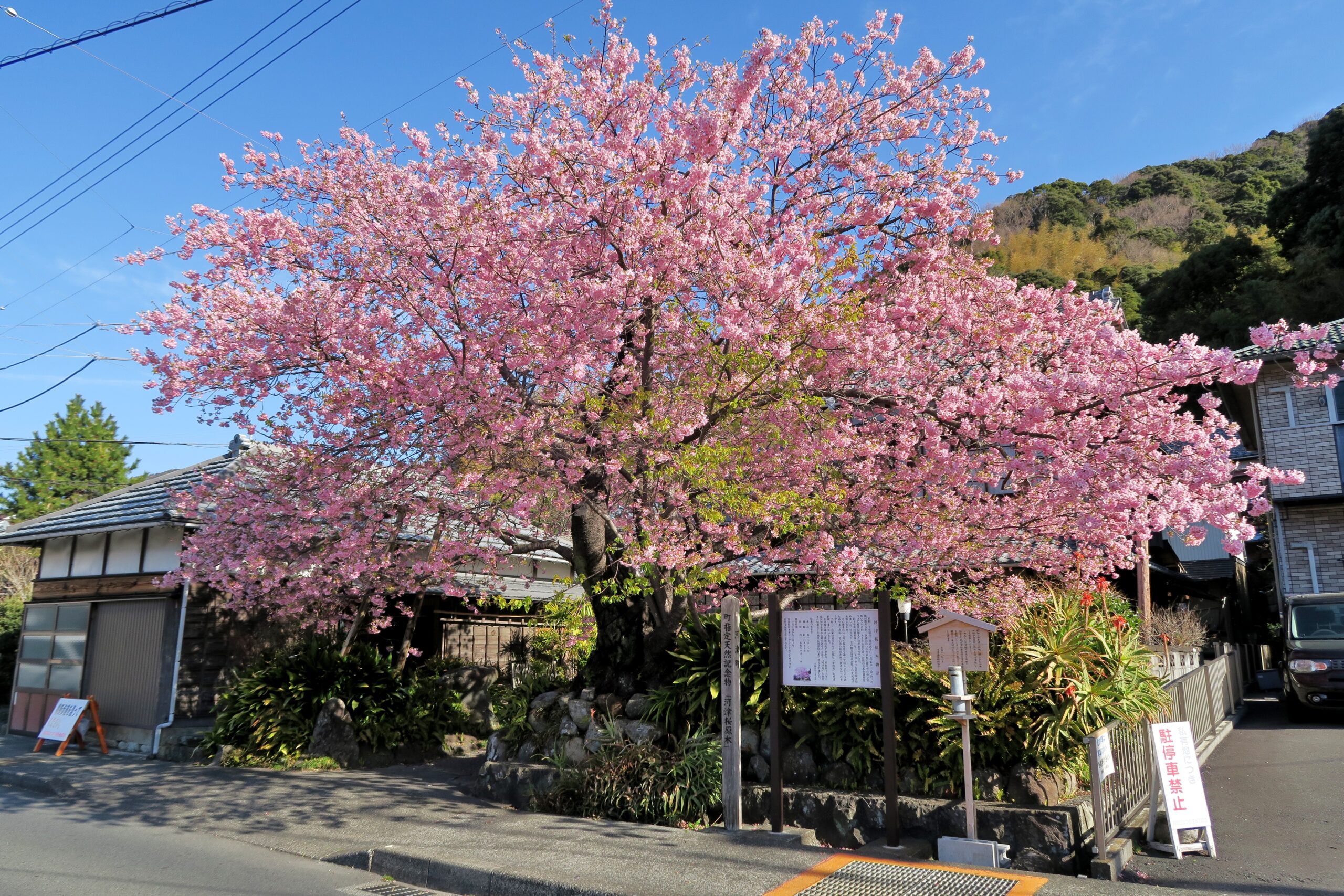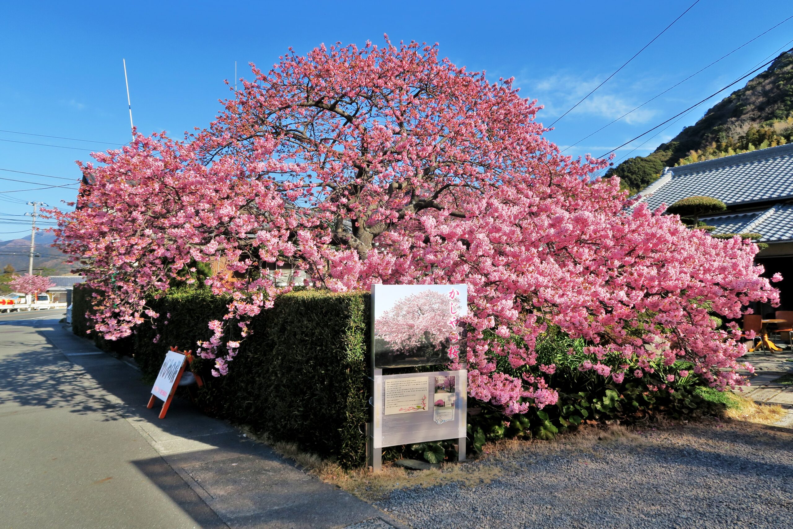 さらに河津町役場近くの「河津桜原木」も必見です。河津桜並木のマザーツリーともいえる原木は早咲きのオオシマザクラ系とピンクのヒガンザクラ系の自然交配種といわれるもので、樹齢約60年、樹高約10mです。昭和30年(1955)頃の2月、河津町田中の飯田勝美さんが河津川沿いの冬枯れの雑草の中に芽吹いていた桜の苗を偶然見つけ、現在地の庭先に植えたのがこの原木です。この木から後に川岸などへの植栽が進められ、河津桜の輪が広がっていったと思うと感慨深いものがあります。