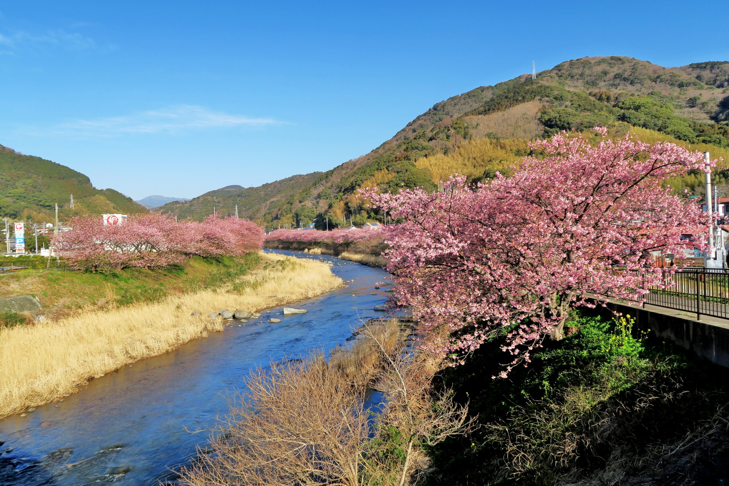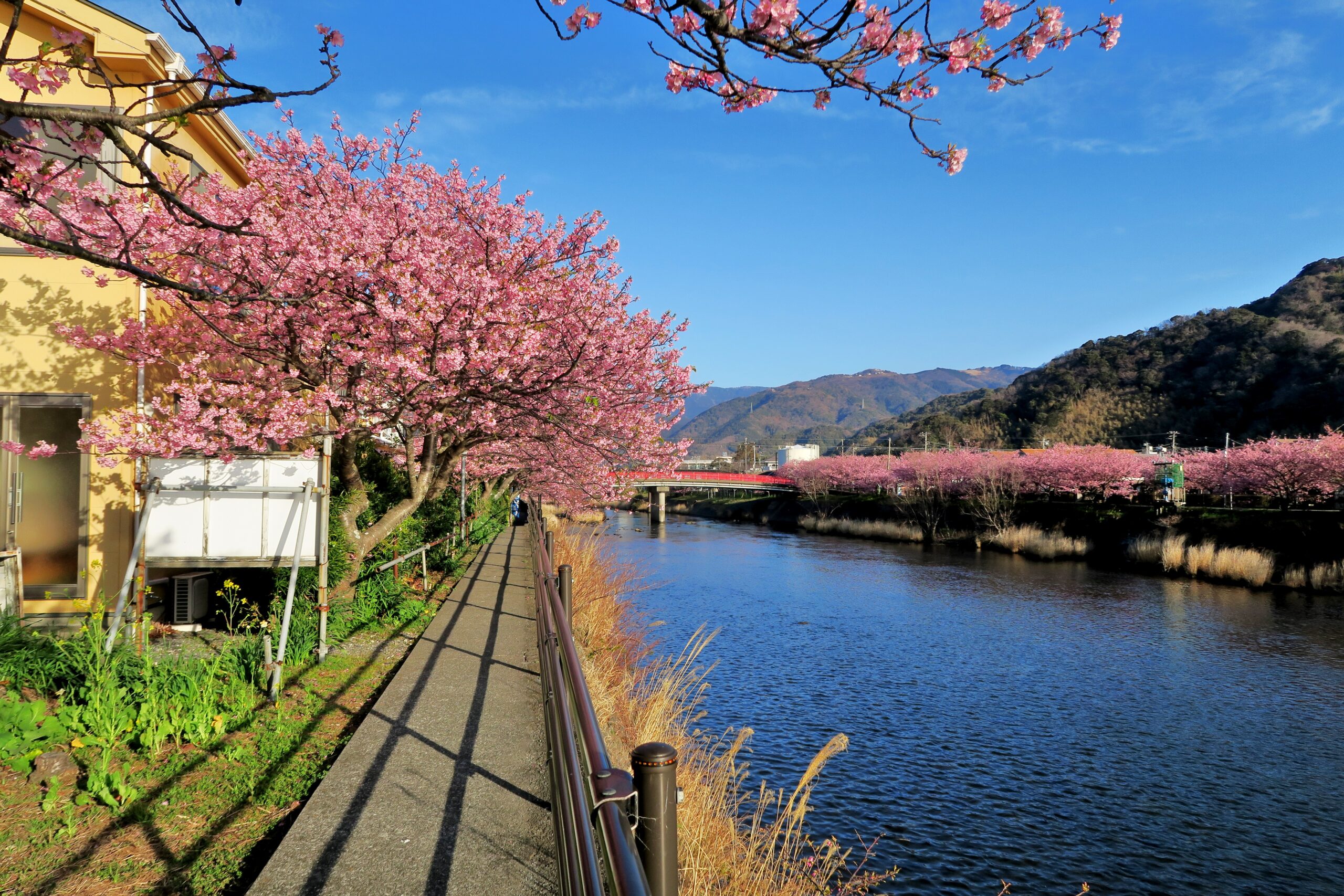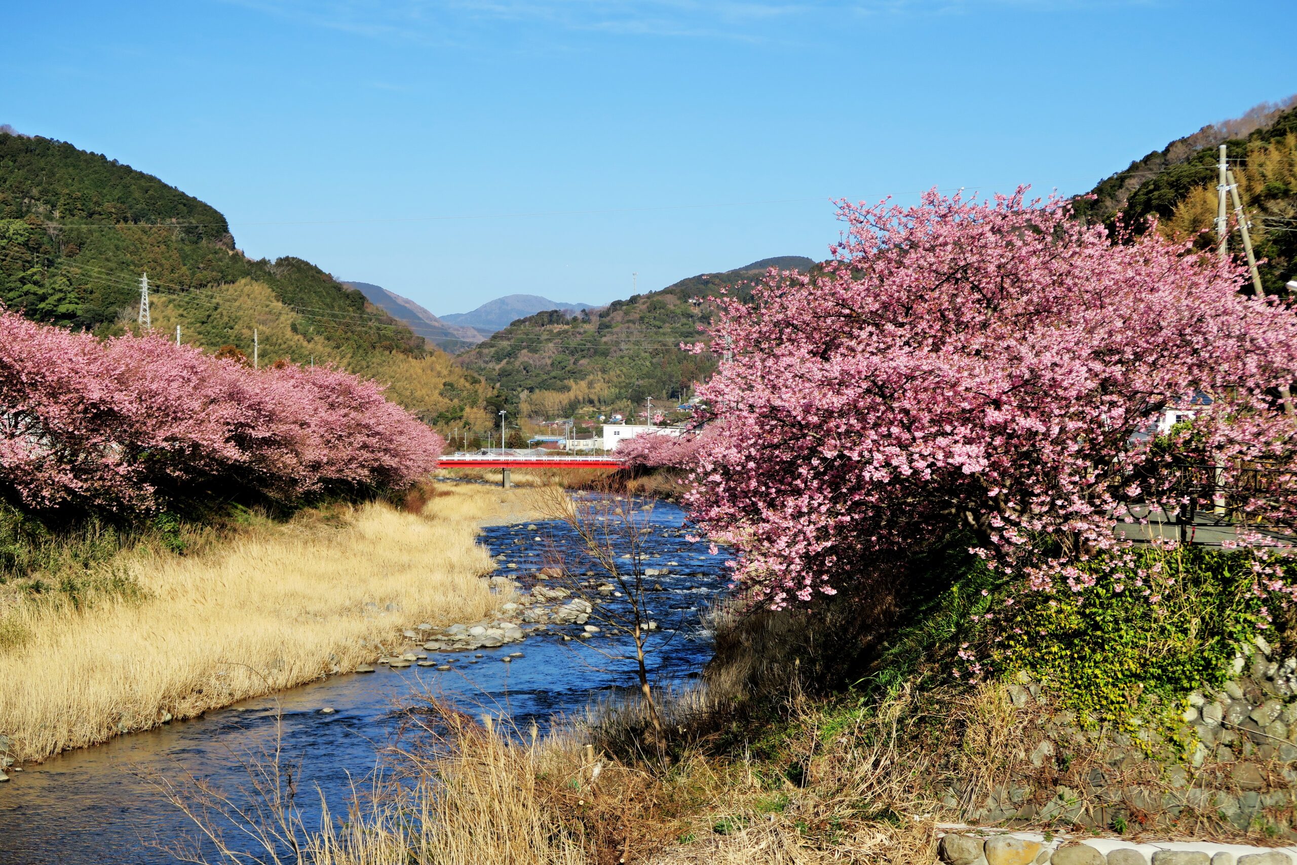 海沿いののどかな町伊豆“河津”で、川岸を埋め尽くすように咲く早咲きの“河津桜”を楽しむ平成3年から始まった「河津桜まつり」は、例年2月10日前後から3月10日前後まで開催されます。桜まつりの早春、河津町では河津川河口から約4kmにわたって約800本の河津桜の並木が続き、川岸の遊歩道を歩けば、頭上を覆う桜のトンネルが壮観です。この時期河津川沿いを中心に町が河津桜のピンクに染まり、露店が軒を連ね、花見客でこの小さな町は大いに活気づきます。