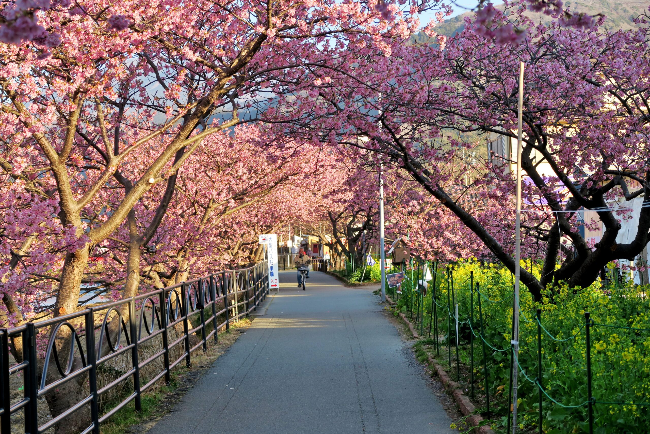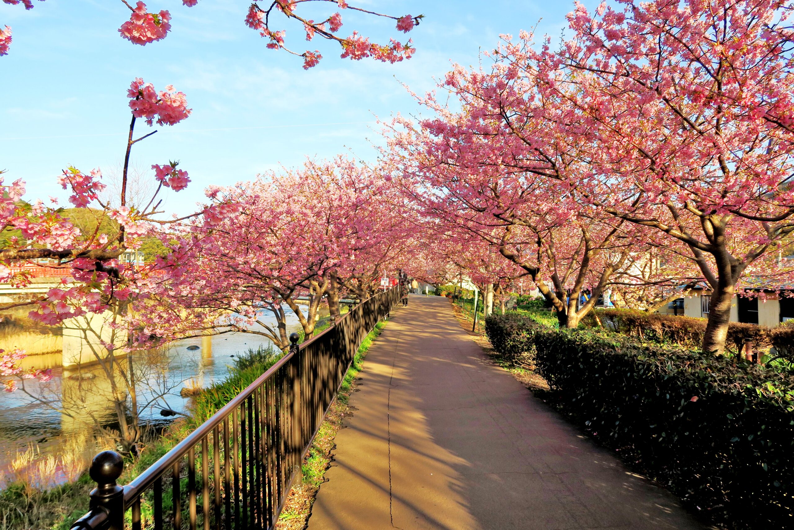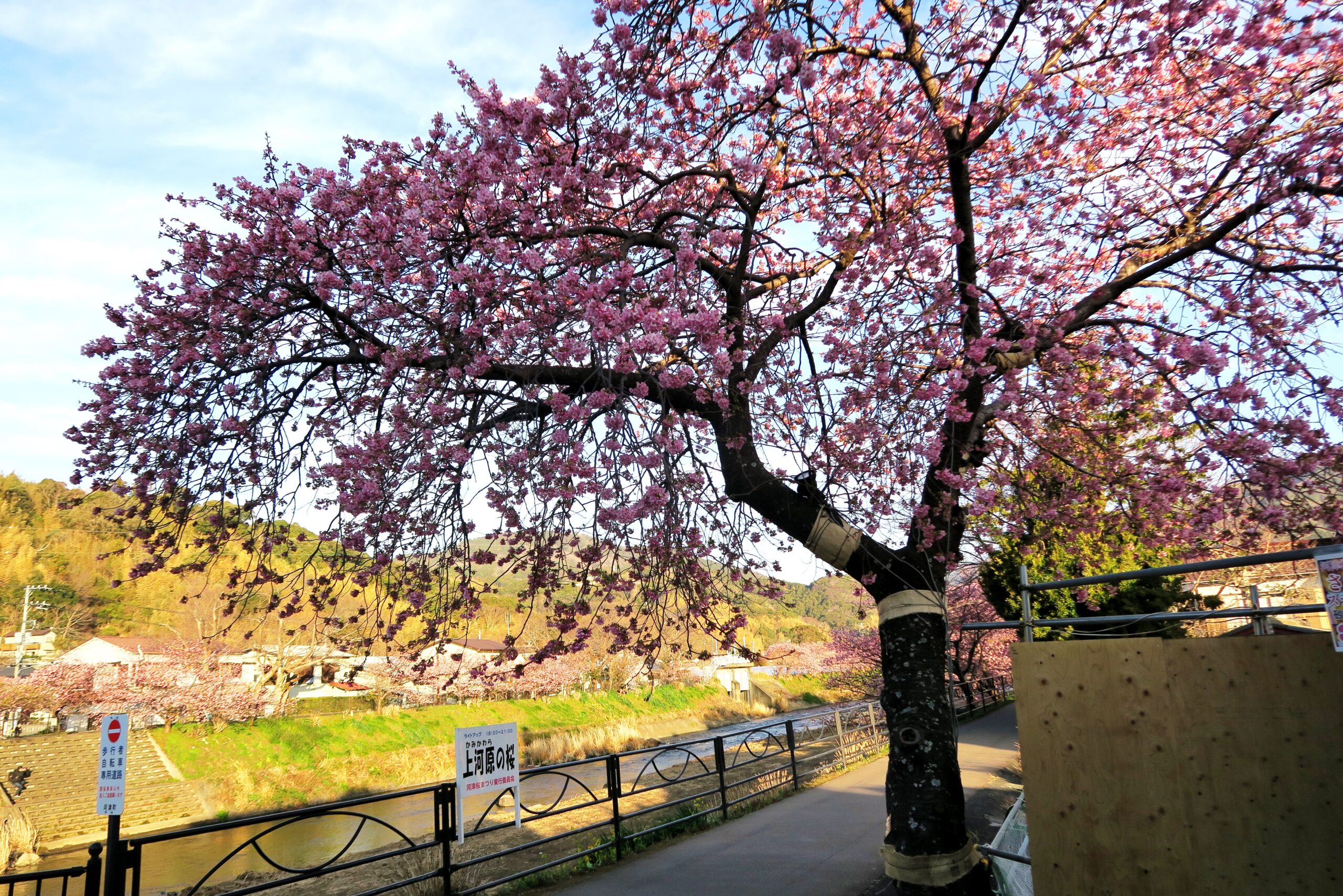 海沿いののどかな町伊豆“河津”で、川岸を埋め尽くすように咲く早咲きの“河津桜”を楽しむ平成3年から始まった「河津桜まつり」は、例年2月10日前後から3月10日前後まで開催されます。桜まつりの早春、河津町では河津川河口から約4kmにわたって約800本の河津桜の並木が続き、川岸の遊歩道を歩けば、頭上を覆う桜のトンネルが壮観です。この時期河津川沿いを中心に町が河津桜のピンクに染まり、露店が軒を連ね、花見客でこの小さな町は大いに活気づきます。