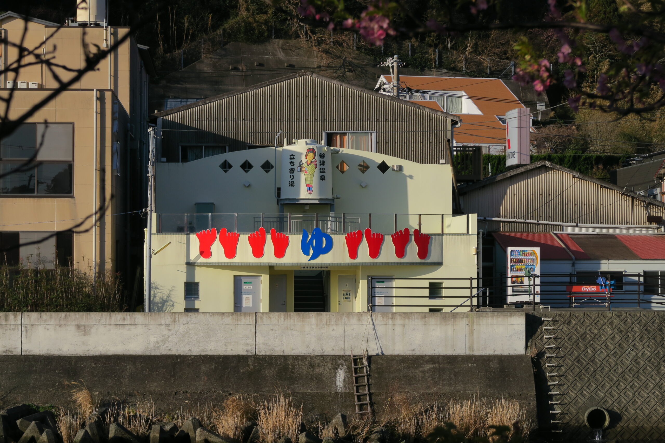 赤い足形が並ぶ真ん中に青い“ゆ”の文字が目を引きます。谷津温泉と書かれた建物の2階に上がって座ると、右を見れば河津浜、左を見れば桜並木の眺めに、身も心も疲れた足も癒されます。河津三郎祐泰は曾我兄弟の仇討ちで知られる曾我祐成・時到の父です。