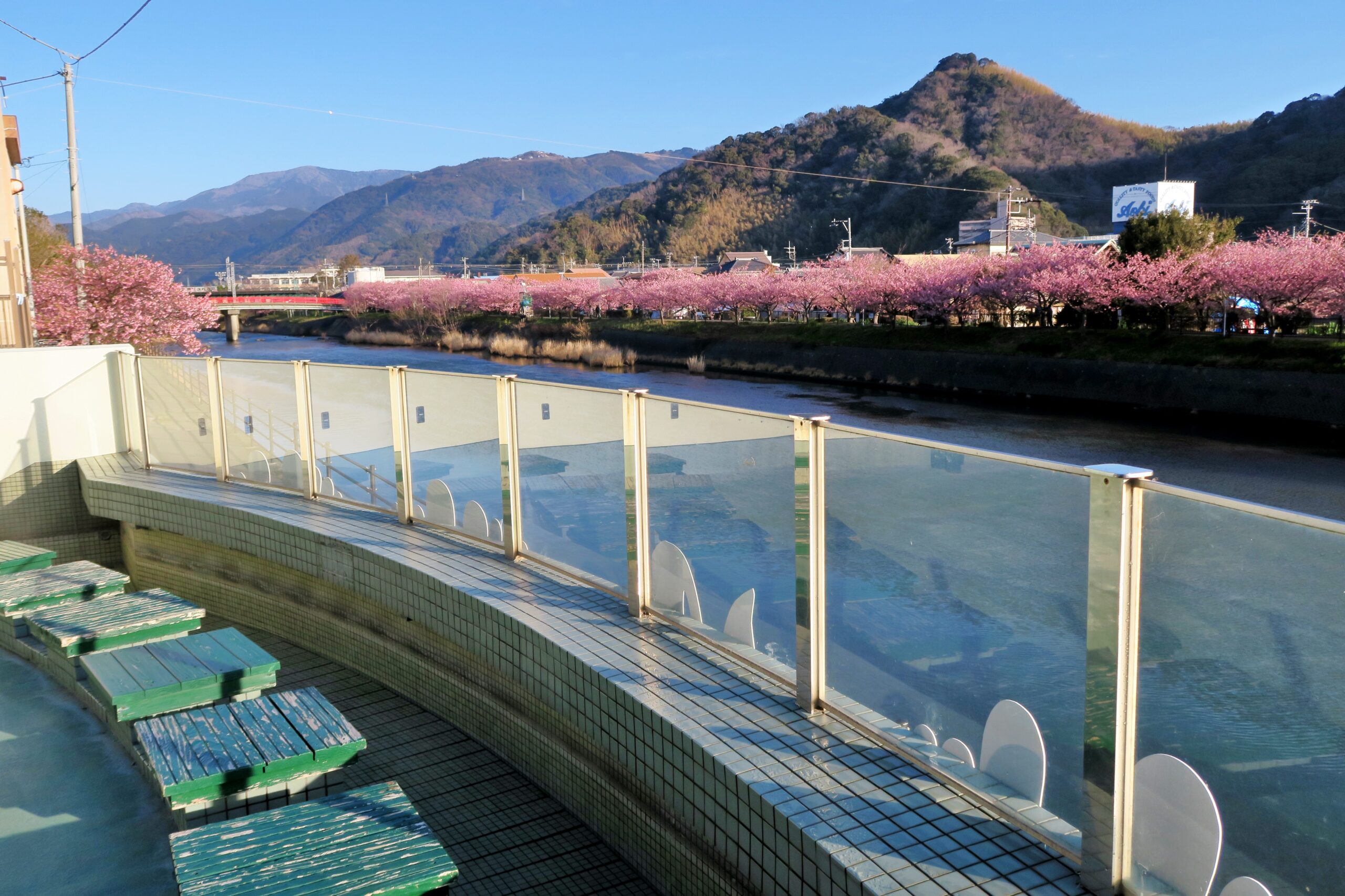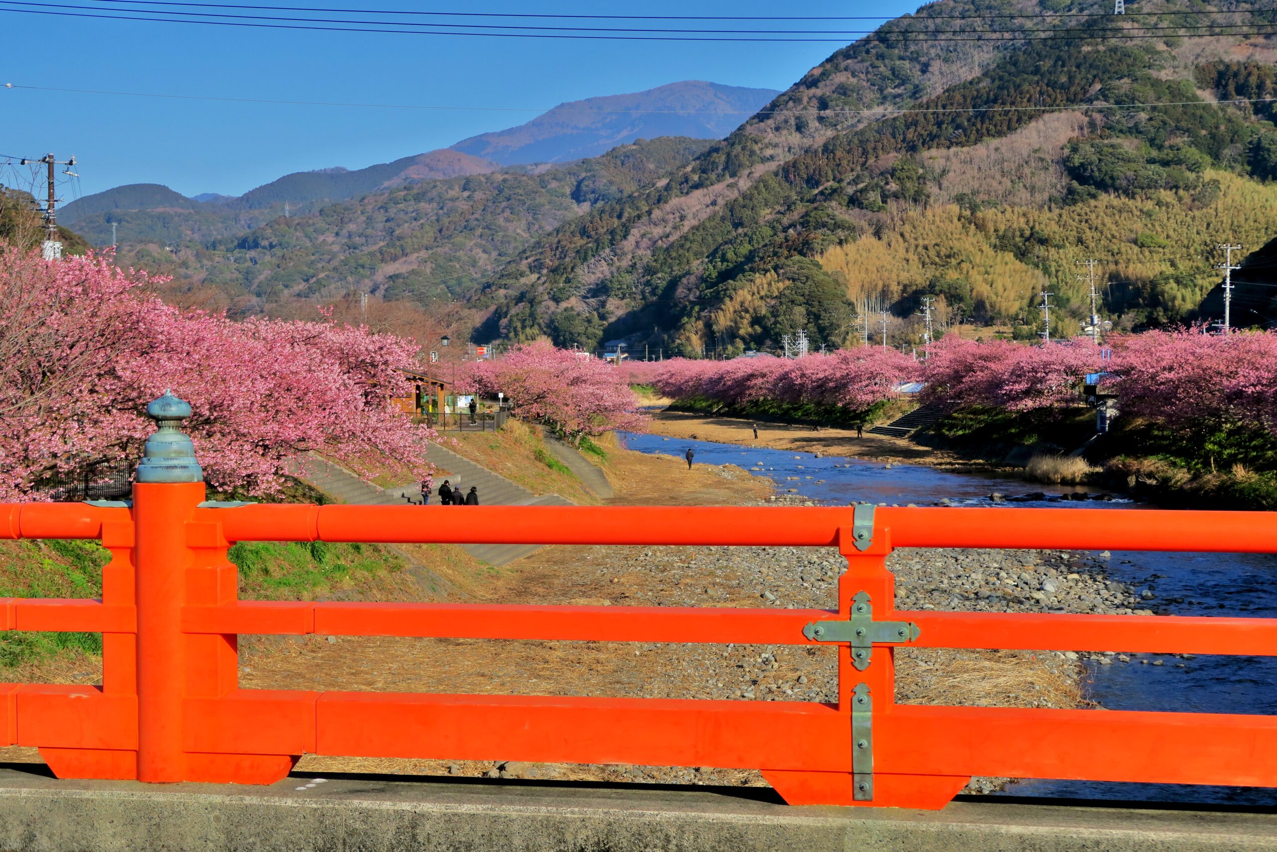 オレンジ色の豊泉橋から上流を眺めると、川と青い空にソメイヨシノの淡いピンクと違い、やや鮮やかな色あい、淡麗というよりは華美という感じの河津桜の桜並木という美しい風景が一望できます。所々にある川岸の階段を下りてみると、水辺から眺める桜も一味違う風情があります。