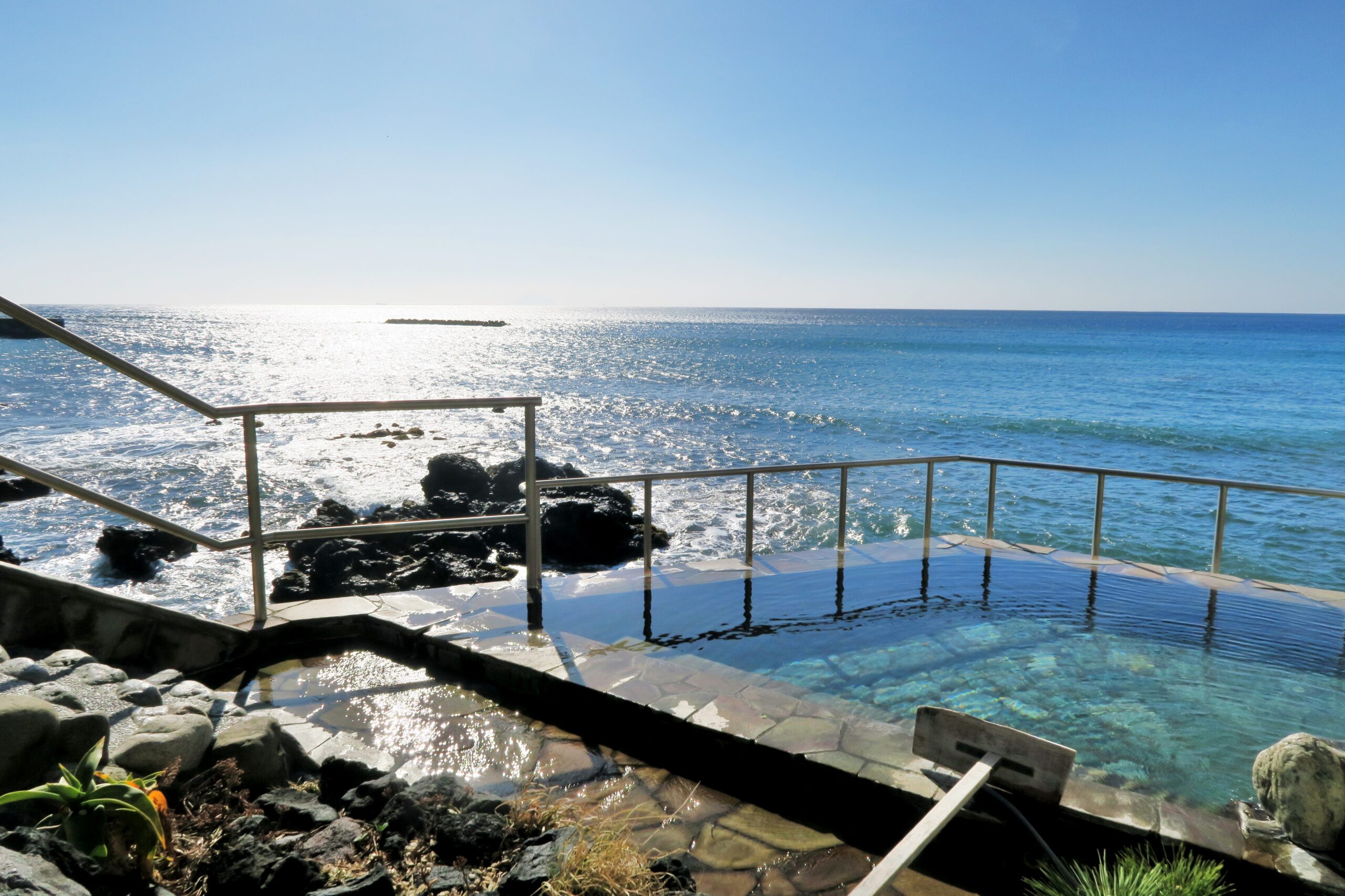 男湯の引き戸を開けるとシンプルな脱衣場があり、その先にキラキラと輝く大海原の水平線が広がります。波飛沫が湯船に届きそうなほどに、まさしく海と一体化しているような解放感のある絶景露天風呂です。今井浜温泉は峰温泉と谷津温泉からの引き湯の源泉掛け流しで、源泉温度が高く、弱アルカリ性の塩化物泉はクセがなくあっさりとしたお湯です。遮るものを最小限に抑えた湯船から見える青い空とどこまでも続く大海原の絶景は時のたつのを忘れるぐらい酔いしれながらお風呂に入ることになります。岩に当たって砕け散る波音を聞きながらリラックスできます。