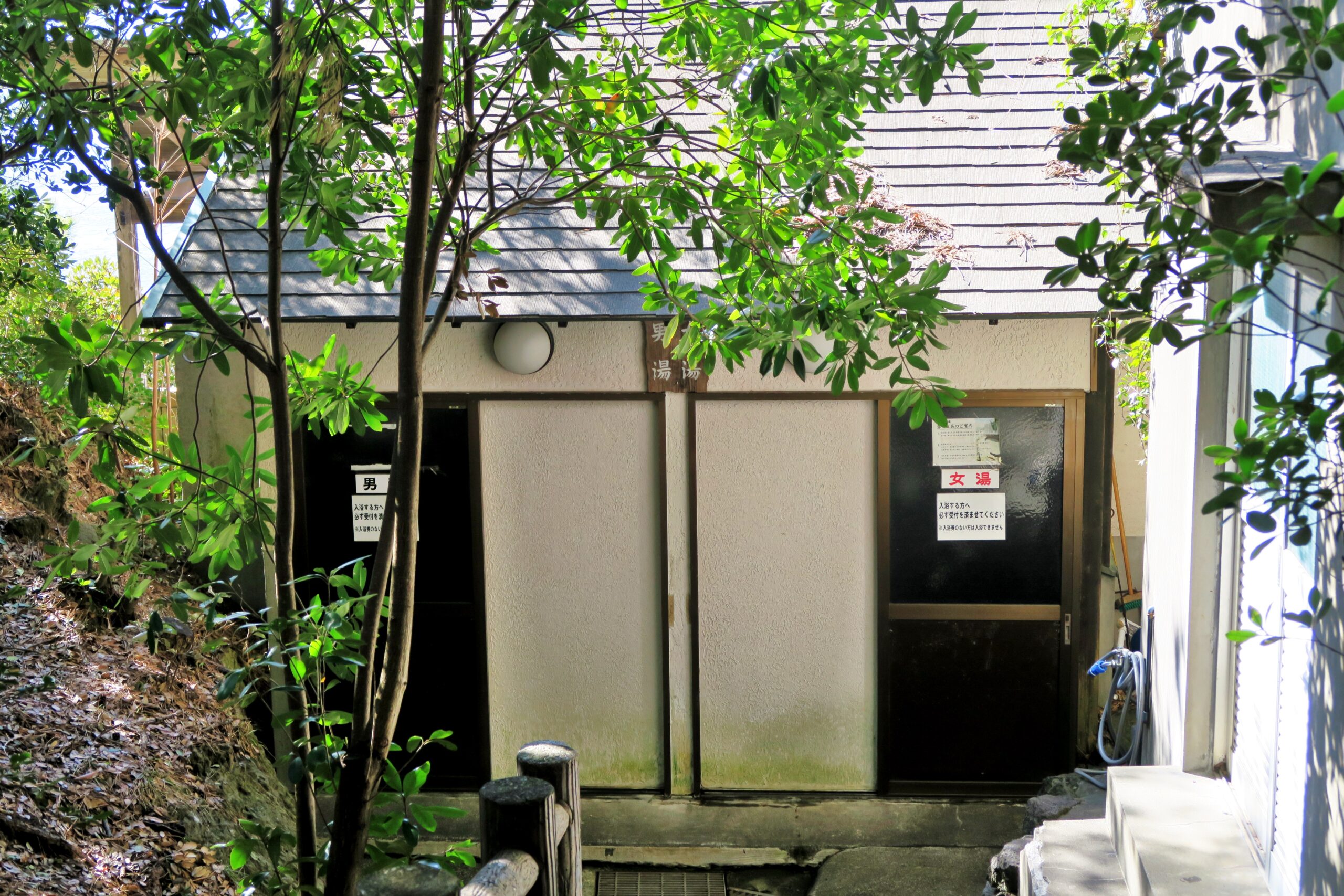ここから足の疲れを癒しに温泉に向かいます。国道135号沿い、河津浜海岸の浜区無料駐車場を過ぎ河津浜トンネルを越えると今井浜です。伊豆急なら一駅の「今井浜海岸駅」から徒歩5分の距離にあるのが「舟戸の番屋」です。廃業した今井浜温泉の日帰り温泉施設「サンシップ今井浜」の跡地に新築された海が目の前の体験型総合観光施設です。サザエや伊勢海老などの生簀があり、海鮮バーベキューを楽しめる食事処が有名ですが、ワカメなどの海産物に地元の農産物の直売所もあり、干物や塩つくりの体験教室もあります。目的の露天風呂を利用するには、番屋建物の入口を入ったところで格安料金入浴料300円を払い入口から一旦外に出ます。露天風呂は建物から150mほど離れた崖の上にあるので、右手階段を登って下った所、木立の中に湯屋が見えます。