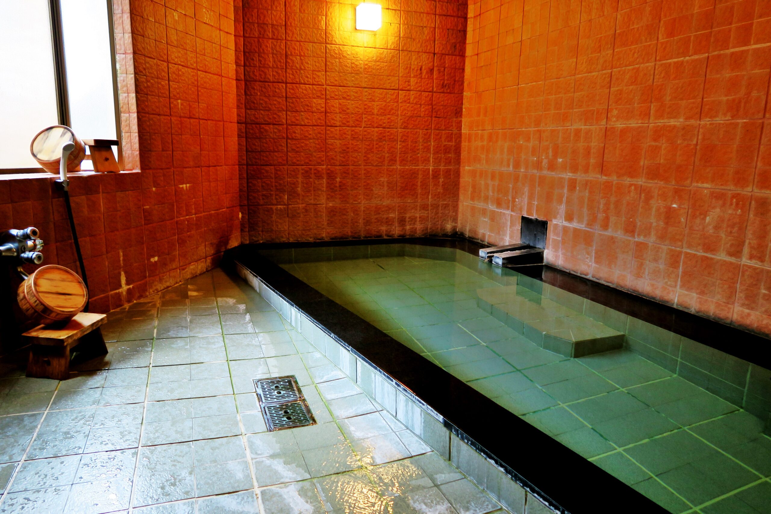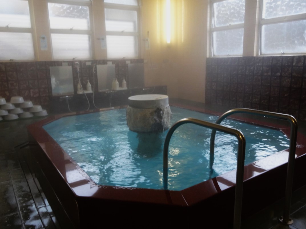 男女別の内湯のタイル貼りの浴槽には無色・無臭で透明な単純アルカリ温泉がコンコンと湯船にそそがれまさしく絹のように肌をつつみます。(階段したの共同浴場「御前湯」よりも適温で肌をつつむ感覚もより滑らかです。