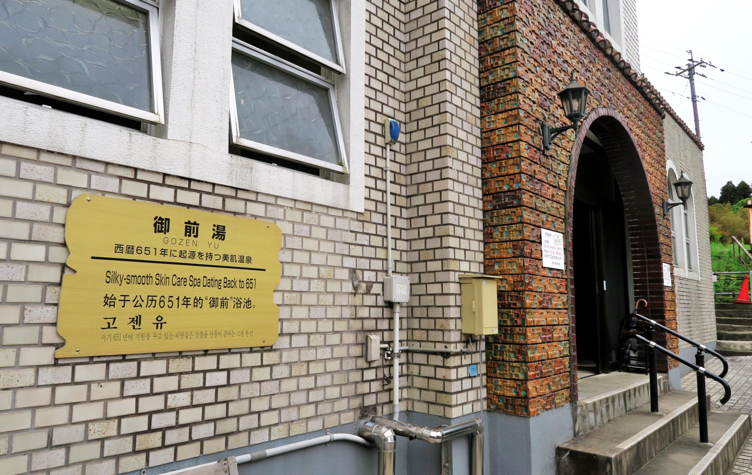 有福温泉の3つの共同浴場「御前湯」「さつき湯」「やよい湯」の中で一番大きな浴場が「御前湯」です。温泉街の中央、赤茶色をした石州瓦の家々の中に、レンガを取り入れた洋風館のレトロな2階建ての建物が見えます。かつて「一等湯」とも呼ばれた有福を代表する外湯・御前湯です。昭和5年(1930)に建てられた薬師堂の前にある大正ロマンを漂わせるレトロ調の建物で、電話ボックスほどの趣のある円柱状の番台を通り浴室に入ります。