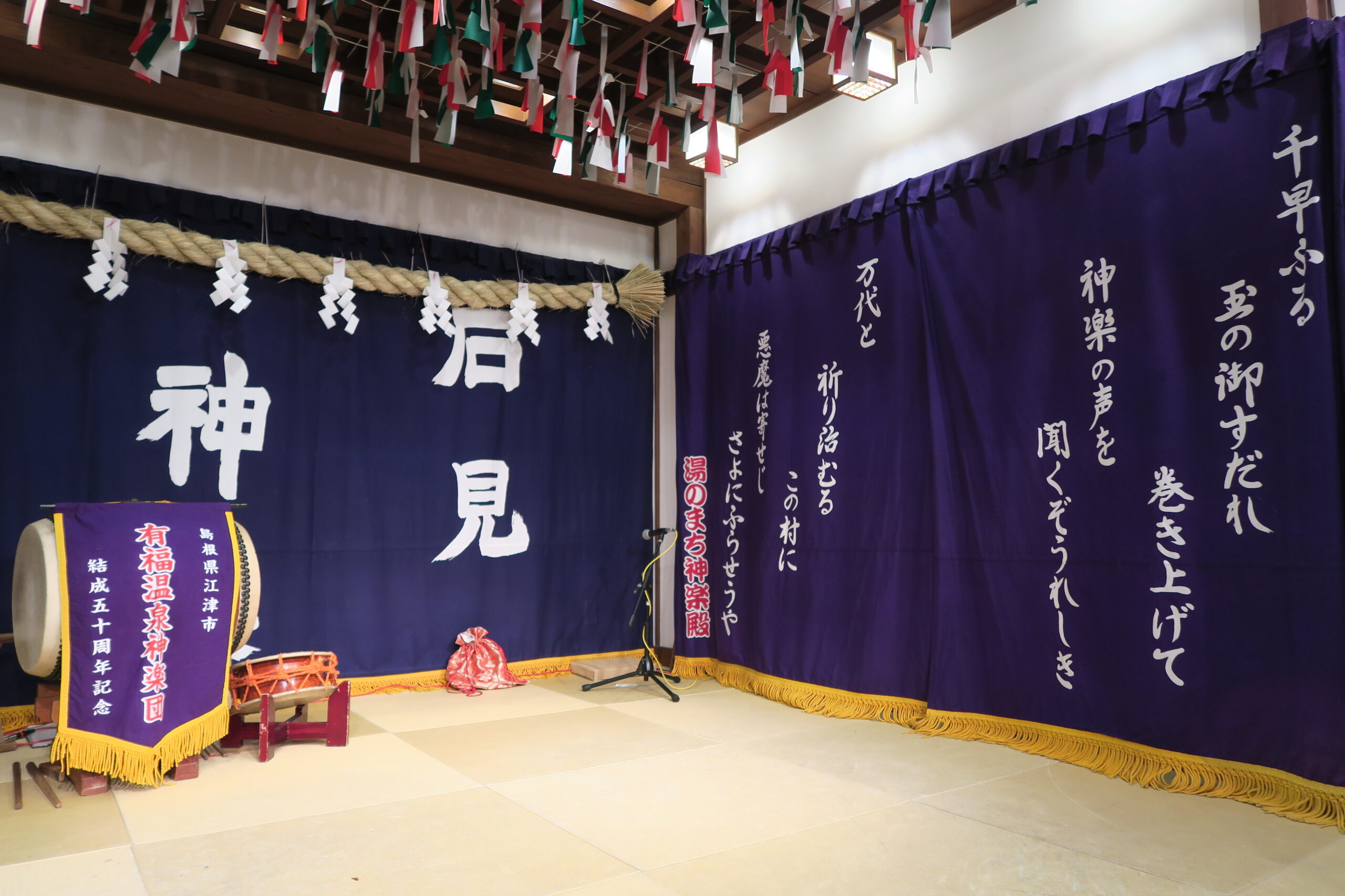 ここ有福温泉の「湯の町神楽殿」では月に数回(土曜日のみ)20:30から地元・有福温泉神楽団による伝統芸能「石見神楽」が上演されています。雰囲気のある木造2階建ての一階に舞台があり、収容人員は30人です。客席と舞台に仕切りがなく、間近で臨場感あふれる神楽が体験できます。
