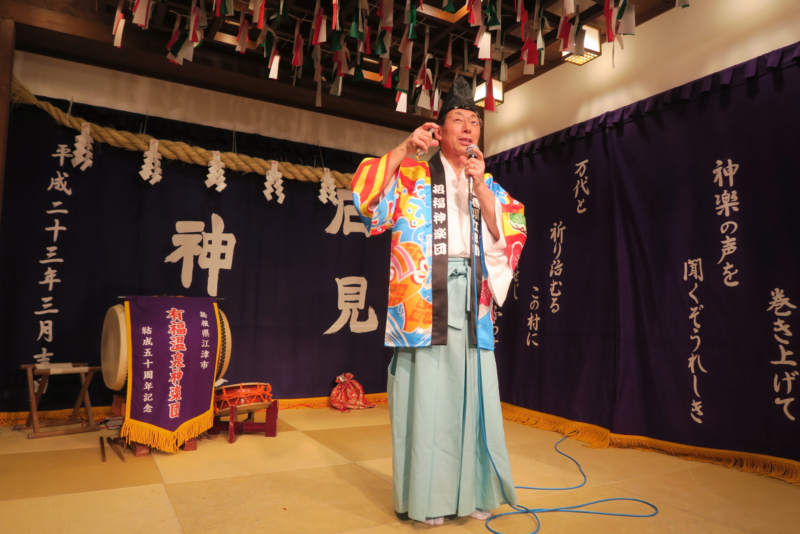 有福温泉神楽団の代表の方から、軽妙な最初の挨拶とともに演目の説明があります。初心者にもうれしい心遣いです。演目は人気がある2神2鬼の舞に歓声があがる「塵輪」と超有名な出雲神話「大蛇」です。そしてこの2演目の間にコミカルな動きが人気の神楽「恵比須」です。恵比須様が釣りを始めようと撒き餌ならぬ福飴を四方八方に撒くめでたい席での定番演目です。