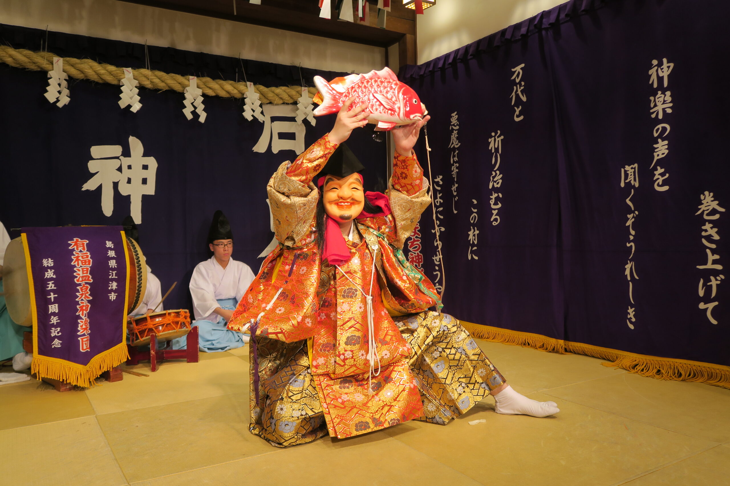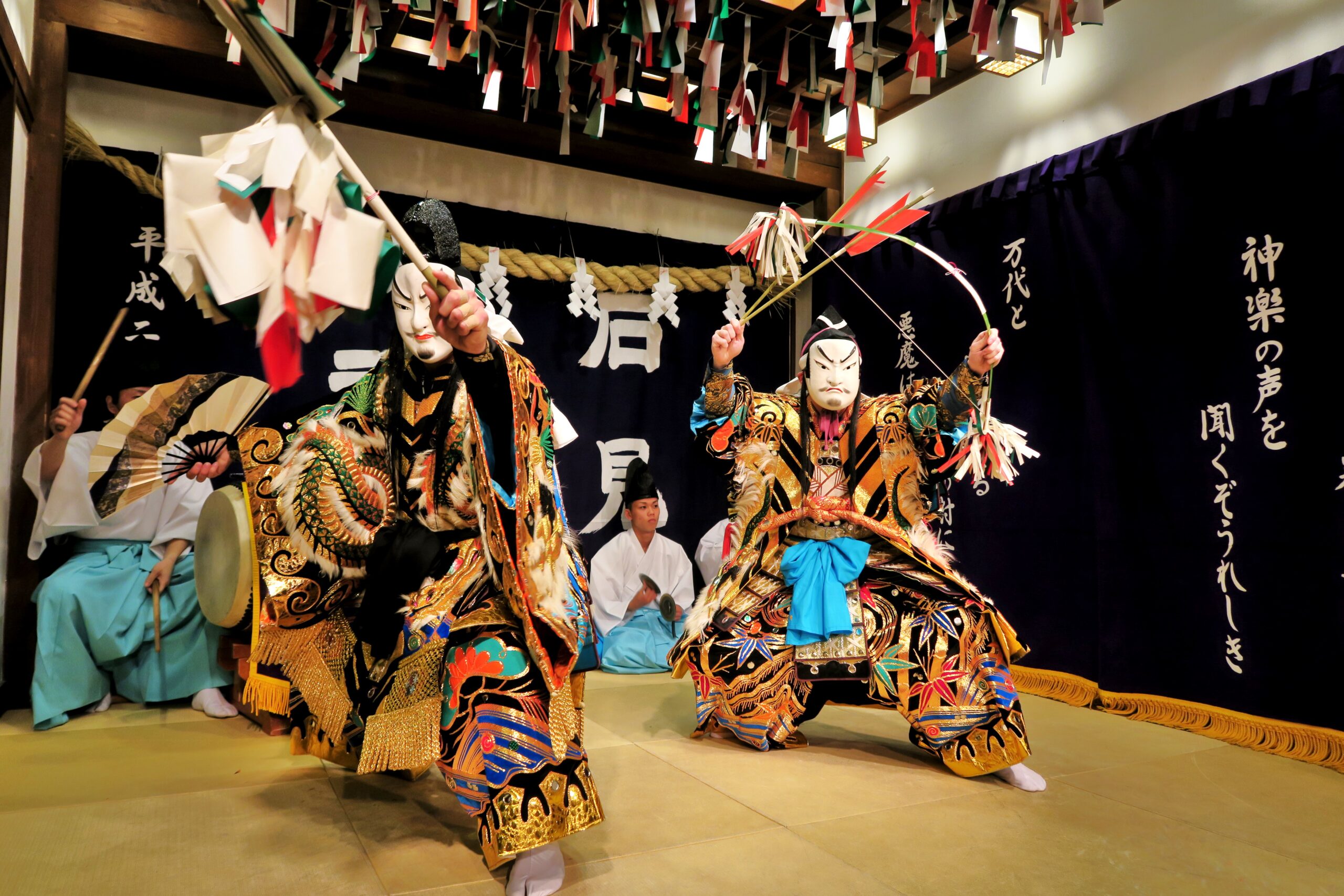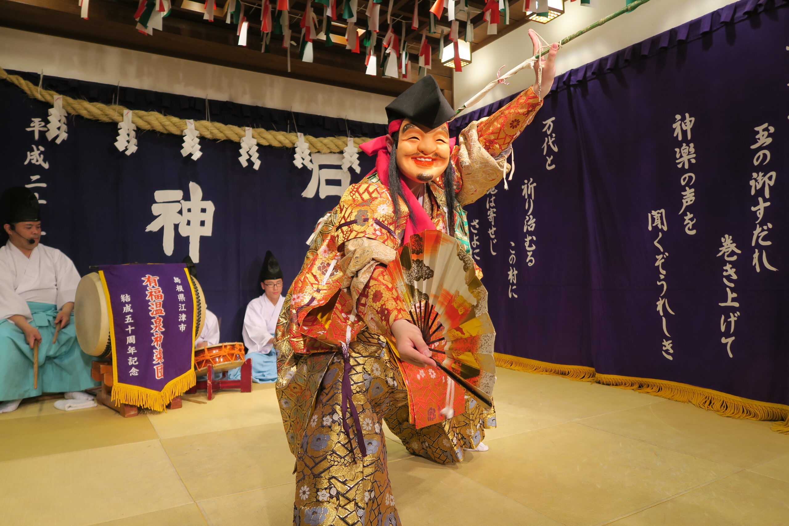湯の町神楽殿では毎週土曜日20:30から地元有福神楽団による伝統芸能「石見神楽」が上演されています。日本神話を題材に、独特の哀愁あふれる笛の音、活気溢れる太鼓囃子に合わせて、金糸銀糸を織り込んだ豪華絢爛な衣裳と表情豊かな面を身につけて舞う「石見神楽」は、島根県西部の石見地方に古くから伝わる伝統芸能です。その演目は古事記や日本書紀を題材にした「能舞」や神様をお迎えする「儀式舞」など約30種類にのぼり、受け継ぐ団体(社中)は現在130を超えます。