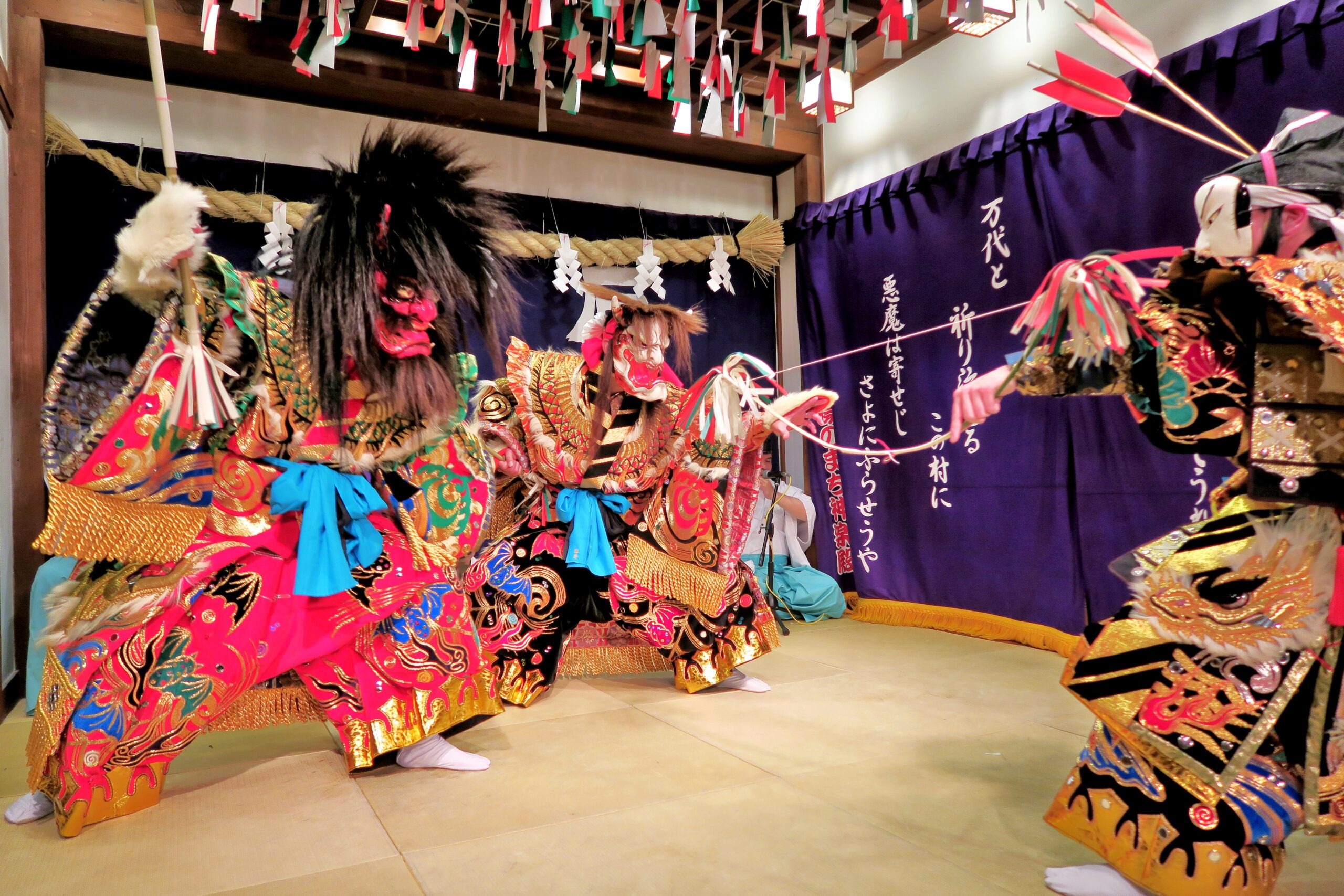 もうひとつの見どころは、八調子という軽快なリズムでお囃子が鳴り響く中、「アイサー」の掛け声とともに、白鬼と赤鬼が、“ざい”という鬼棒で地面をビシッと打ち鳴らすところ。軽快でスピーディーに舞う姿は迫力満点です。
