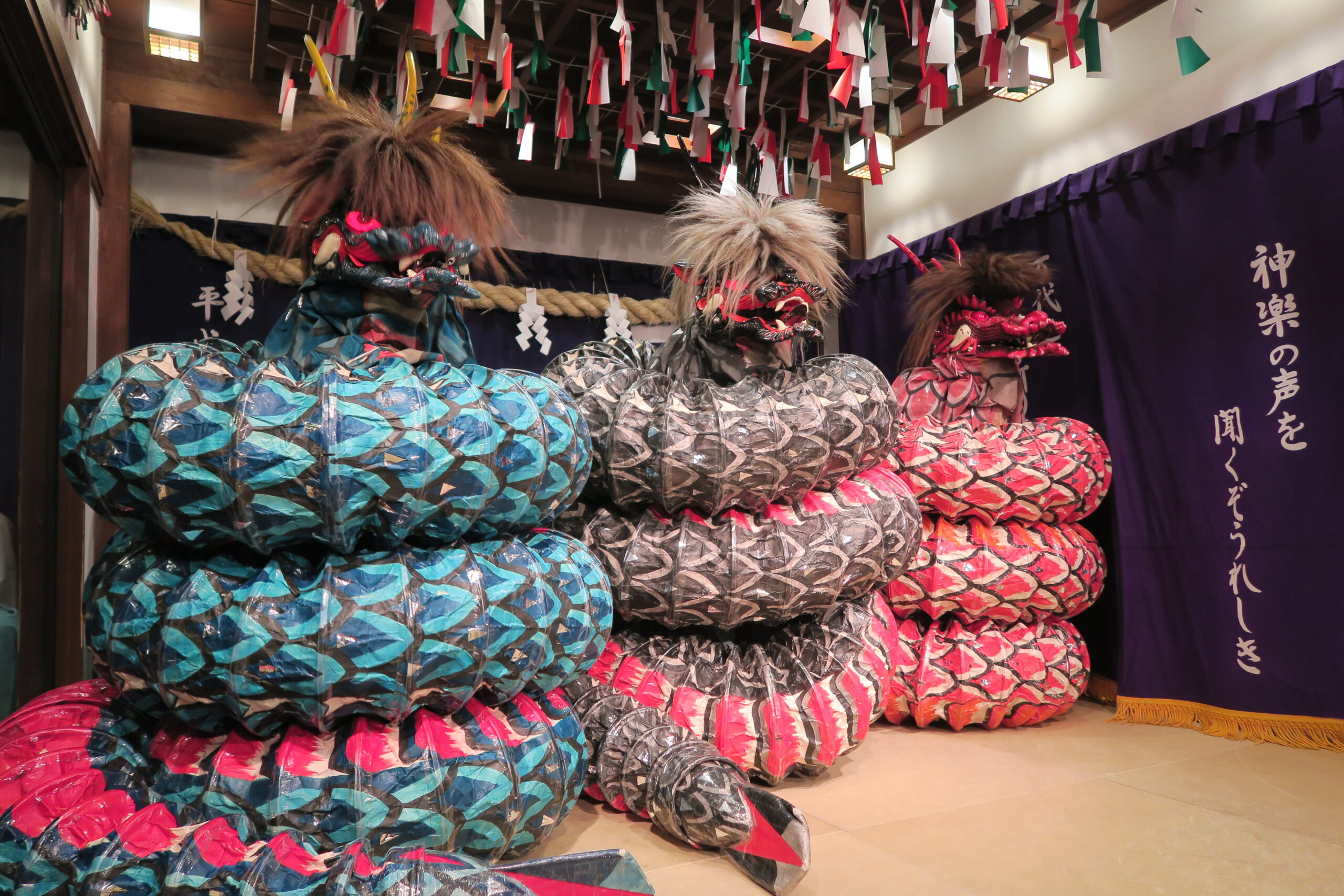 大蛇の舞にはかかせない「蛇胴」は、石見地方・浜田の地で提灯を参考に考案されました。骨組みには軽くて丈夫な1年間乾燥させた竹を使用し、特殊な糊で石州和紙を幾重にも貼り合わせています。長さは約17m、重さ12キロにもなり、提灯のように伸縮できるように折り目がついています。狭い舞台を所狭しと、とぐろを巻いたり、白煙を吐いたりする3匹の大蛇のリアルな動きに大注目です。